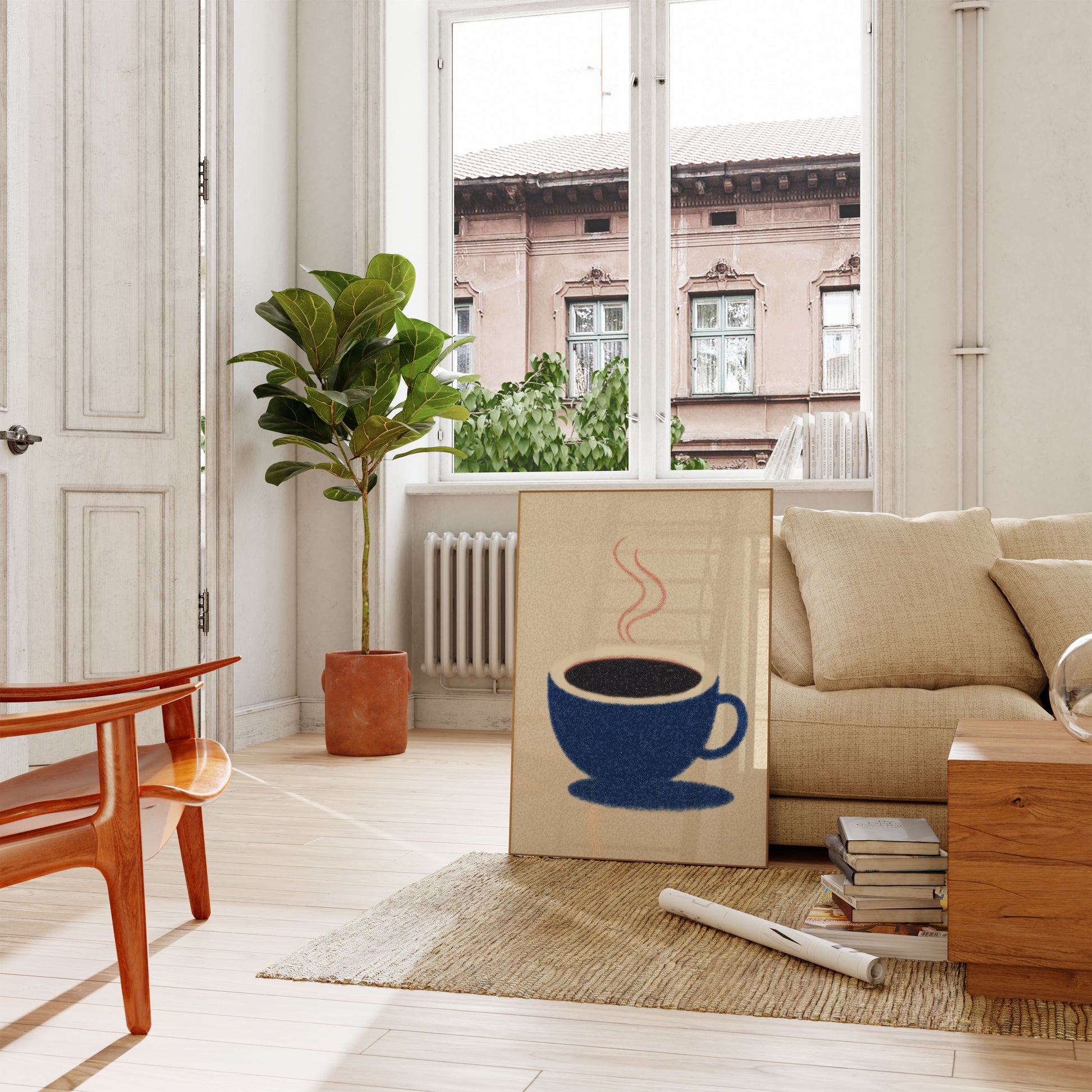 Immerse yourself in the warmth of a fresh morning brew with this minimalist coffee art print. Set against a soft, textured background, a deep blue coffee cup releases delicate pink steam, creating a simple yet captivating visual experience that celebrates the comforting ritual of your daily coffee.