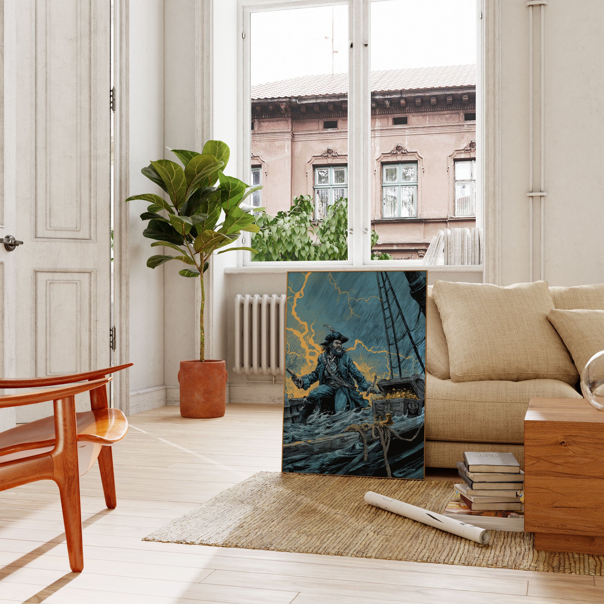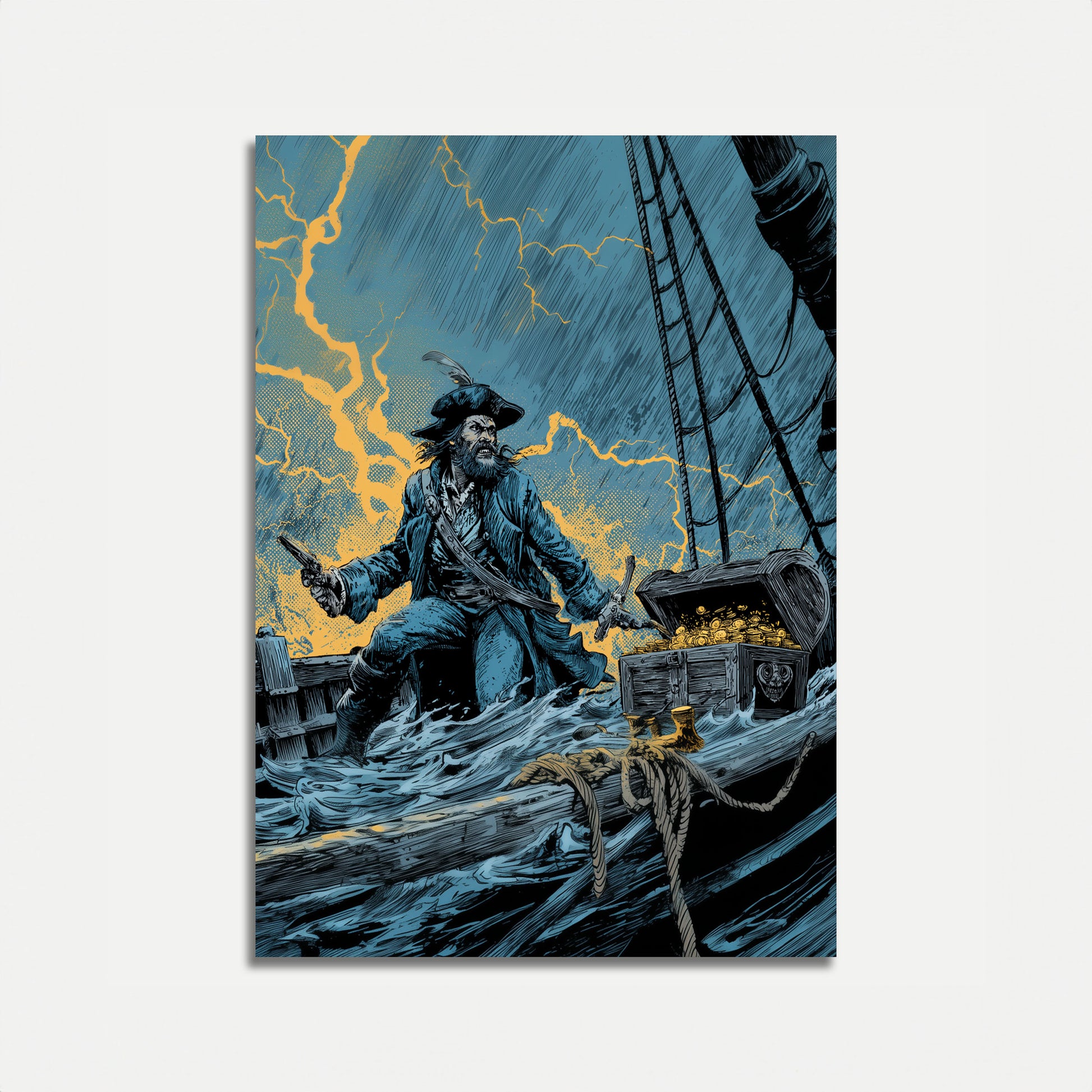 A dramatic illustration captures a fierce pirate battling a raging storm, surrounded by lightning and a treasure chest of glimmering gold. The artwork brings to life the raw intensity of maritime adventure, with deep blue and electric yellow tones creating a sense of dangerous excitement. Detailed line work and dynamic composition make this poster a striking piece of nautical art.