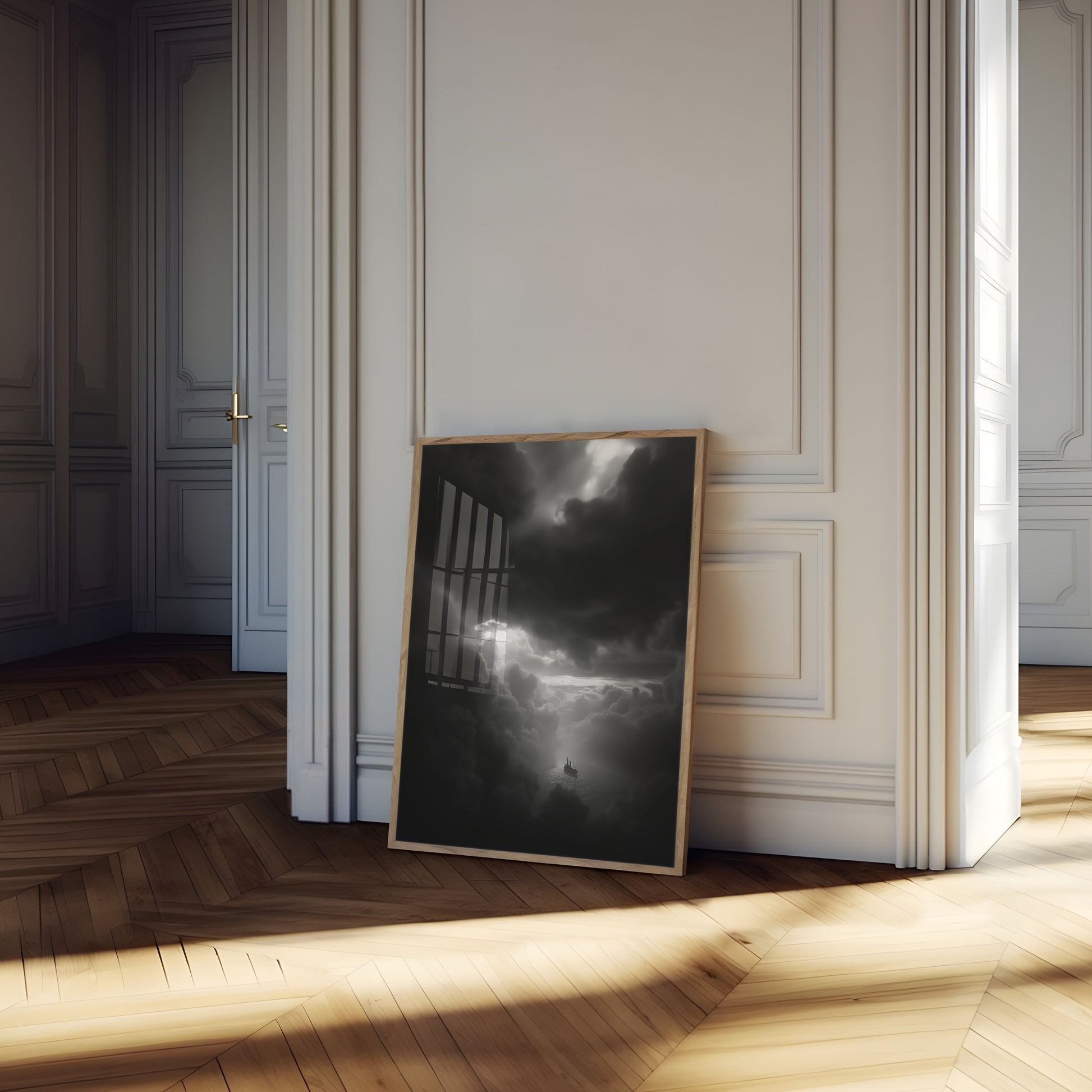A mesmerizing black and white seascape capturing a solitary sailing ship navigating through dramatic, towering storm clouds. Rays of ethereal light pierce the dark, turbulent sky, creating a powerful contrast between darkness and illumination. The image evokes a sense of isolation, adventure, and the raw beauty of nature's might.