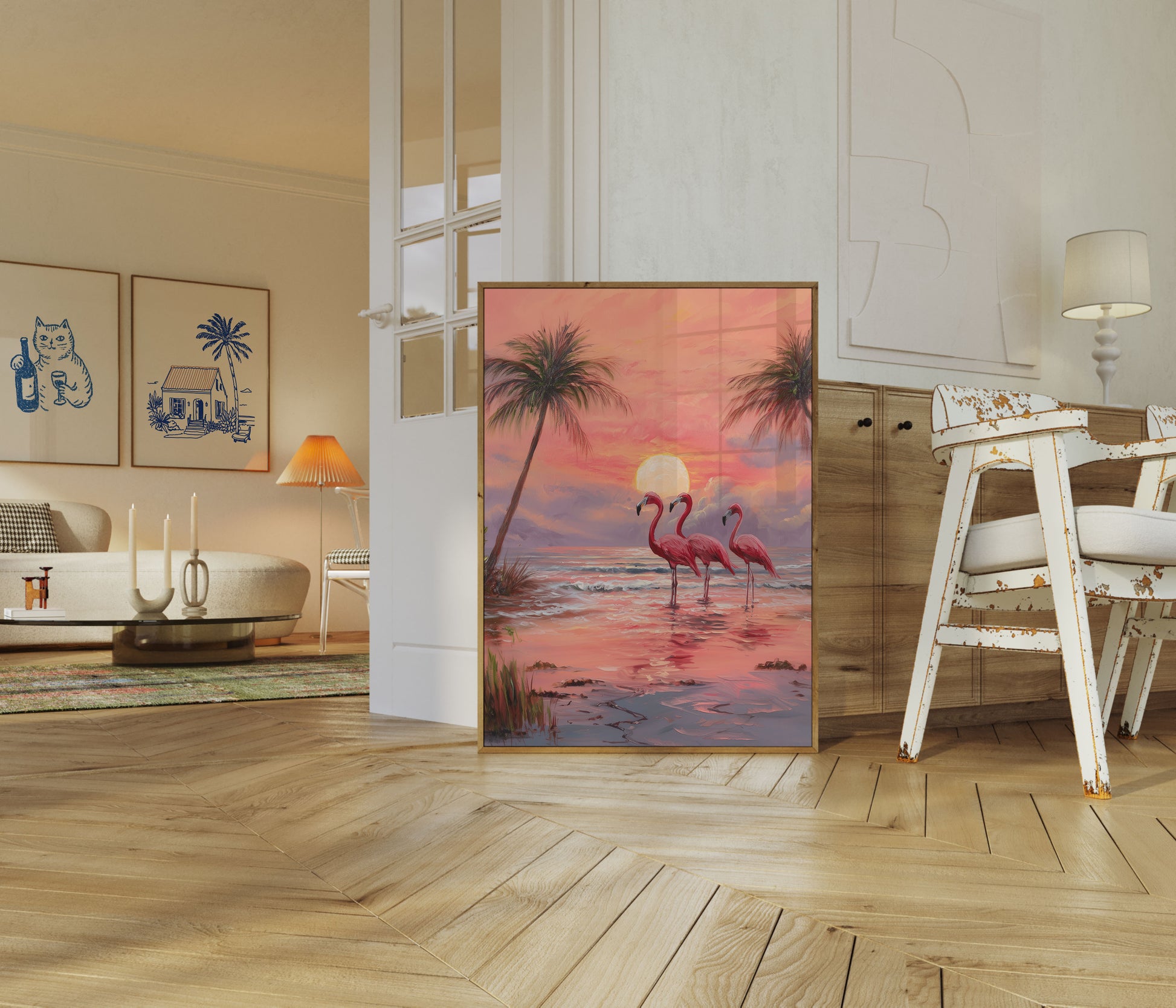 Immerse yourself in a breathtaking tropical sunset scene featuring four elegant flamingos standing gracefully in shallow waters. The artwork captures a mesmerizing palette of coral, pink, and golden hues, with palm trees framing a stunning sun-drenched horizon. Rich, warm colors and delicate brushstrokes bring this serene coastal landscape to life, evoking a sense of tranquility and natural beauty.