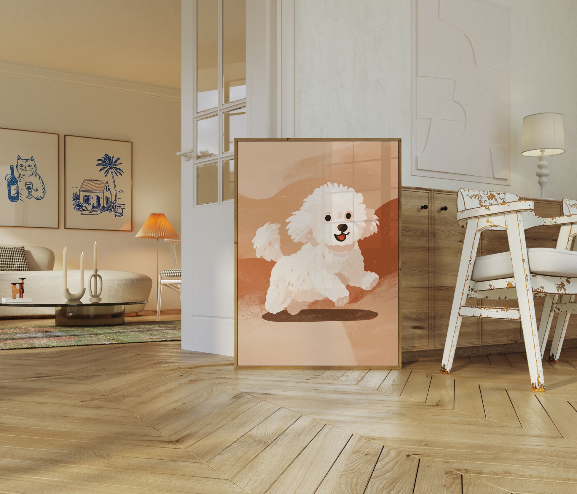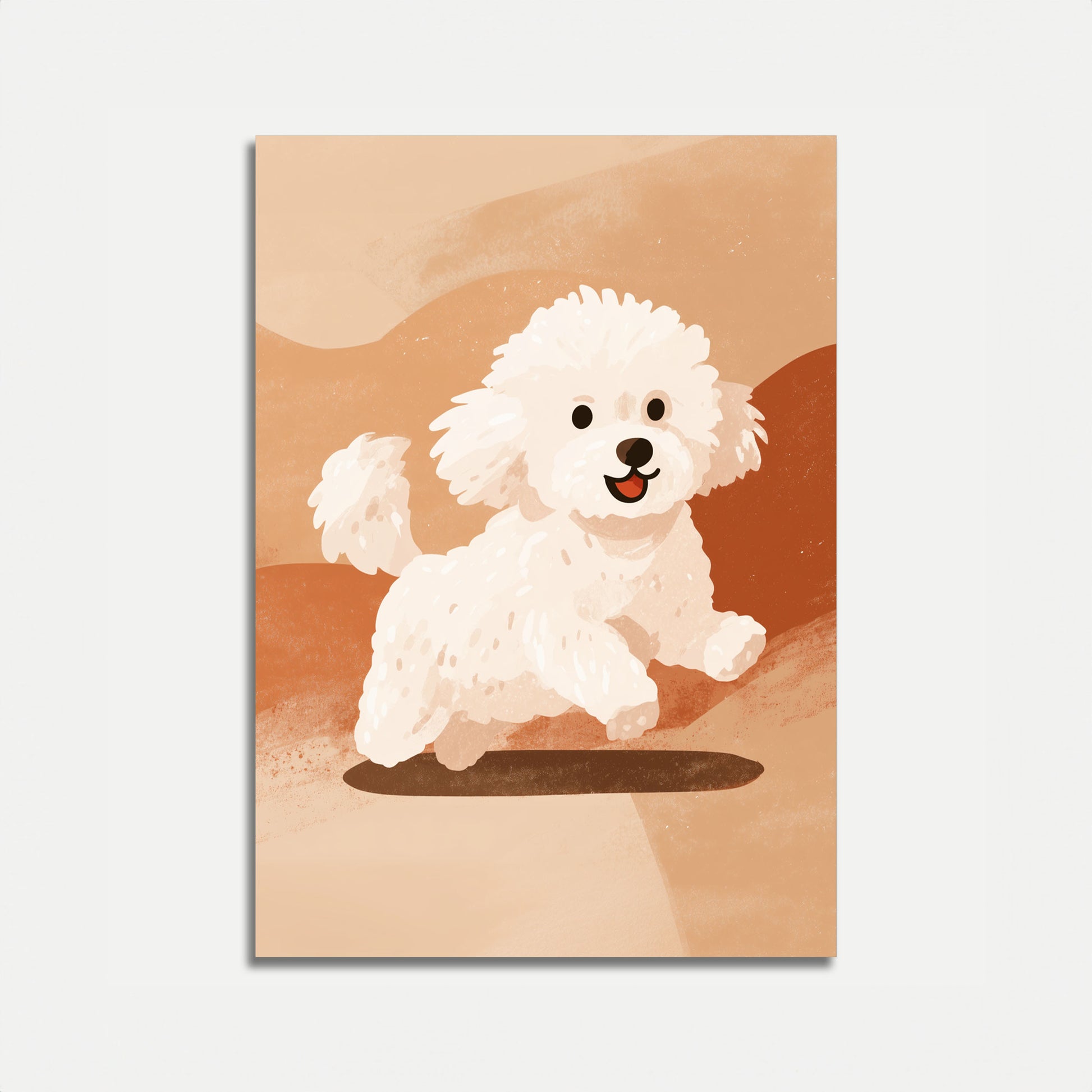 Adorable white fluffy Bichon Frise puppy playfully balancing on a skateboard against a warm, sunset-toned background. This charming illustration captures the joy and energy of a cute little dog in a stylized, minimalist art print that's sure to bring a smile to any room.