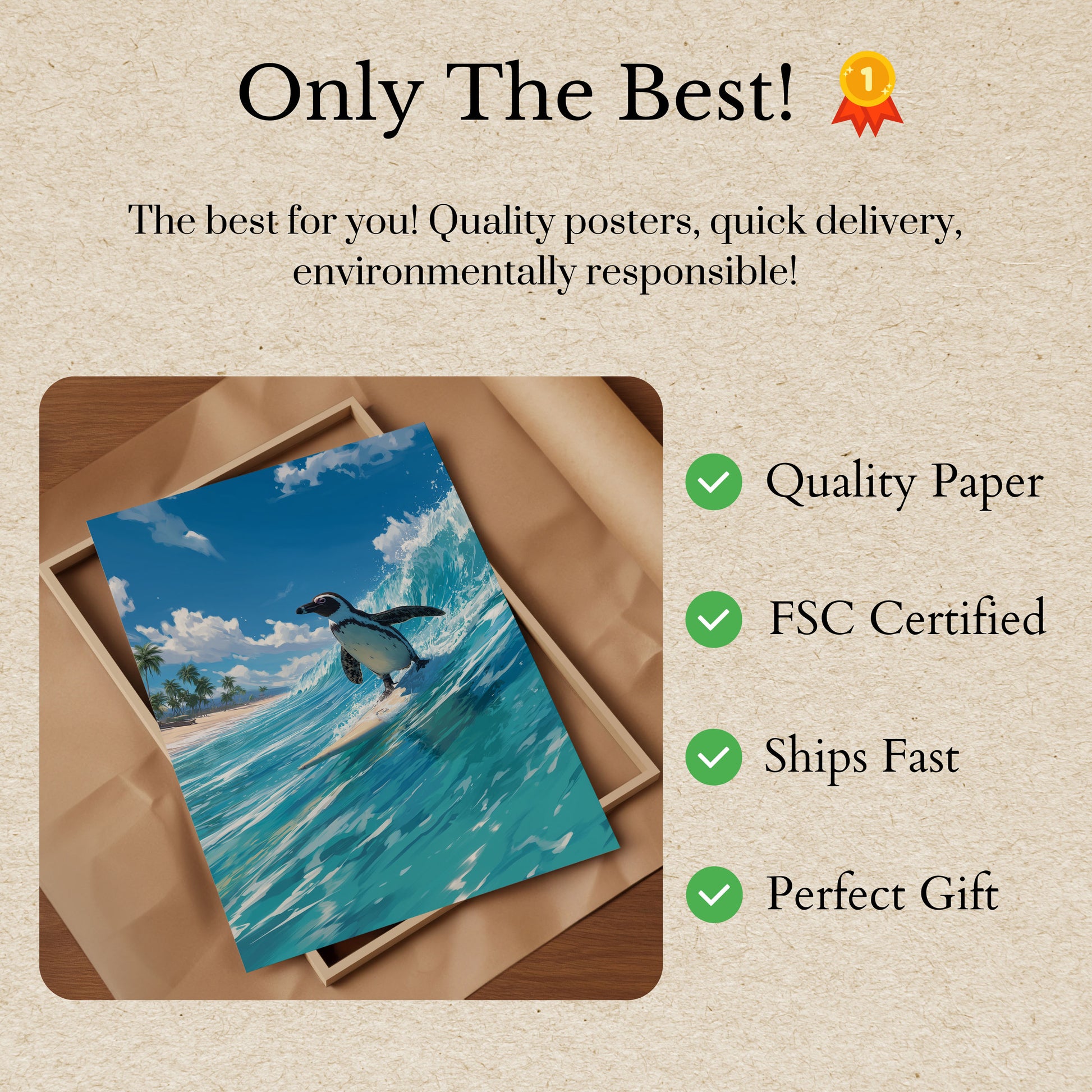 Dive into a vibrant world of unexpected excitement with this delightful penguin surfing masterpiece. A black and white penguin rides a turquoise wave, set against a backdrop of palm trees and brilliant blue skies, creating a whimsical scene of maritime adventure. The dynamic artwork captures the unexpected joy of a penguin catching the perfect wave, blending humor and artistic brilliance.