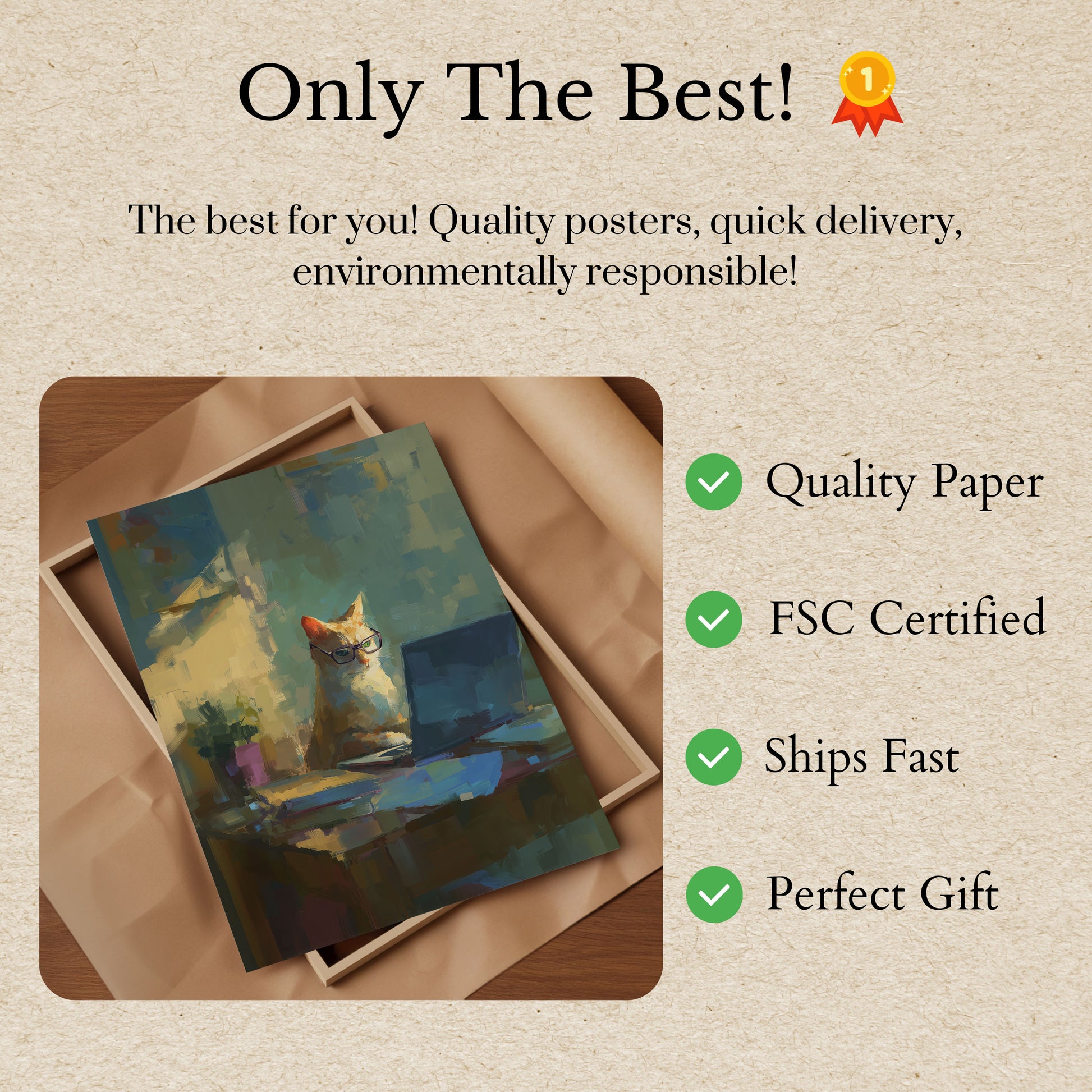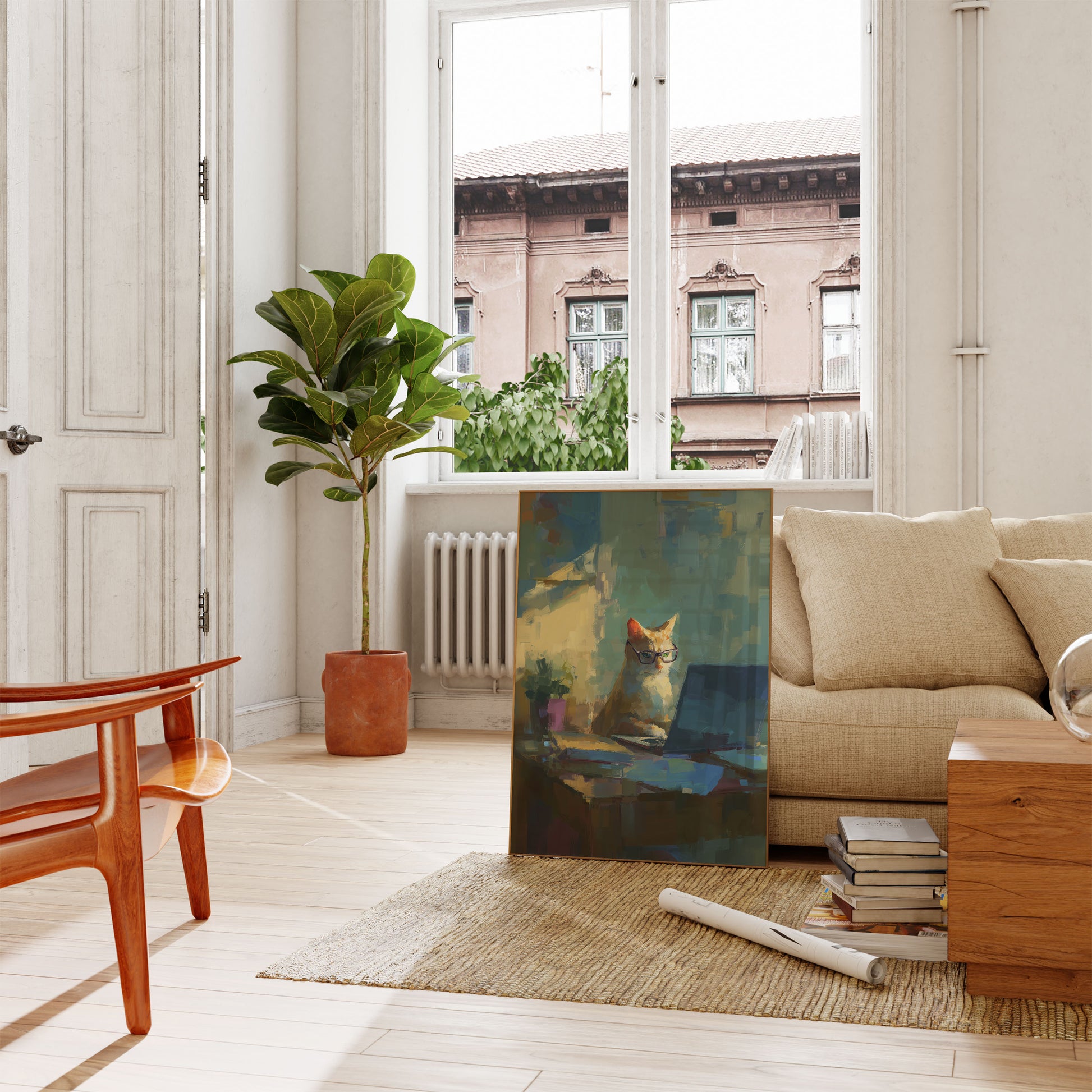 A charming digital painting captures a cat wearing glasses, intently focused on a laptop screen. The artwork blends warm yellow and cool teal tones, creating a playful yet sophisticated workspace scene that brings humor and personality to any room. The abstract brushstrokes and expressive style transform an ordinary moment into a delightful artistic statement.