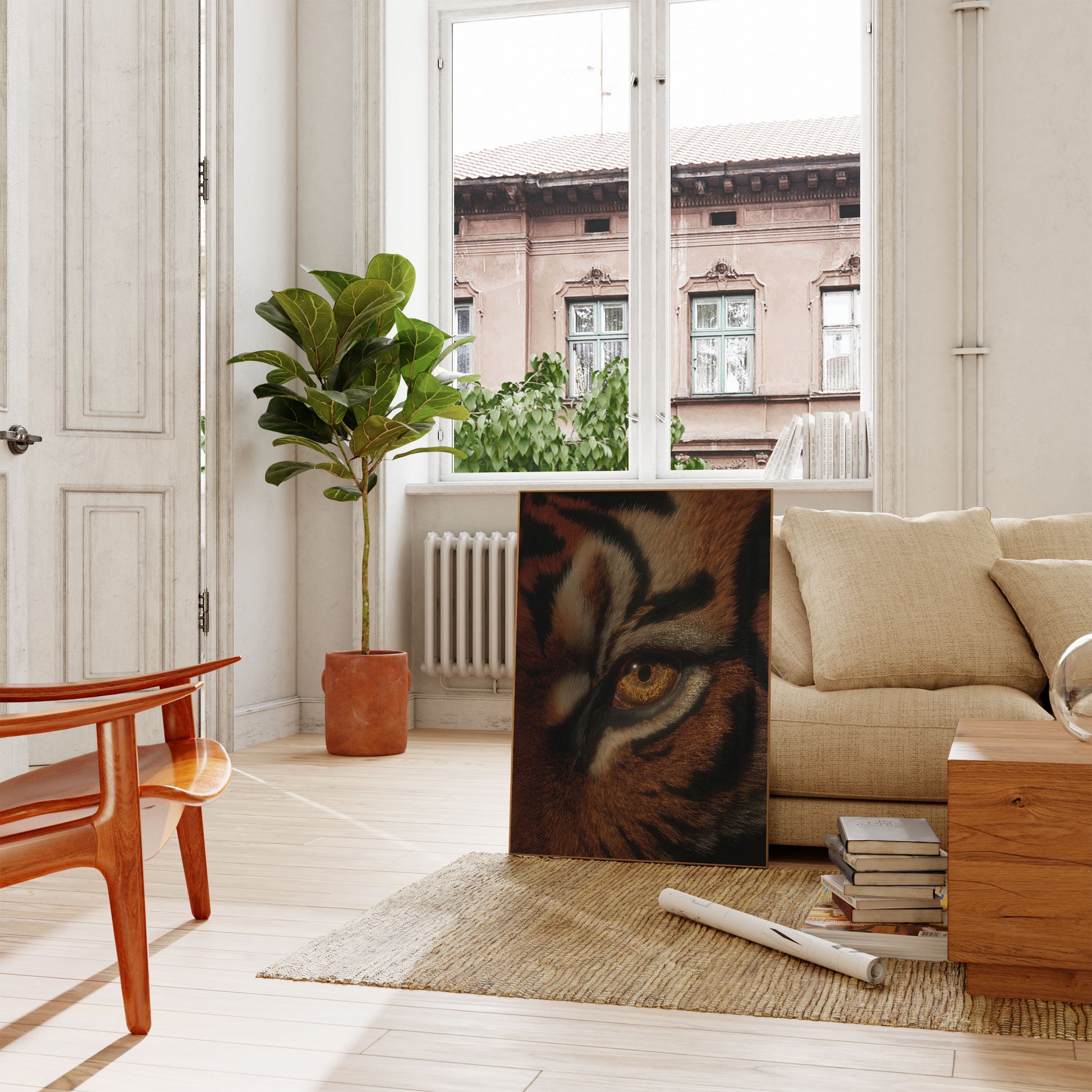 This stunning tiger portrait captures the raw intensity and beauty of one of nature's most magnificent predators. With piercing golden eyes that seem to gaze directly at you, the artwork showcases intricate detail in the tiger's striking striped fur, rendered in rich browns, blacks, and creams. The dramatic lighting and expertly rendered textures create an immersive and powerful atmosphere that brings the tiger's wild spirit into any space, making it a captivating focal point for wildlife enthusiasts and nature lovers alike.