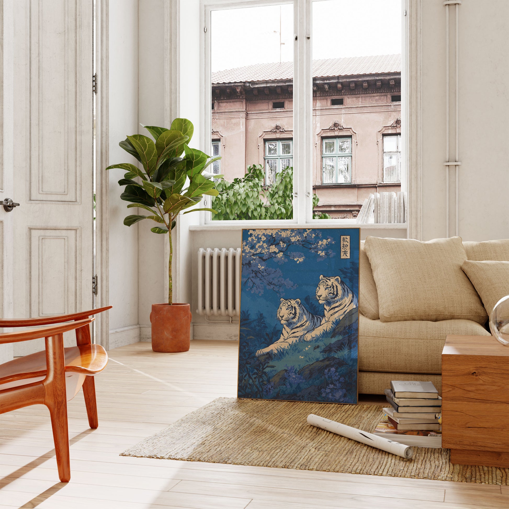This stunning artwork captures two majestic tigers resting beneath delicate cherry blossoms in a serene nighttime setting. The rich blue tones create a peaceful, contemplative atmosphere while the cream and gold accents of the flowers provide striking contrast against the deep background. The composition beautifully blends the power of these magnificent creatures with the delicate elegance of nature, evoking a sense of calm strength and timeless beauty that draws you into this tranquil scene.