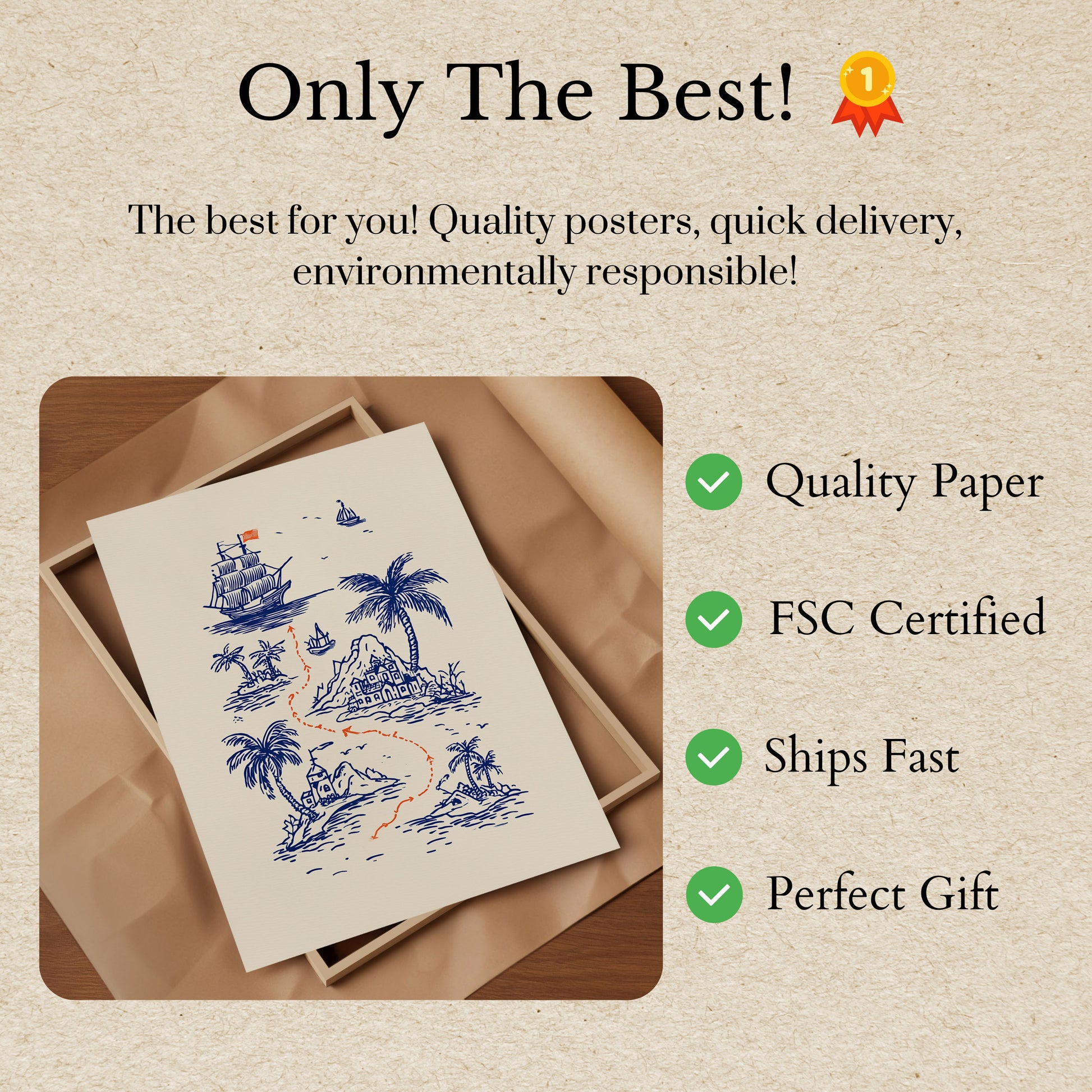 Embark on a nautical journey through this stunning blue and white illustration depicting a classic pirate treasure map. Featuring elegant sailing ships, palm-fringed tropical islands, and a winding red path leading to hidden treasures, this poster captures the romantic spirit of maritime exploration. The delicate line work and minimalist color palette create an enchanting scene that will transport you to a world of maritime mystery and adventure.