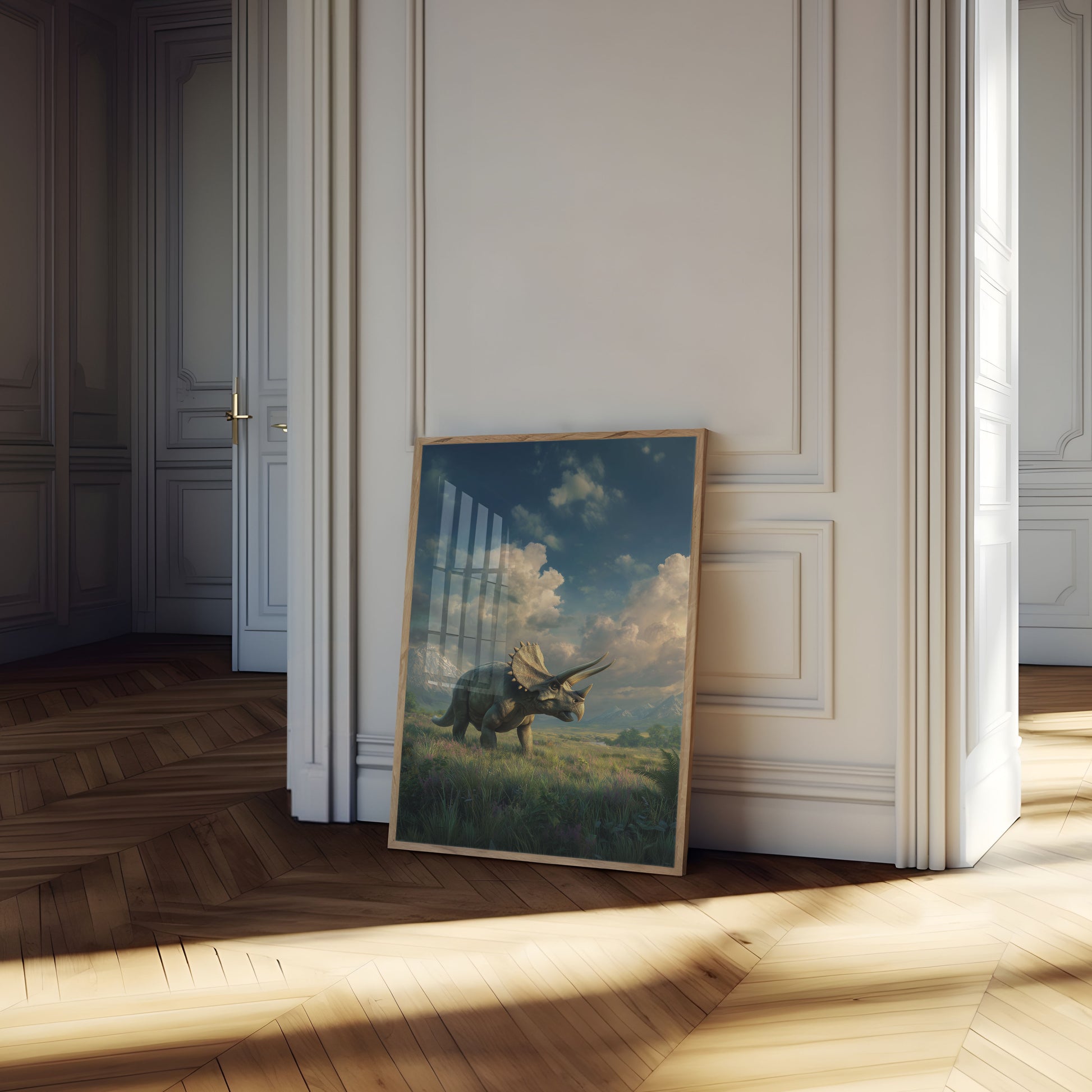 Step into the prehistoric world with this breathtaking illustration of a majestic triceratops roaming a lush grassland beneath dramatic cloudy skies. The powerful dinosaur stands amidst vibrant green grasses and wildflowers, with snow-capped mountain peaks rising in the misty background, creating a scene of stunning natural beauty and prehistoric wonder. Every detail captures the raw essence of a world millions of years in the past, inviting viewers to imagine the incredible landscape of the ancient Earth.