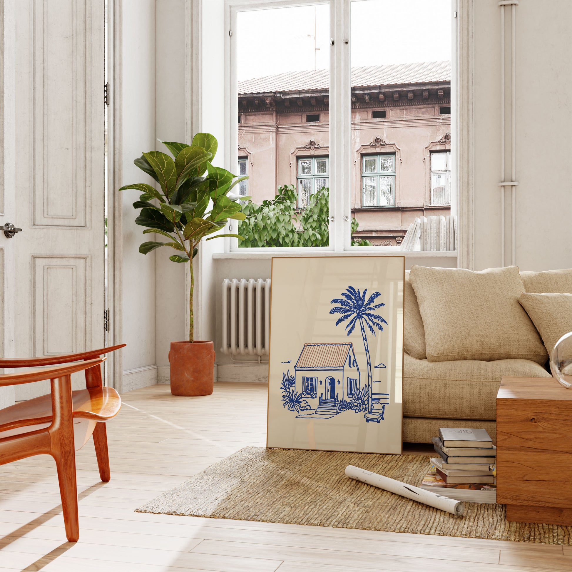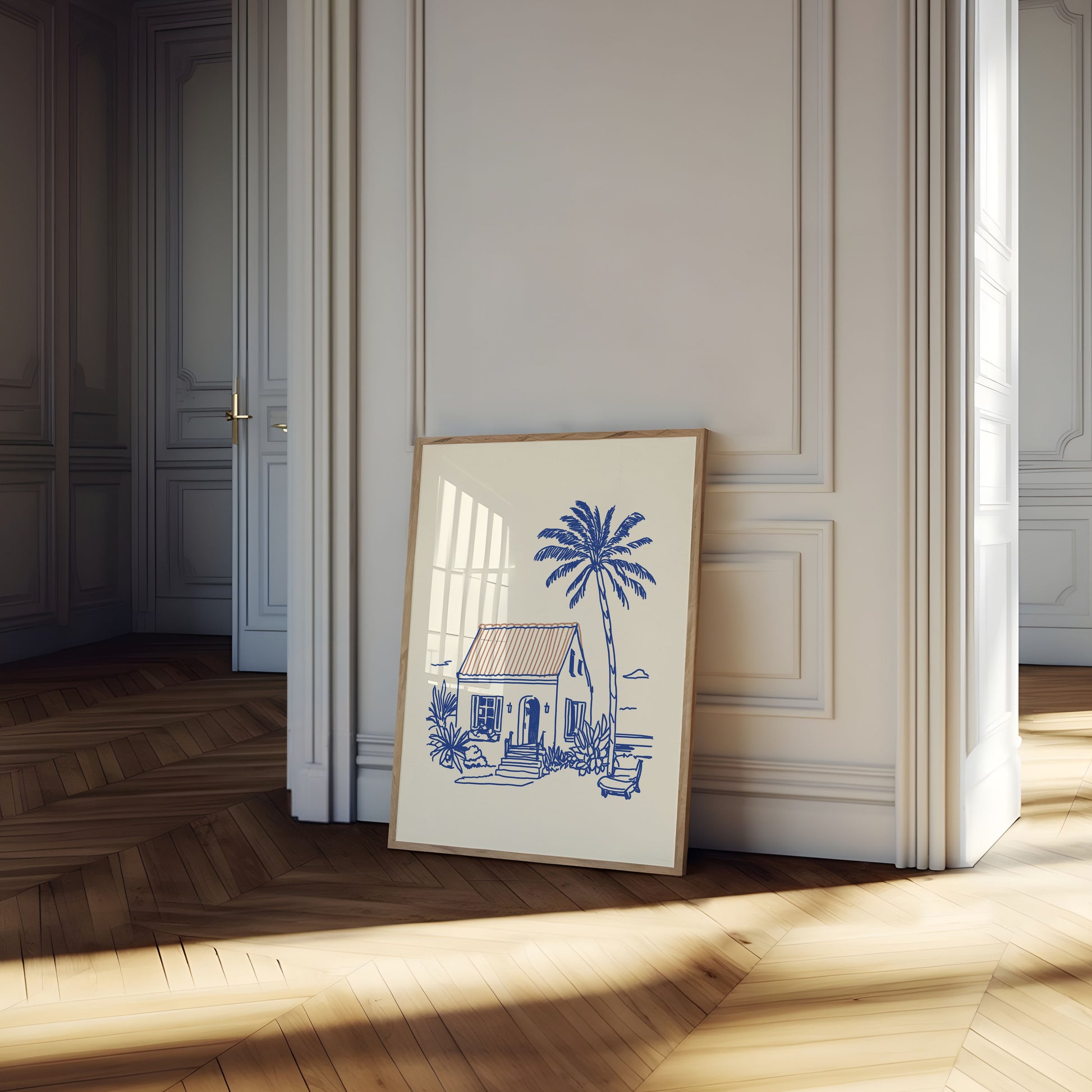 Transport yourself to a serene coastal paradise with this charming blue and white line art illustration. The simple yet evocative sketch captures a quaint beach house nestled beside a tall palm tree, complete with steps leading to an arched doorway and lush tropical vegetation. Delicate, hand-drawn lines create a sense of peaceful tranquility that will bring a touch of island relaxation to any room.