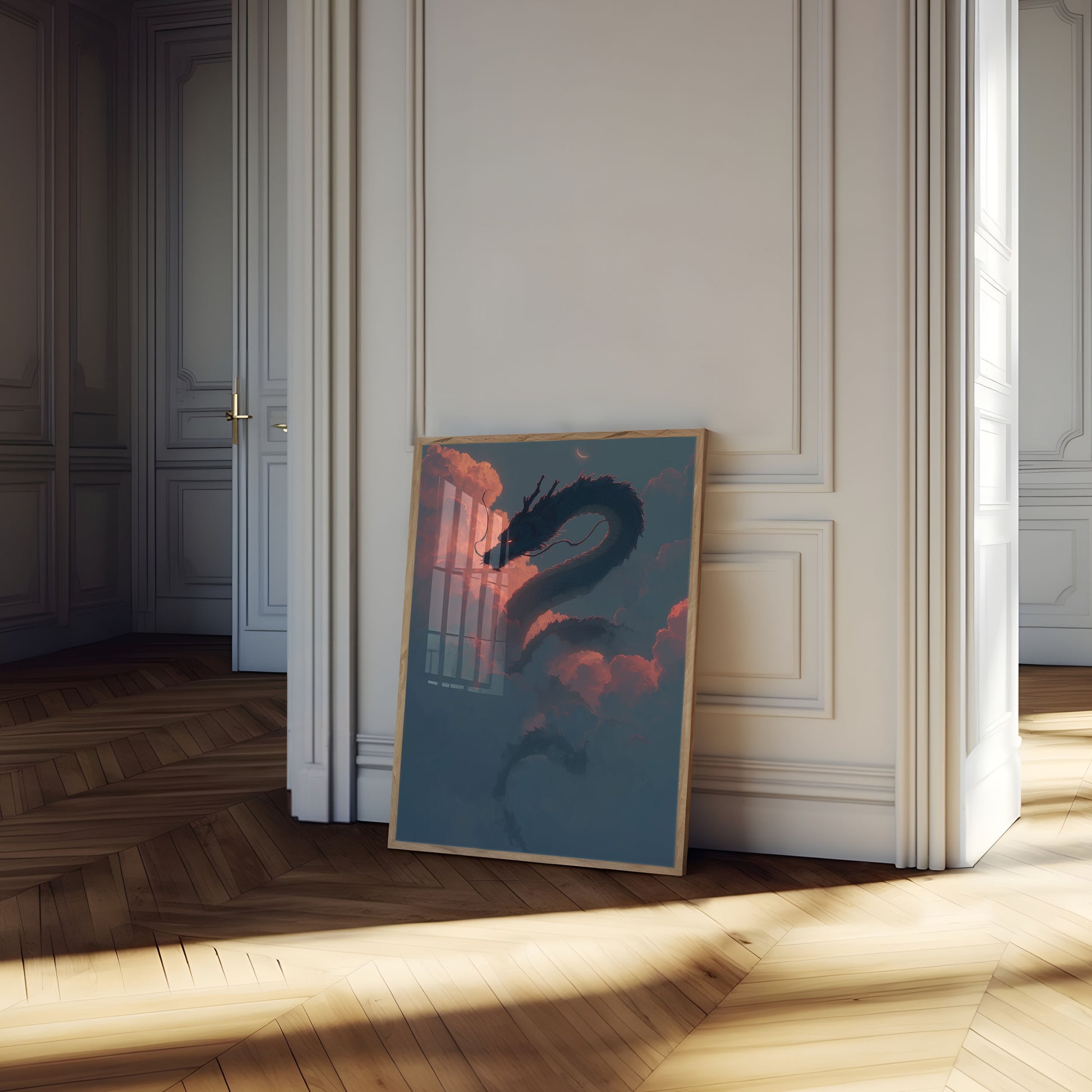 Immerse yourself in a breathtaking fantasy landscape where a majestic, serpentine dragon winds through dramatic crimson and blue-gray clouds. The creature's silhouette cuts a powerful, mystical shape against a moody twilight sky, with a delicate crescent moon hanging in the background, creating an atmosphere of ethereal mystery and sublime wonder. This stunning artwork captures the raw, mythical essence of an ancient dragon emerging from the celestial realm.