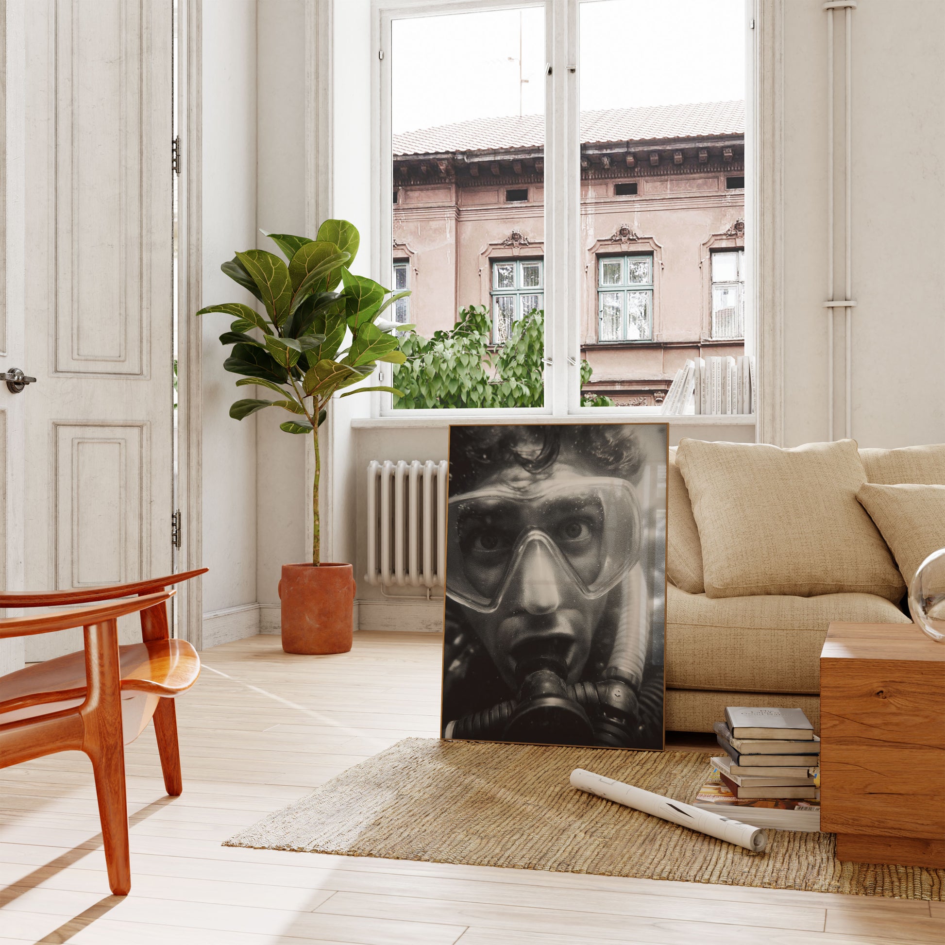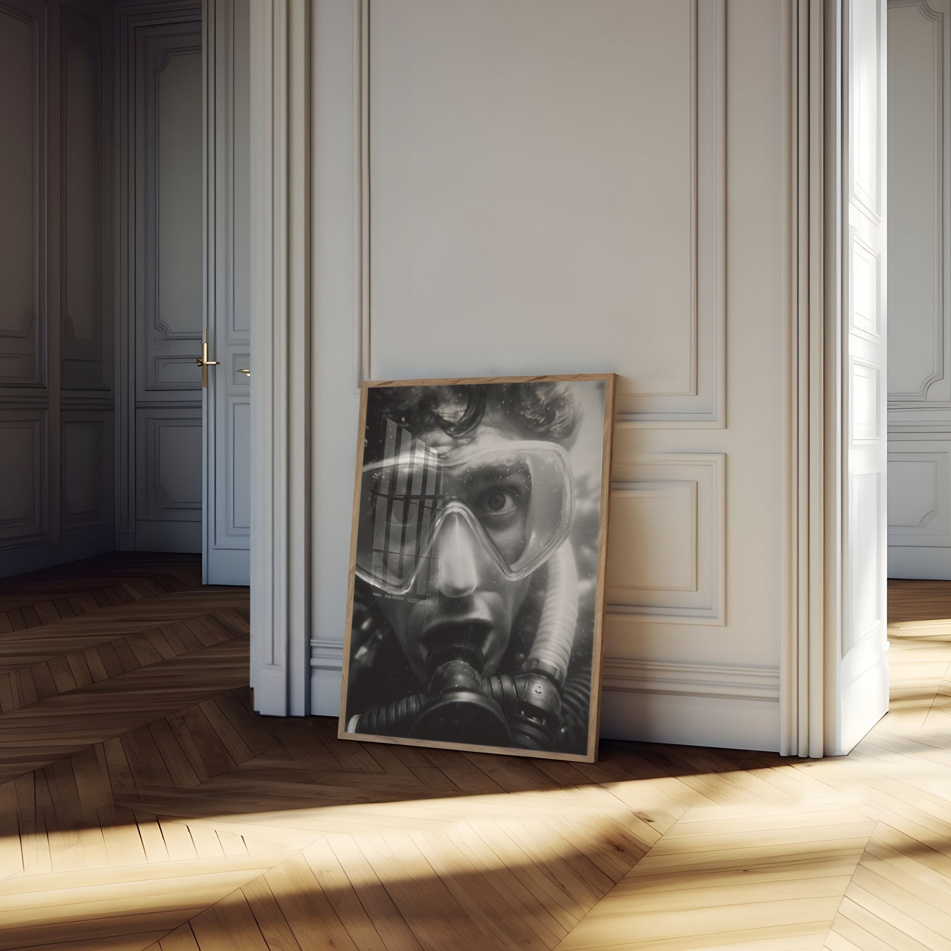 Dive into the raw, visceral world of underwater exploration with this striking black and white close-up of a scuba diver. The image captures an intense, almost primal moment of underwater immersion, with crystalline water droplets, a penetrating gaze through a sleek diving mask, and textured breathing tubes creating a powerful sensory experience. Every detail reveals the concentration and emotion of underwater adventure, transforming this poster into a breathtaking portal to the mysterious marine realm.