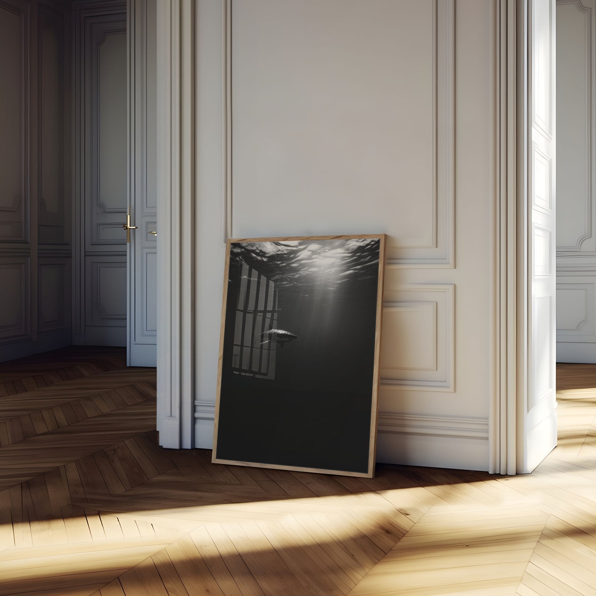 Dive into the mysterious depths of the ocean with this breathtaking black and white shark poster. Sunlight pierces through the water's surface, casting dramatic rays that illuminate the powerful silhouette of a shark gliding through the dark underwater landscape. The high-contrast image captures the raw beauty and silent strength of this marine apex predator, creating a mesmerizing visual experience that will command attention in any room.