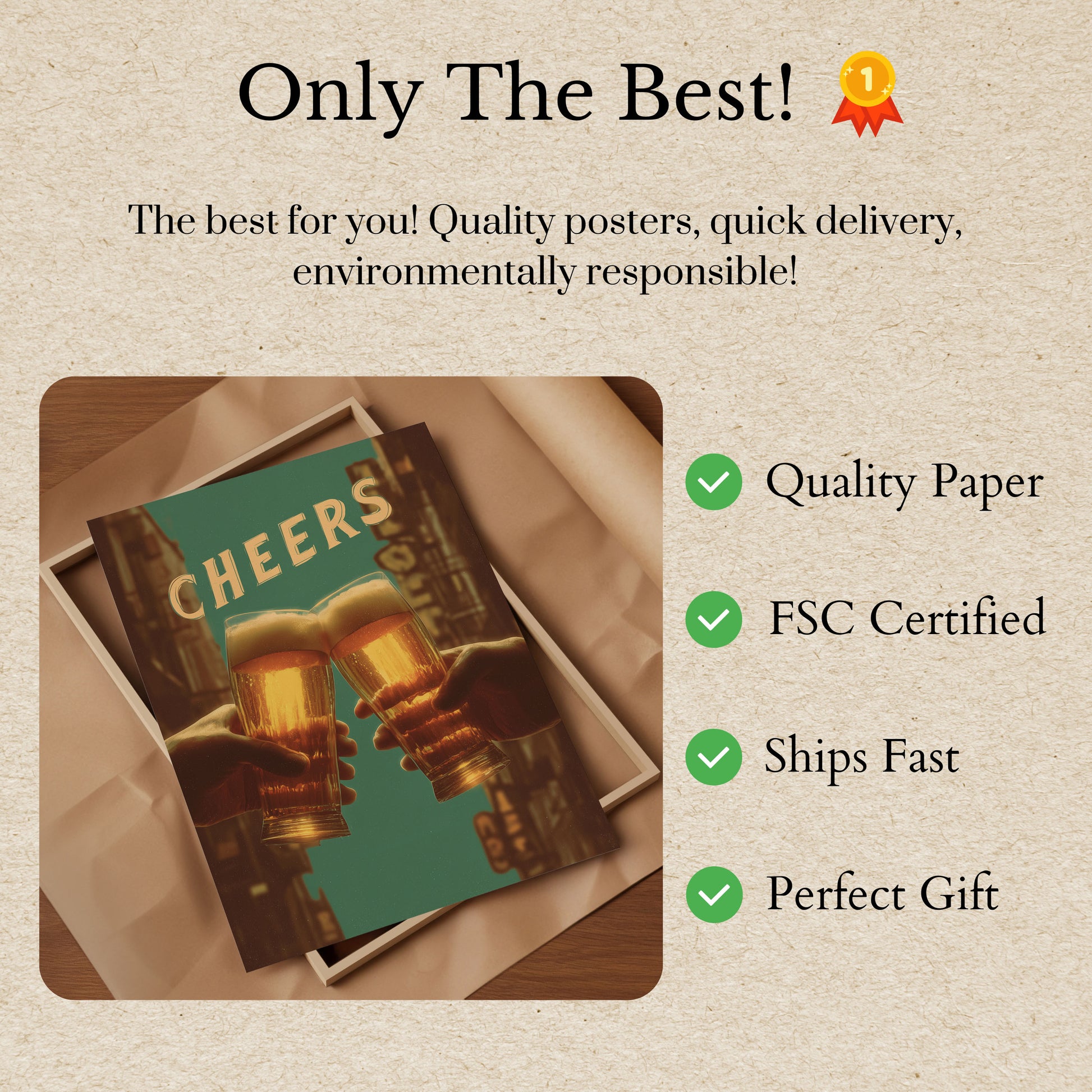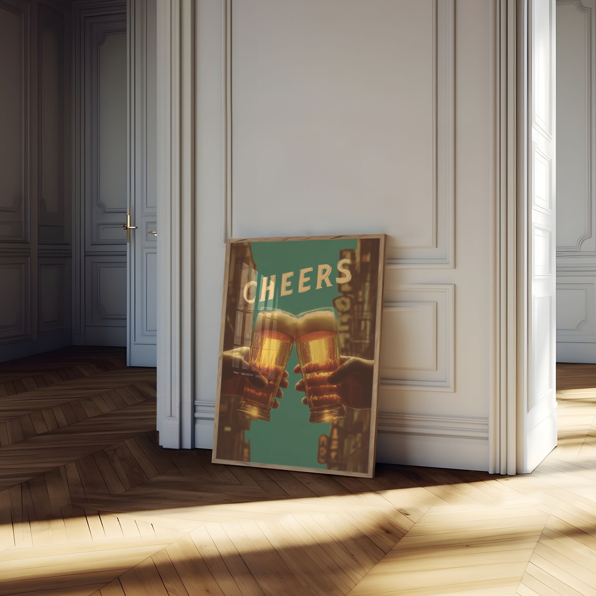 Celebrate friendship and city life with this nostalgic beer cheers poster that captures the warm golden glow of perfectly poured brews. Set against a retro urban backdrop with a rich teal background, two hands raise frothy beer glasses in a classic toast, embodying camaraderie and good times. The vintage-inspired design evokes a sense of classic pub culture and shared moments.