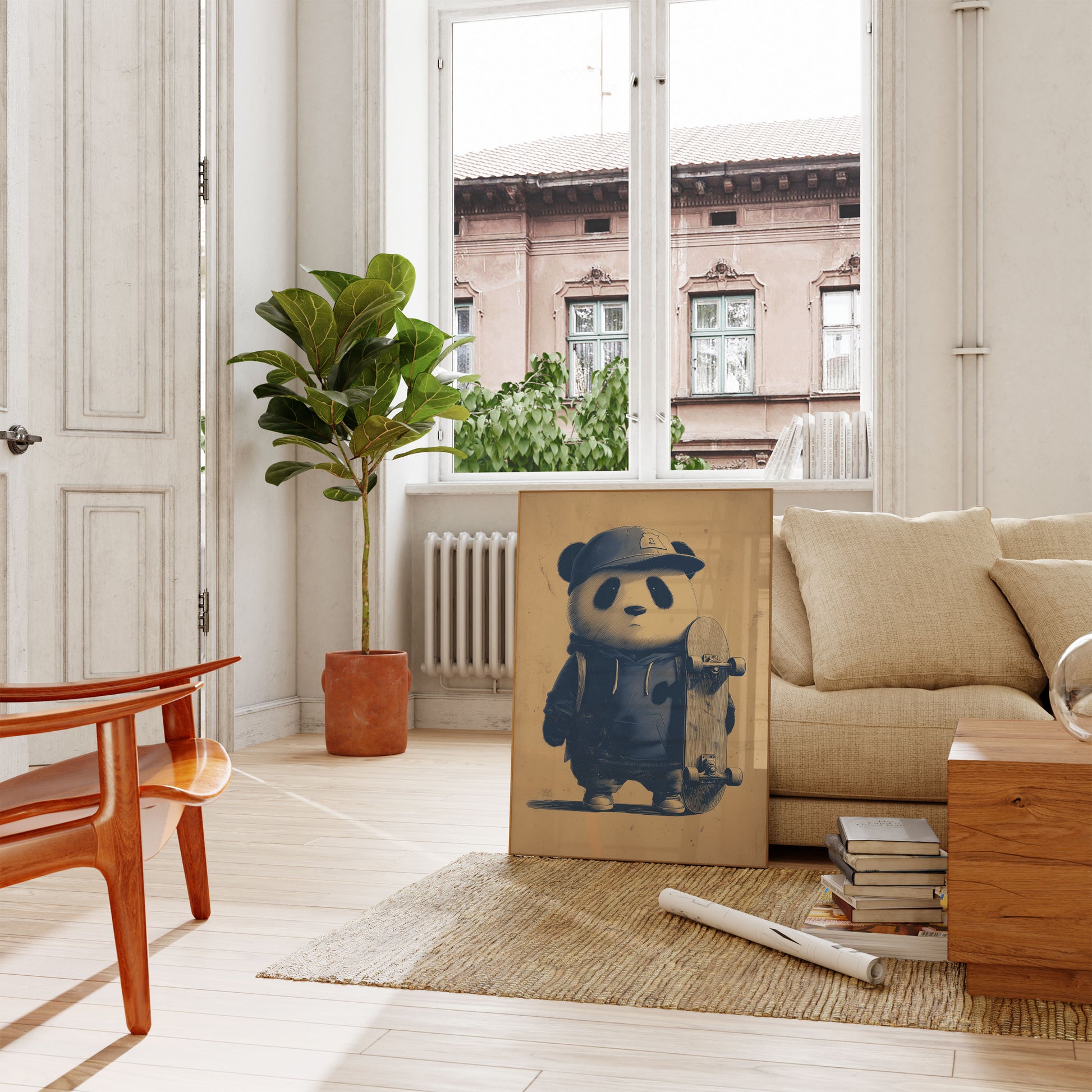 Meet the coolest bear in town - a stylish panda rocking a street-smart look with a skateboard and baseball cap. Dressed in a cozy hoodie, this laid-back character brings an unexpected blend of urban cool and cuddly charm to life in a stunning blue and sepia tone illustration.