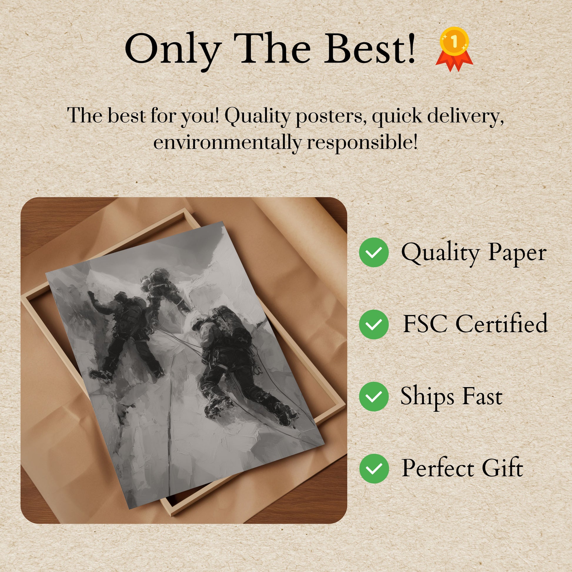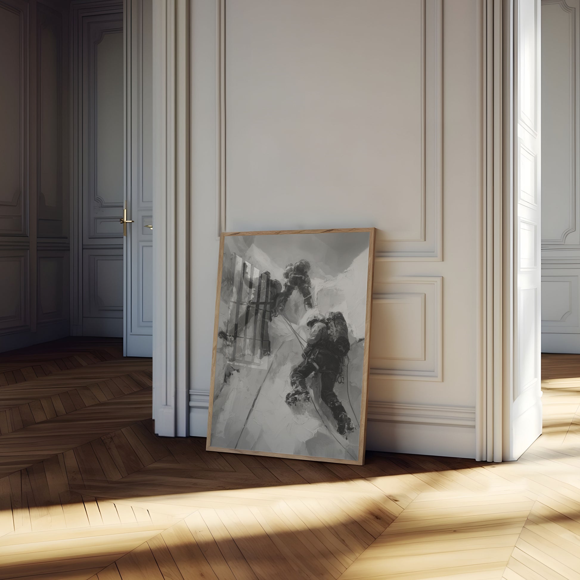 Immerse yourself in the raw intensity of high-altitude mountain climbing with this dramatic grayscale artwork depicting mountaineers scaling a treacherous ice wall. The image captures the epic struggle of human endurance against nature's most unforgiving terrain, with climbers tethered together, navigating steep, textured surfaces that seem to pulse with dramatic energy and risk. Every brushstroke conveys the tension, skill, and profound courage required to conquer the world's highest peak.