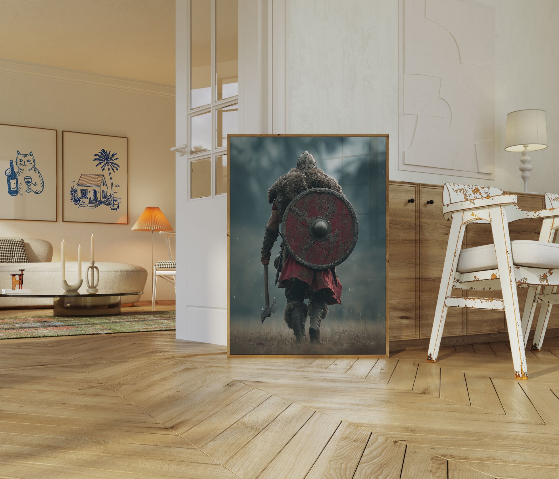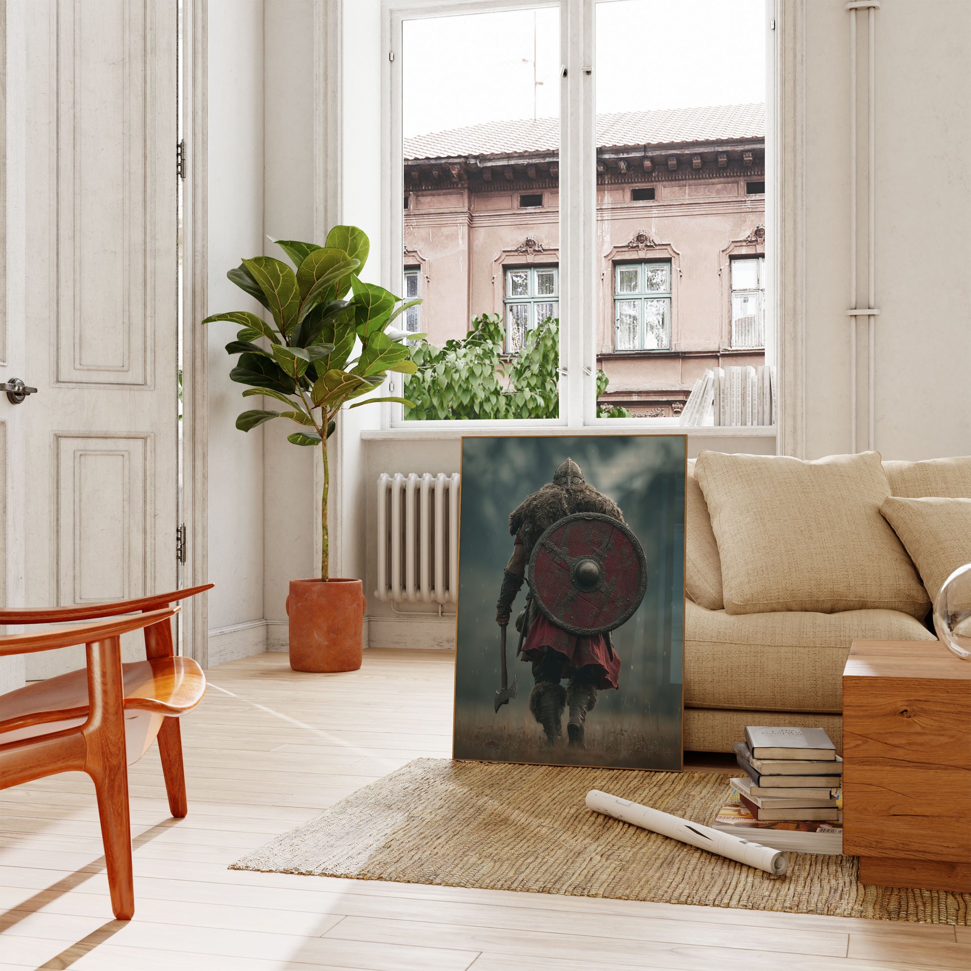 Step into the misty realm of Nordic legend with this powerful Viking warrior poster. Dressed in fur and armor, the stoic figure stands resolute, wielding an ornate axe and bearing a massive red shield against a moody, atmospheric background. The intricate details of the metalwork, the weathered textures, and the dramatic lighting create an immersive snapshot of medieval warrior culture.