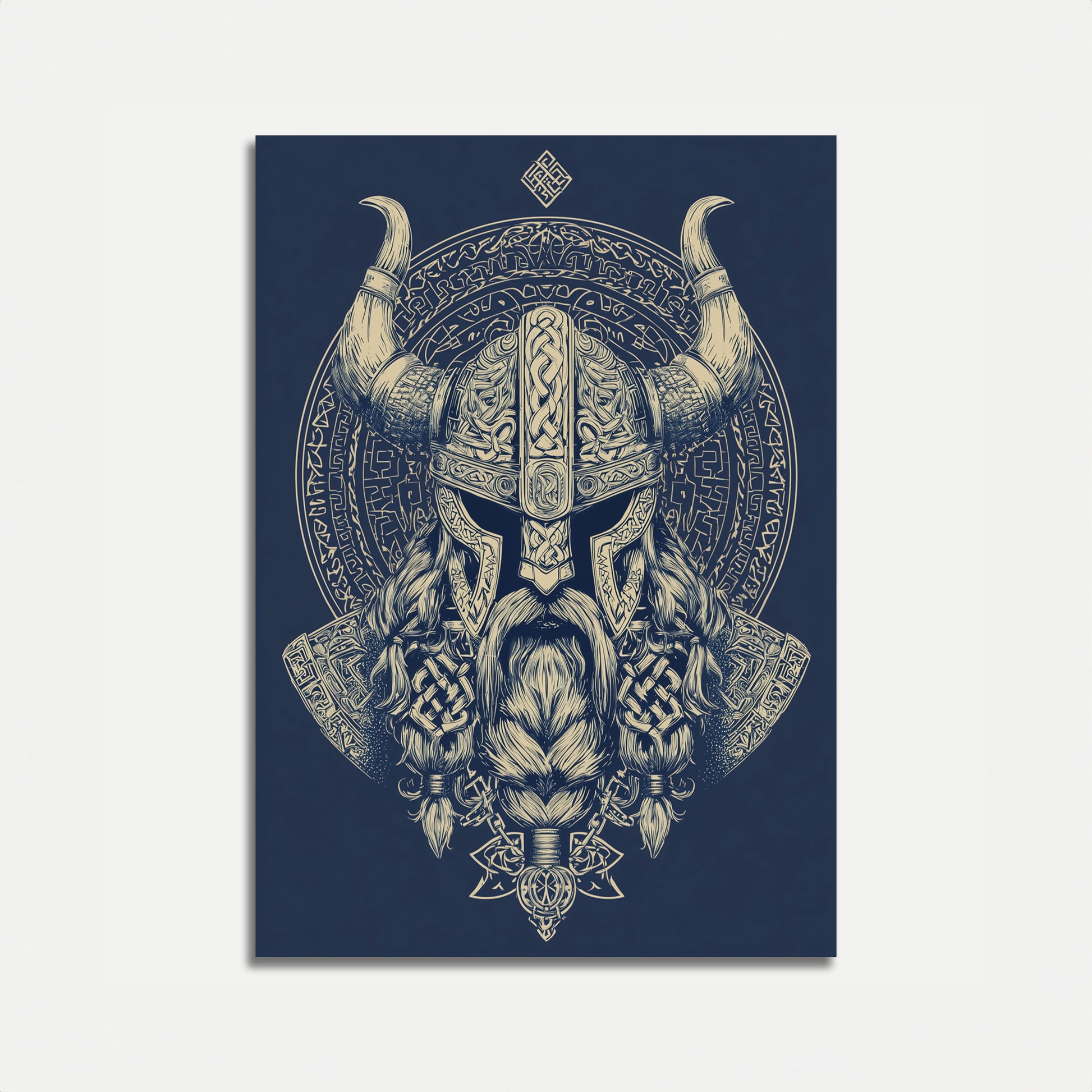Immerse yourself in the rich, intricate world of Norse mythology with this stunning Viking warrior artwork. Featuring a meticulously detailed helmet adorned with Celtic knots and ancient runes, this poster captures the fierce spirit and intricate craftsmanship of Viking culture. The deep navy background and elegant cream-toned design create a powerful visual tribute to the legendary Norse warriors.