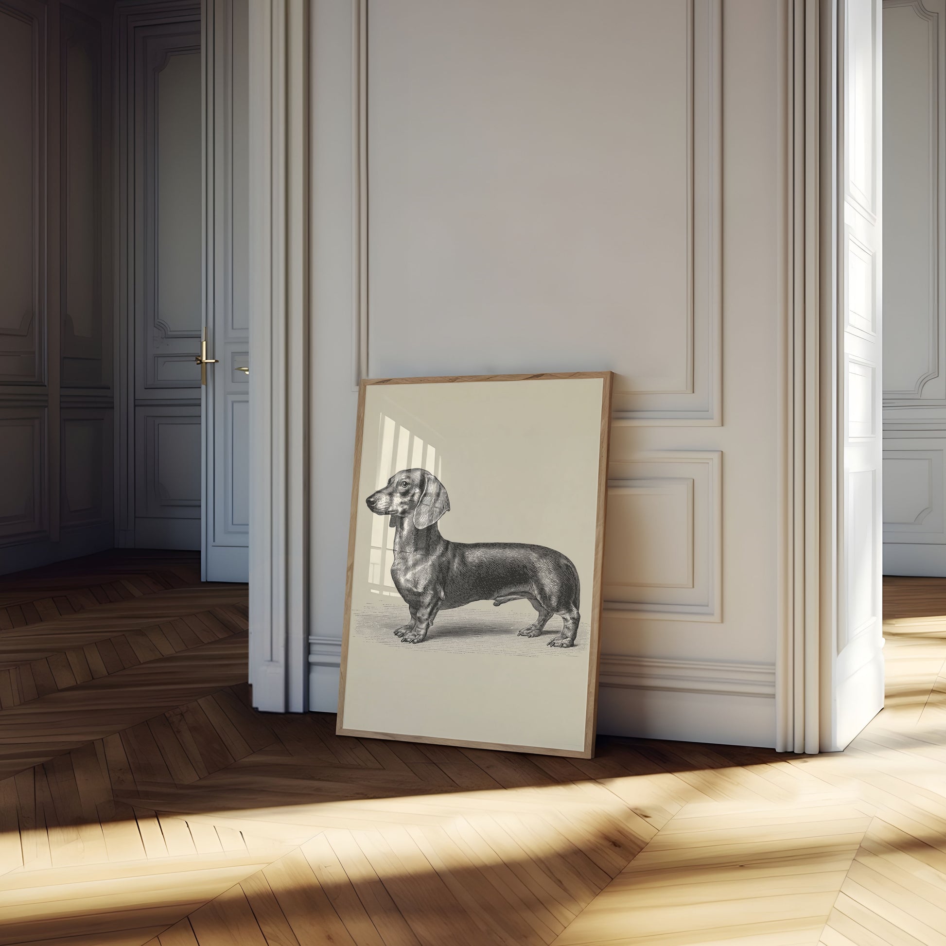 This exquisite vintage-style illustration captures the elegant profile of a dachshund in a classic black and white engraving. The detailed linework beautifully highlights the breed's distinctive long body and expressive face, creating a timeless piece of animal artwork that will add sophistication to any space.