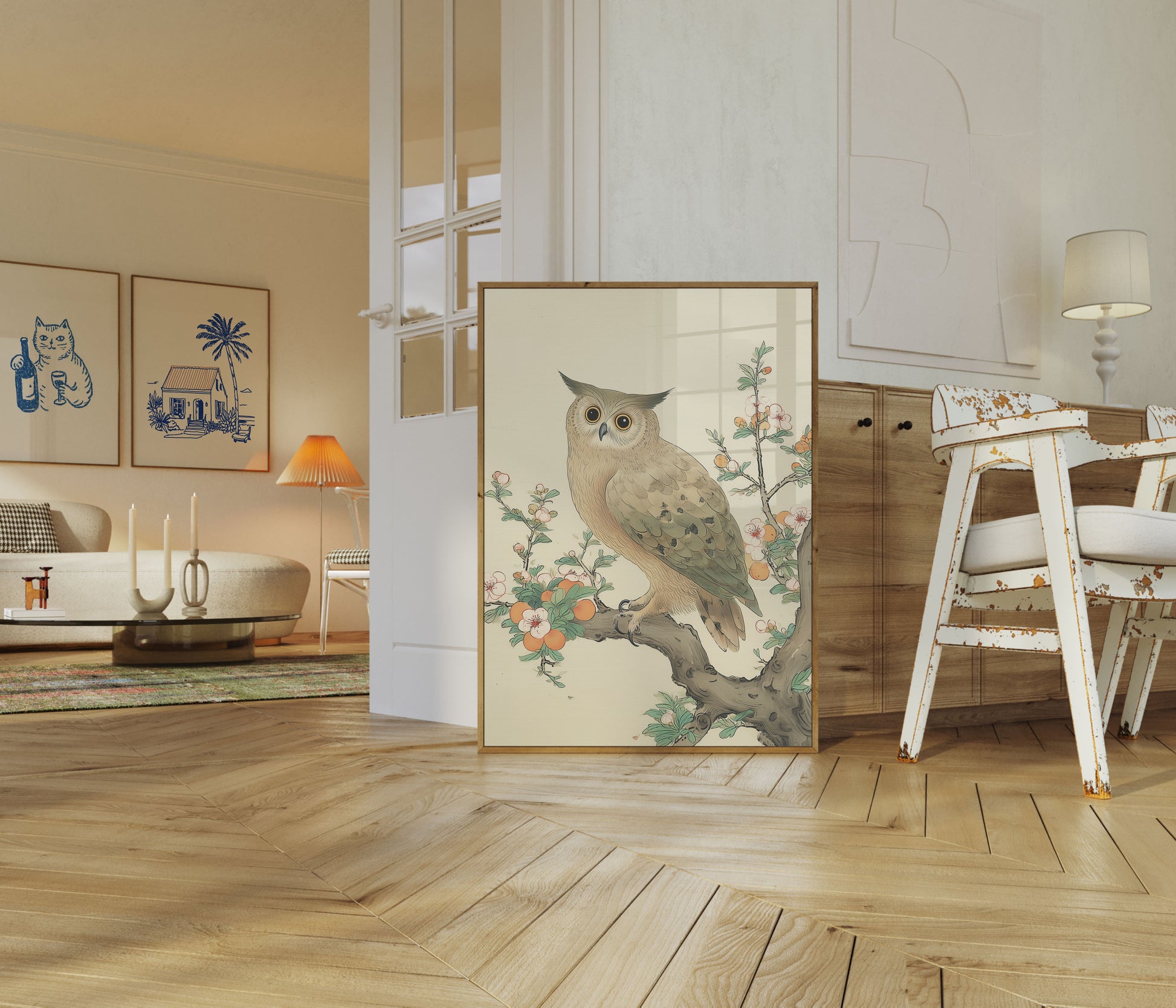 A serene and elegant illustration of an owl perched delicately on a tree branch, surrounded by soft pink blossoms and vibrant orange fruits. The artwork captures the owl's mesmerizing large eyes and intricate feather details in a classic East Asian watercolor style, creating a tranquil and harmonious natural scene.