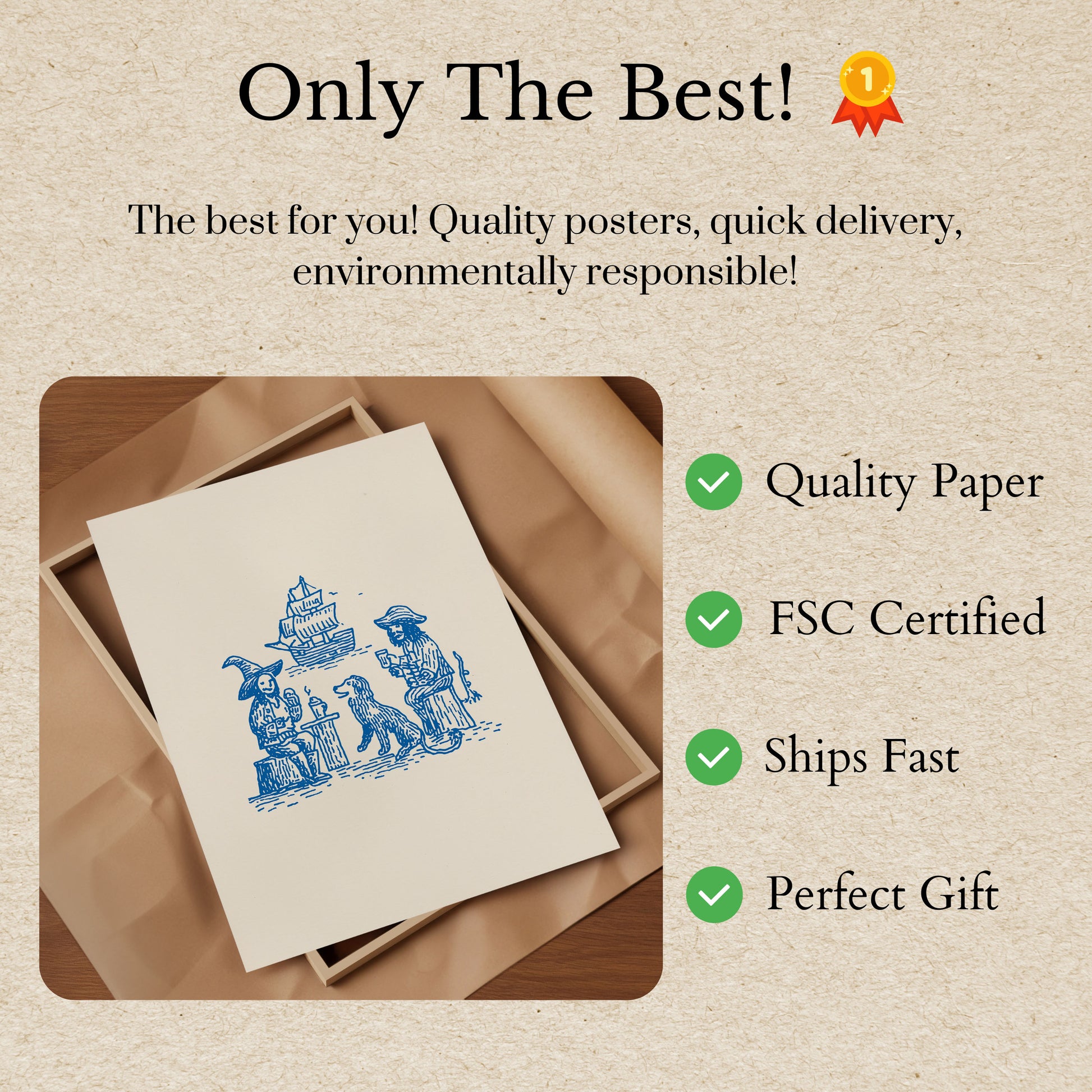 Dive into a charming blue-toned illustration capturing the essence of maritime adventure. This delightful poster features two pirates, a loyal dog, and a sailing ship in the background, rendered in a nostalgic, hand-drawn style that evokes classic nautical storytelling.