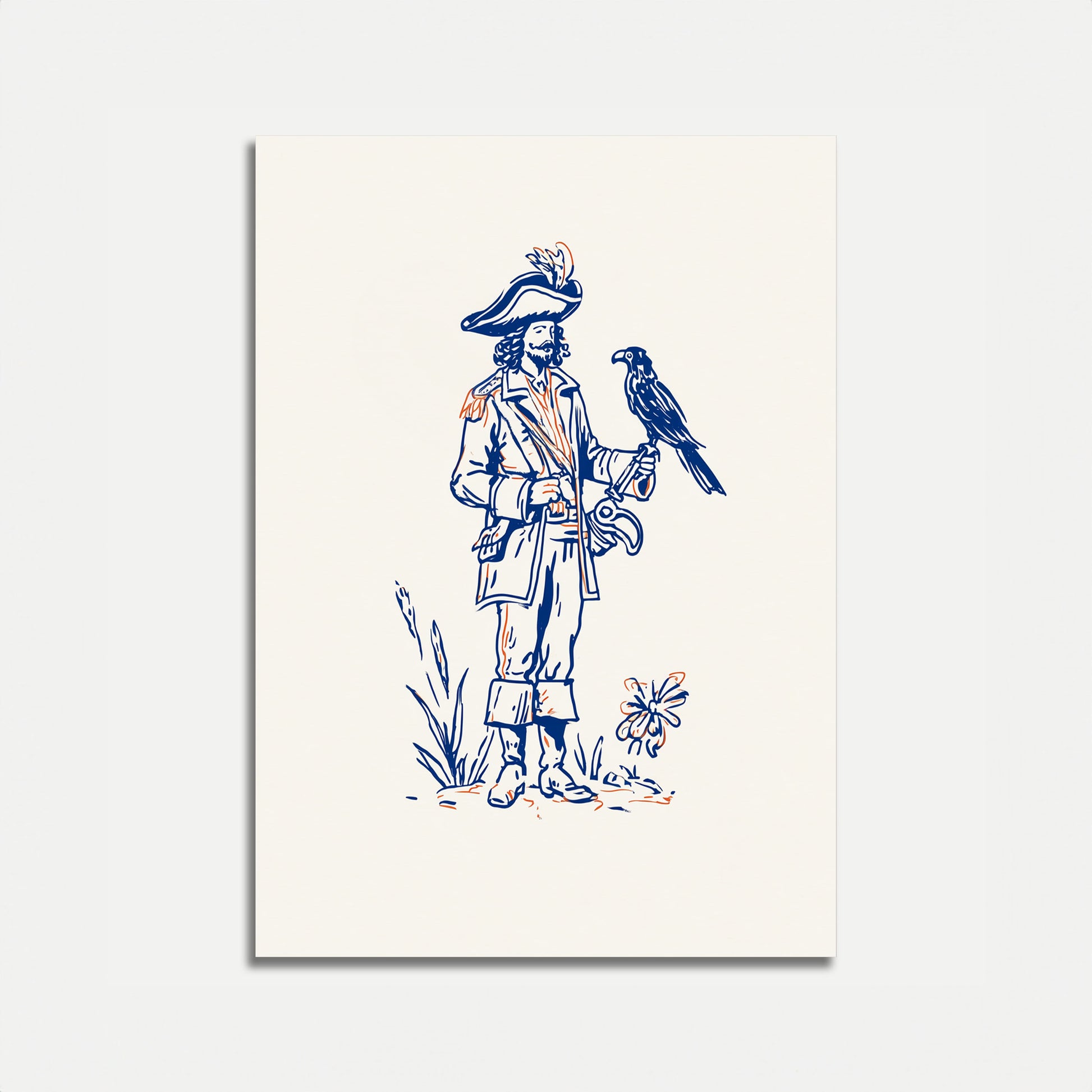 Step into the world of high-seas adventure with this captivating illustration of a dashing pirate in a classic tricorn hat, perched alongside his loyal parrot companion. Rendered in a striking blue and red line art style, the poster captures the romantic essence of maritime exploration and swashbuckling spirit. Every detail brings the character to life, from his ornate coat to the delicate floral elements surrounding him.