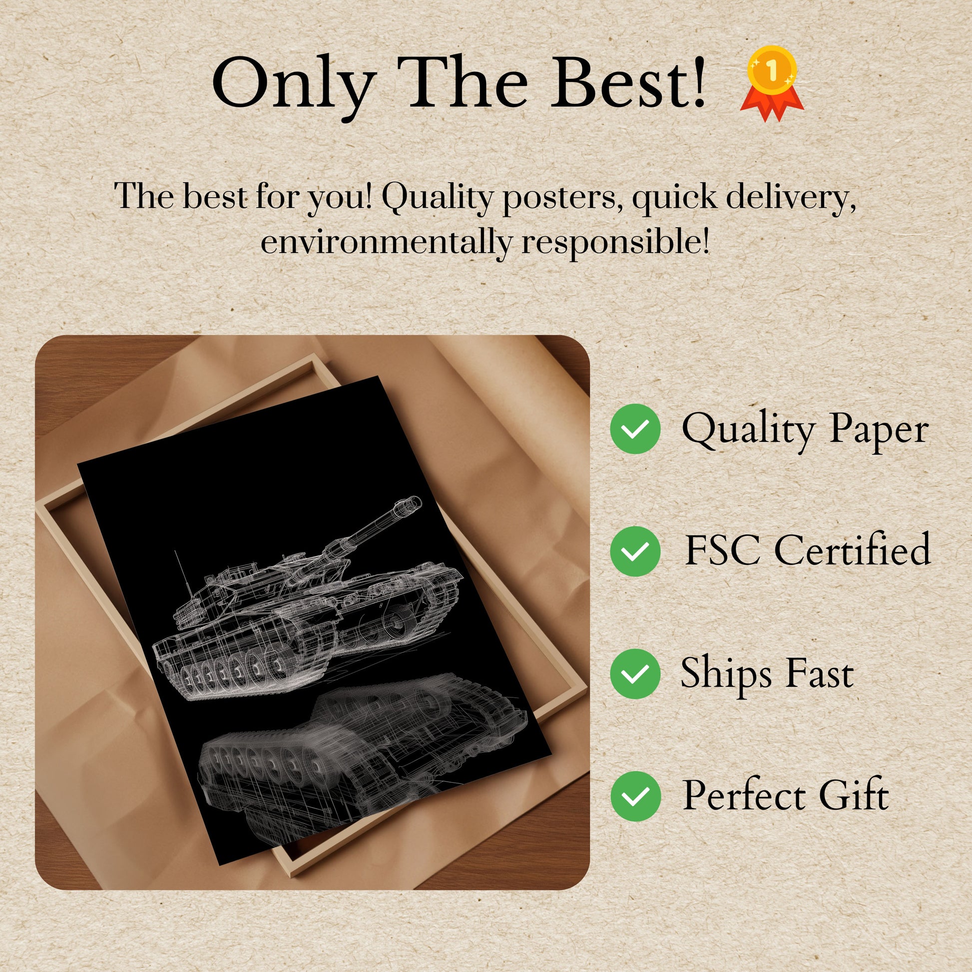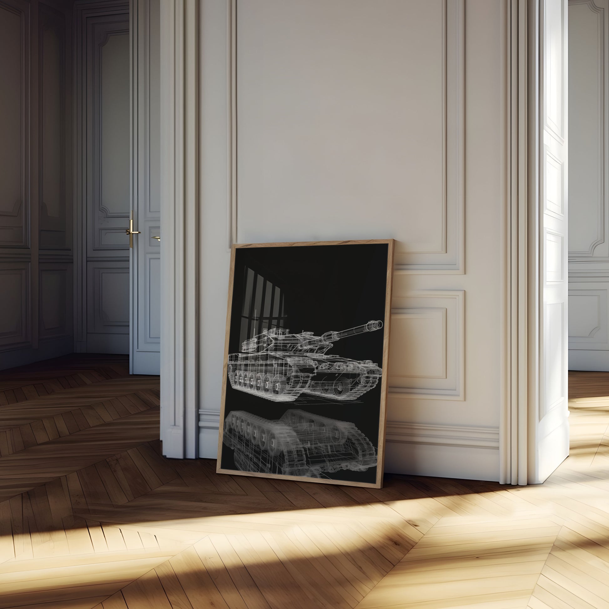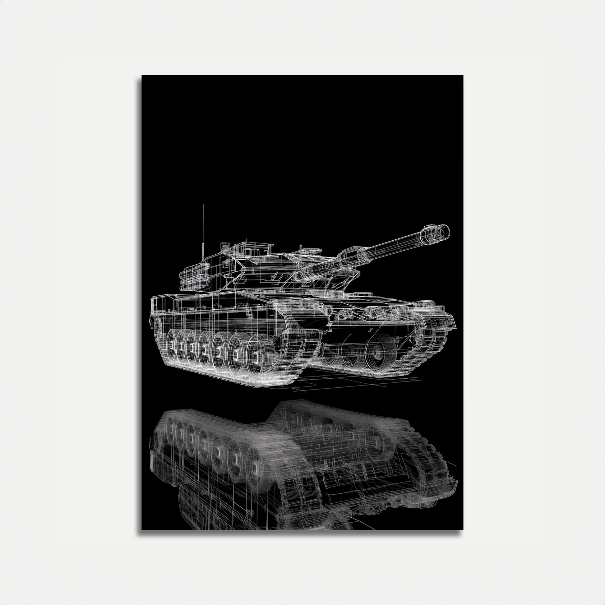 Dive into the intricate engineering of a powerful battle tank with this stunning wireframe technical illustration. Rendered in crisp white lines against a deep black background, this poster captures the complex mechanical details of a modern armored vehicle with breathtaking precision. The transparent wire-mesh design reveals every mechanical nuance, creating a mesmerizing blueprint-like visual that will captivate military technology enthusiasts and design lovers alike.