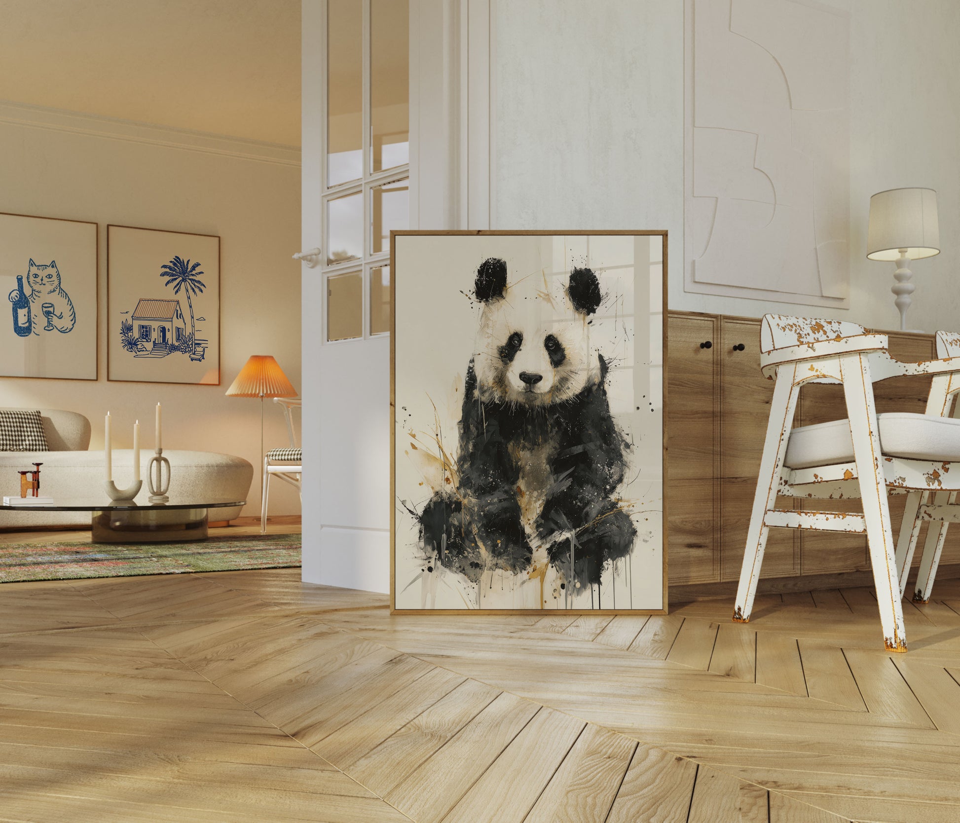 Immerse yourself in this captivating watercolor-style panda artwork that blends raw emotion with artistic expression. The stunning portrait captures the panda's soulful eyes and distinctive black and white markings through a dynamic splash of paint and ink techniques. Dramatic splatter effects and organic color variations bring this majestic creature to life with incredible depth and intensity.