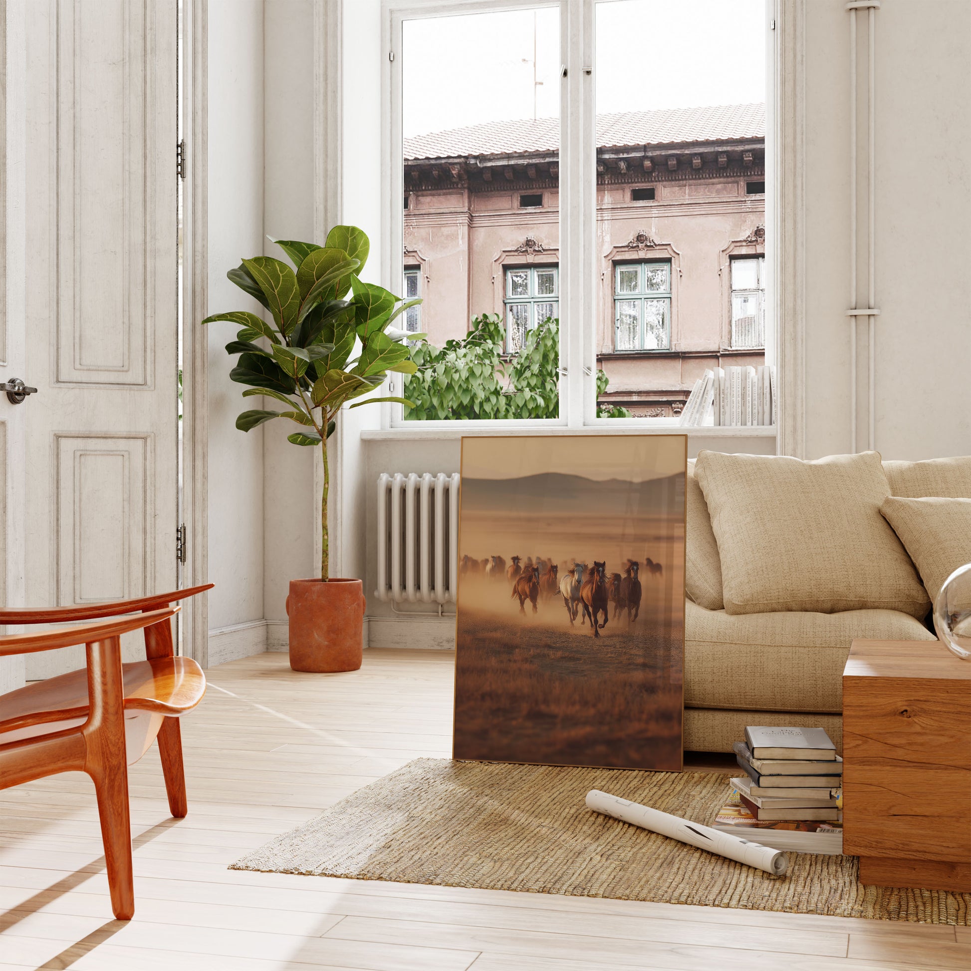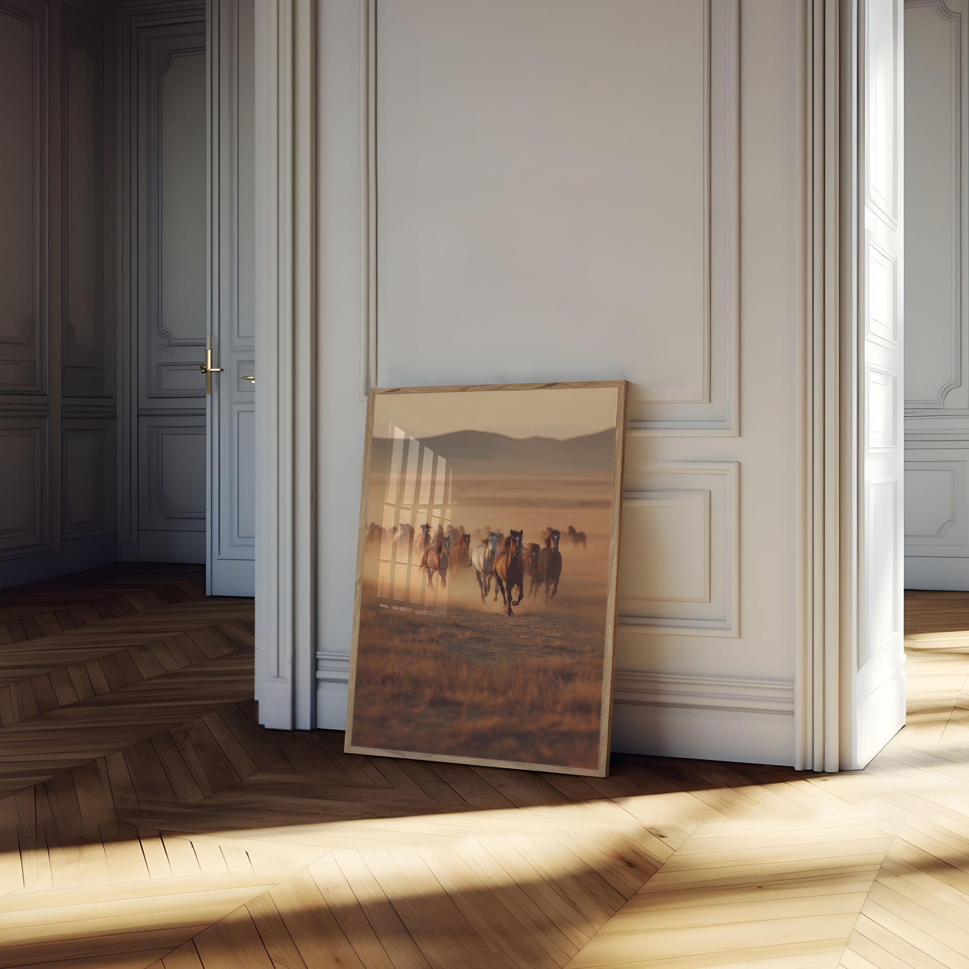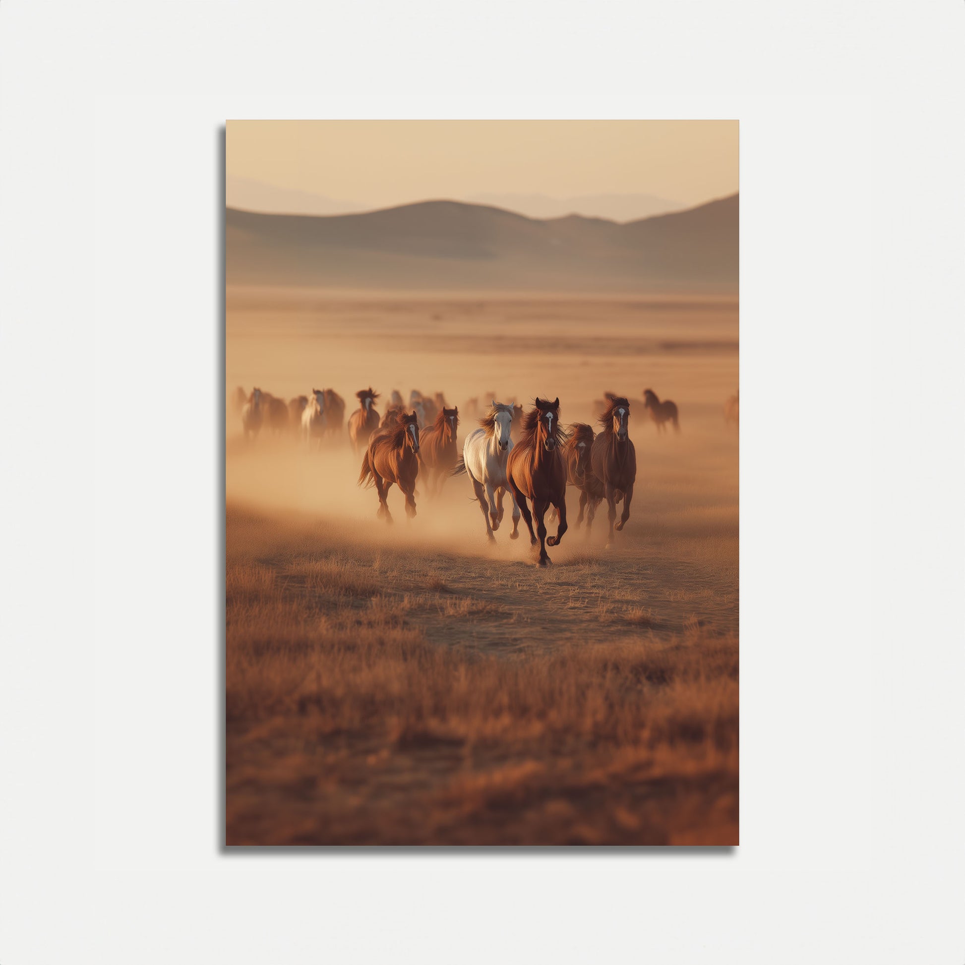 Experience the raw beauty of wild horses thundering across an expansive desert landscape. This stunning photograph captures a herd of majestic horses running through golden-hued grasslands, with misty mountains creating a breathtaking backdrop. The dust swirling around their powerful hooves evokes a sense of freedom and untamed wilderness.