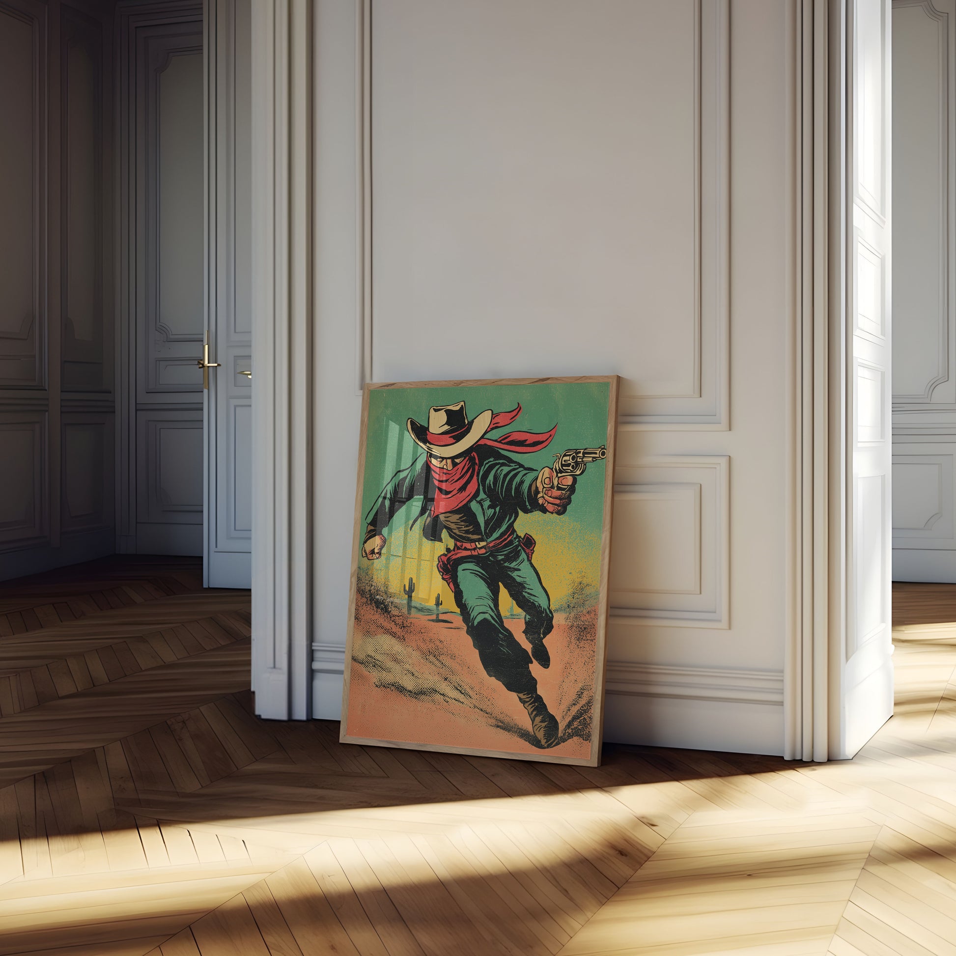Step into the rugged world of the American frontier with this dynamic vintage-style poster featuring a daring cowboy in mid-action. Dressed in a cream cowboy hat, red scarf, and green clothing, the figure charges across a desert landscape with cacti and a dramatic sunset, revolver drawn and ready for adventure. The image captures the raw energy and excitement of the Old West with its bold colors and graphic comic book-inspired style.