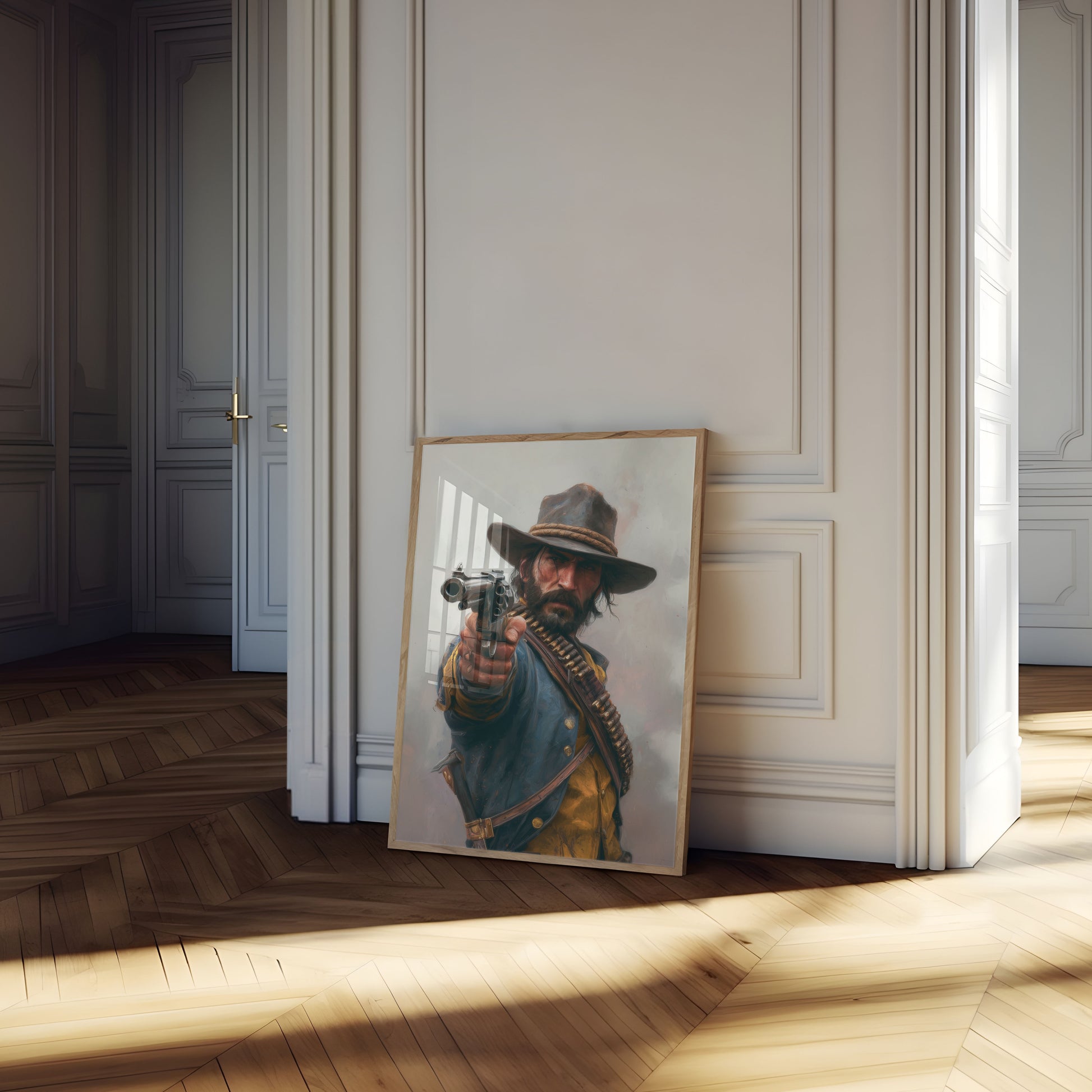 A powerful portrait of a rugged cowboy with intense eyes, pointing a revolver directly at the viewer. Dressed in a blue and yellow jacket and a weathered hat, this gunslinger embodies the raw spirit of the American frontier. The dramatic painting captures the tension and danger of the Wild West era with remarkable detail and atmospheric smoke.