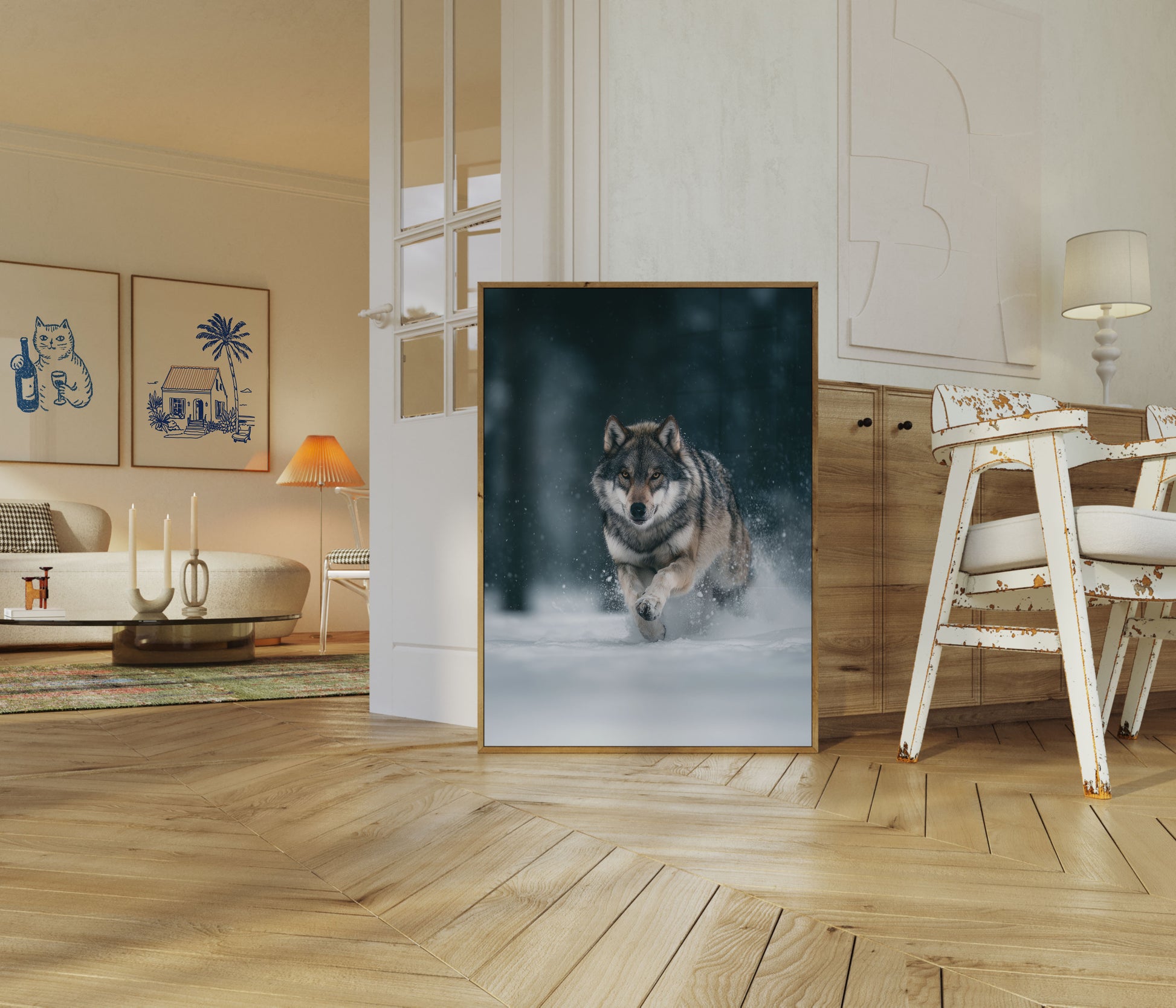 Capture the raw power and beauty of a wolf racing through a snow-covered winter landscape. This stunning wildlife photograph showcases a majestic wolf mid-stride, with snowflakes swirling around its muscular form against a dark, misty forest background. The intense gaze and dynamic motion bring the spirit of the wilderness directly into your living space.