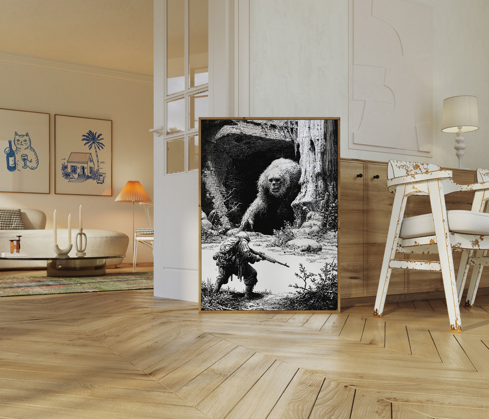 A dramatic black and white illustration depicting a tense standoff between a soldier and a massive, mysterious furry creature in a dense forest setting. The towering creature looms menacingly near a rocky landscape, while the armed figure crouches defensively, creating an atmosphere of primal tension and survival.