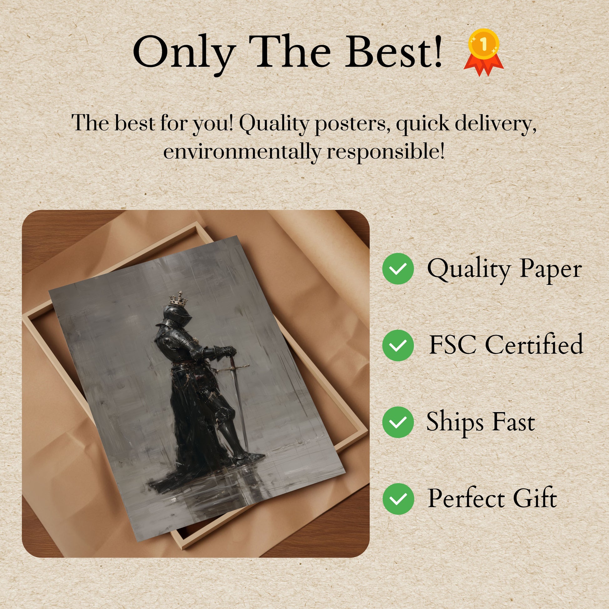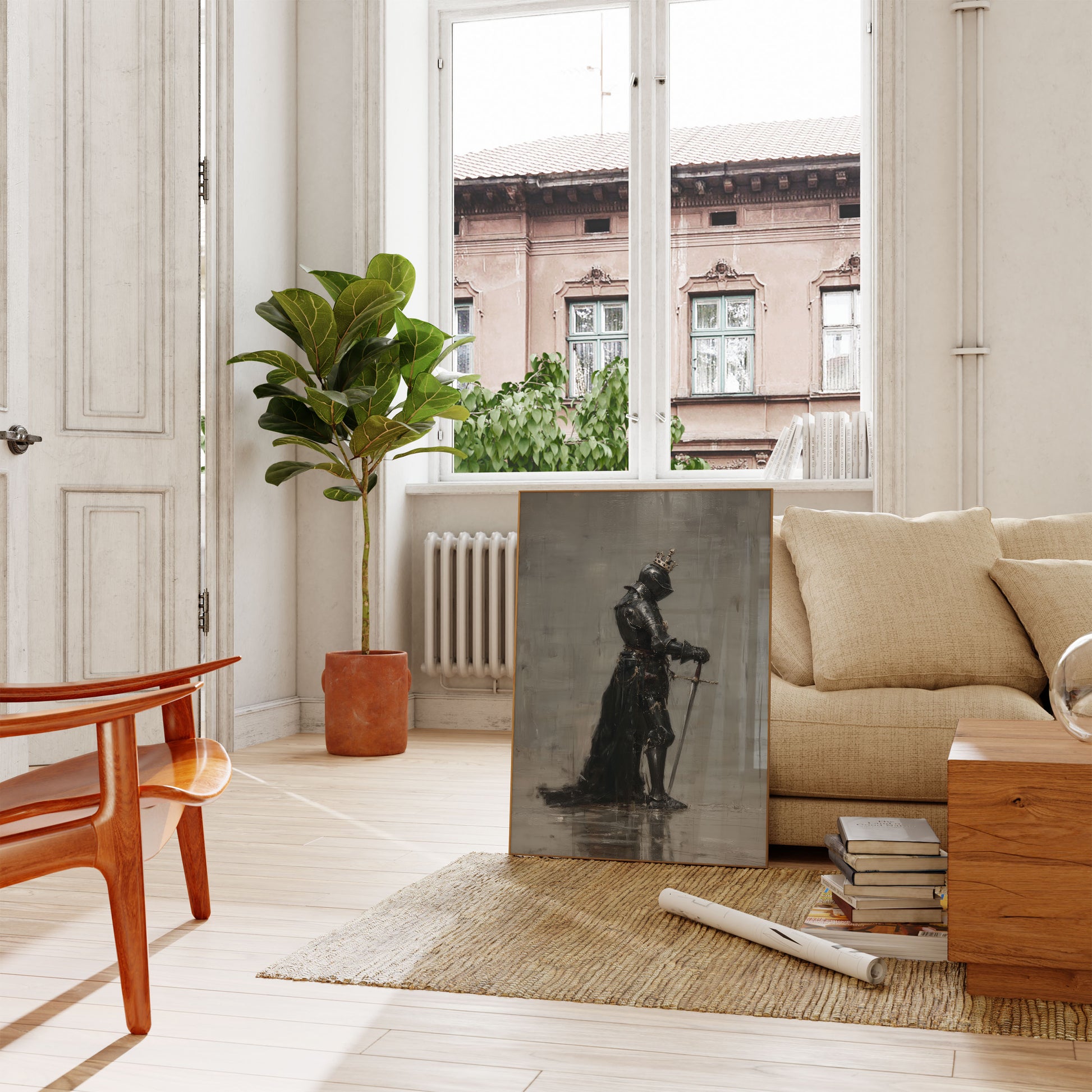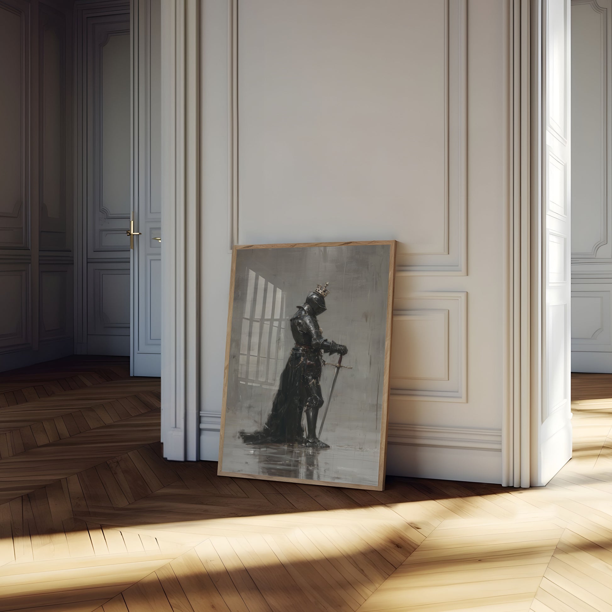 A haunting medieval warrior stands resolute in battle-worn armor, crowned with regal authority yet marked by struggle. This atmospheric art piece captures a solitary knight leaning on his sword, reflected in a misty, rain-soaked landscape that speaks to inner strength and silent determination. The monochromatic palette of grays and blacks creates a powerful, somber mood that draws the viewer into the knight's silent narrative.