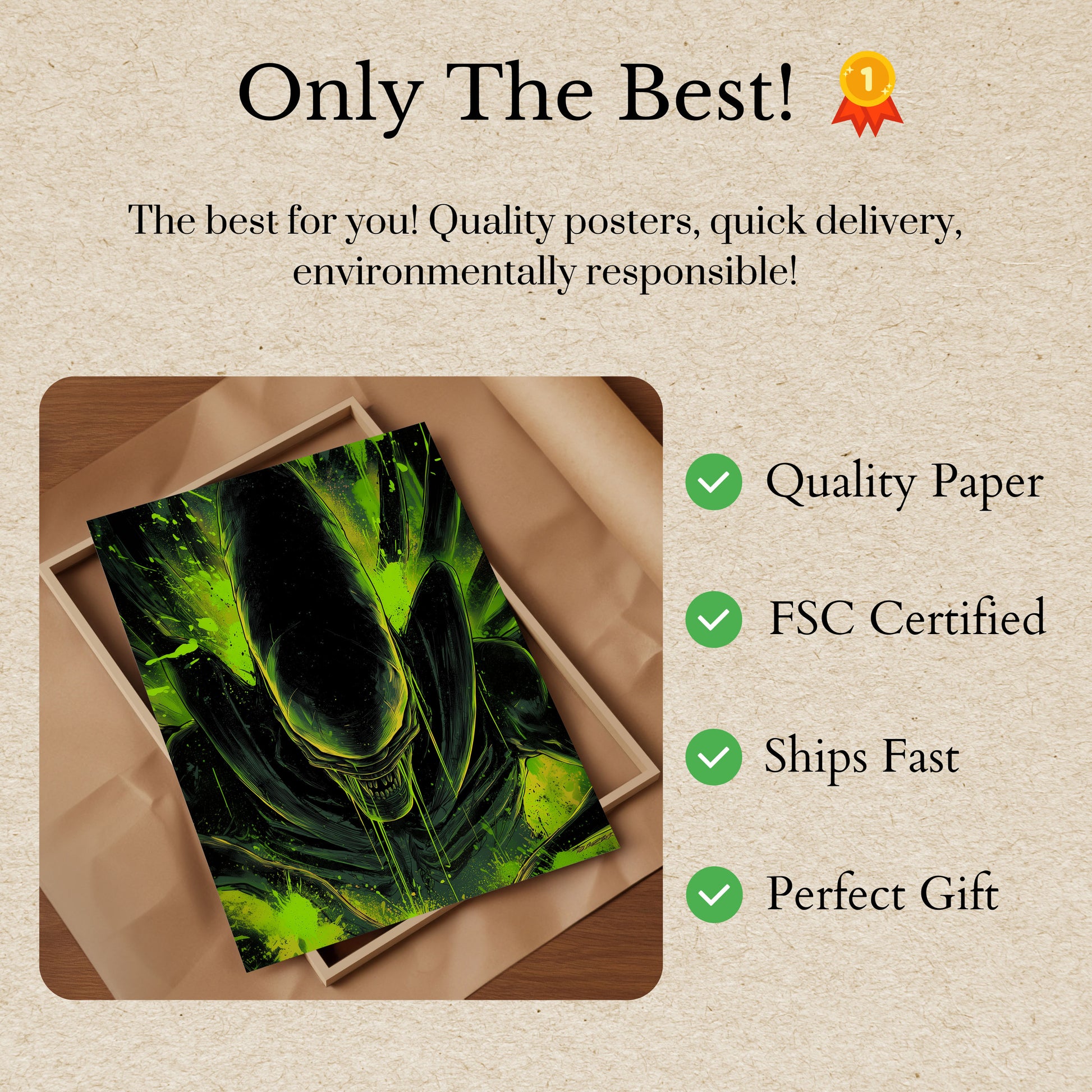 Immerse yourself in the terrifying world of extraterrestrial horror with this electrifying Alien poster. Featuring a menacing xenomorph rendered in explosive green and black hues, the artwork captures the raw, primal intensity of the legendary sci-fi monster. Dripping with toxic energy and razor-sharp details, this poster brings the ultimate predator to life with visceral, spine-chilling impact.