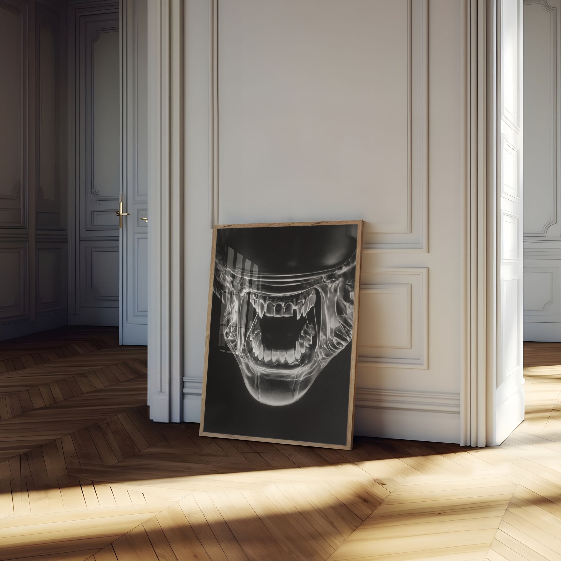 Captured in haunting black and white, this stunning close-up reveals the terrifying biomechanical details of an alien creature's menacing mouth. The high-contrast image showcases razor-sharp teeth and intricate textural details, creating an intense and visceral visual experience that will send chills down your spine.