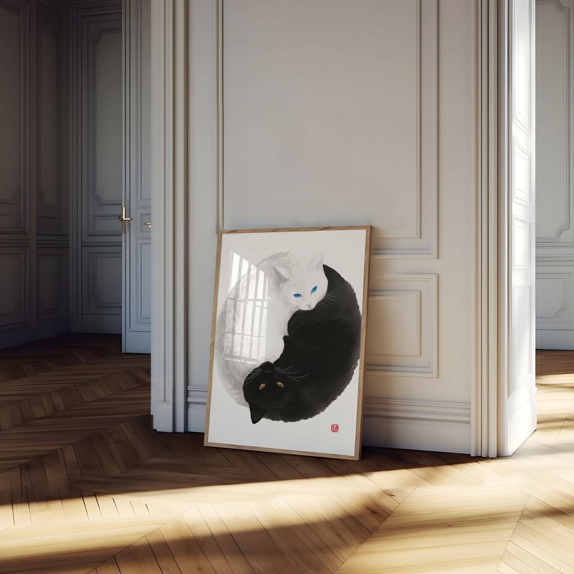 A mesmerizing artwork depicting two cats - one pure white and one deep black - positioned in a perfect circular harmony reminiscent of the classic yin yang symbol. The white cat boasts striking blue eyes, while the black cat gazes with golden amber eyes, creating a stunning visual balance of contrasting colors and energies. This elegant illustration captures the delicate interplay of light and dark, showcasing feline grace and philosophical symbolism.