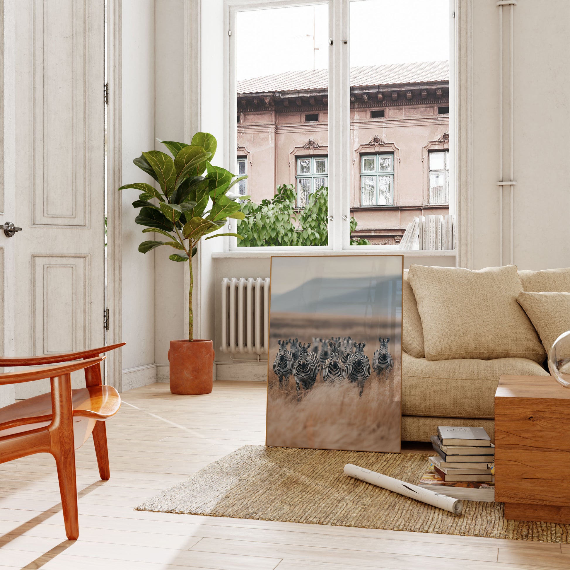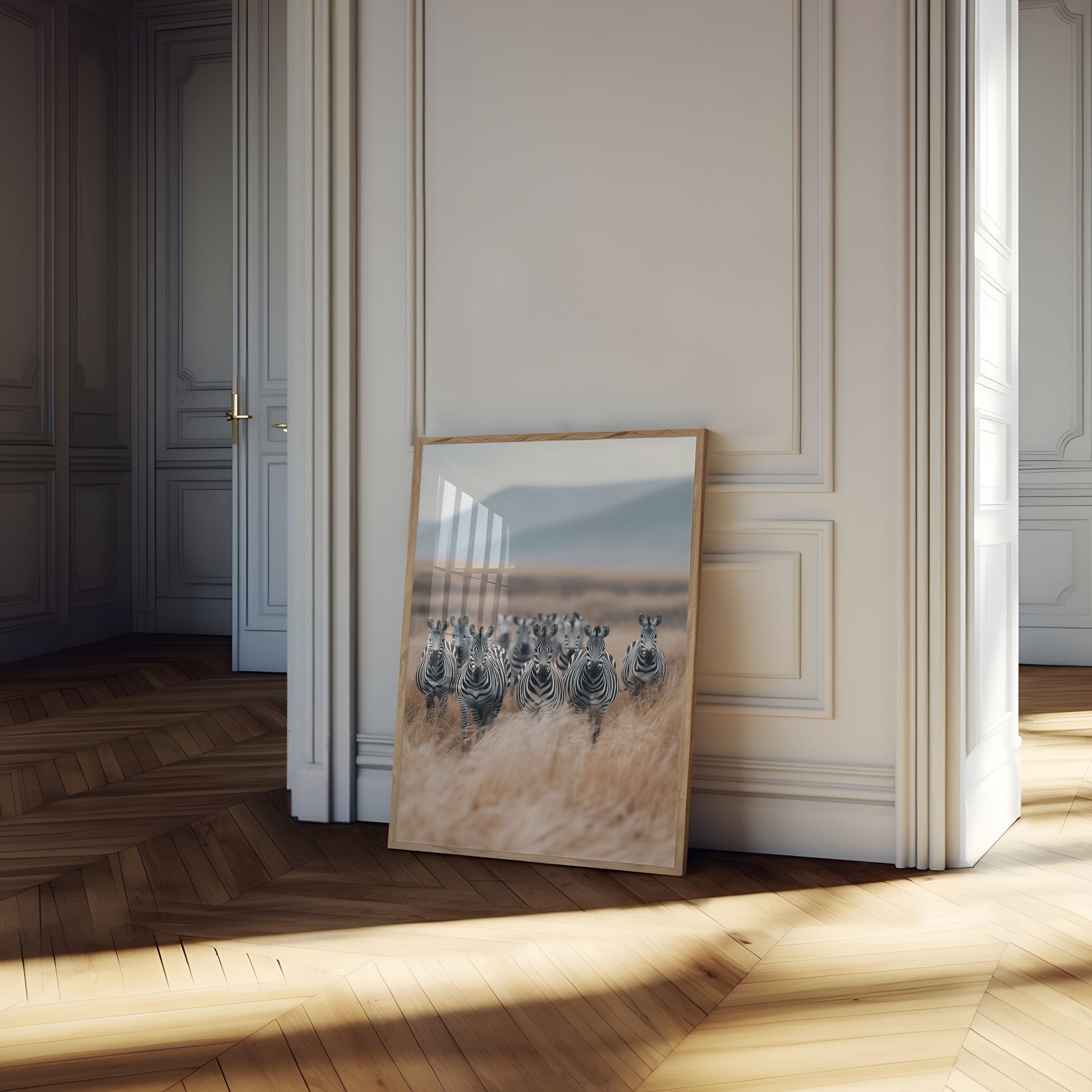 Immerse yourself in the raw beauty of the African savanna with this stunning zebra herd photograph. A mesmerizing cluster of black and white striped beauties stands confidently amid golden grasslands, with misty mountain ranges softly blurring in the background. The image captures the remarkable unity and strength of these magnificent creatures in their natural habitat.