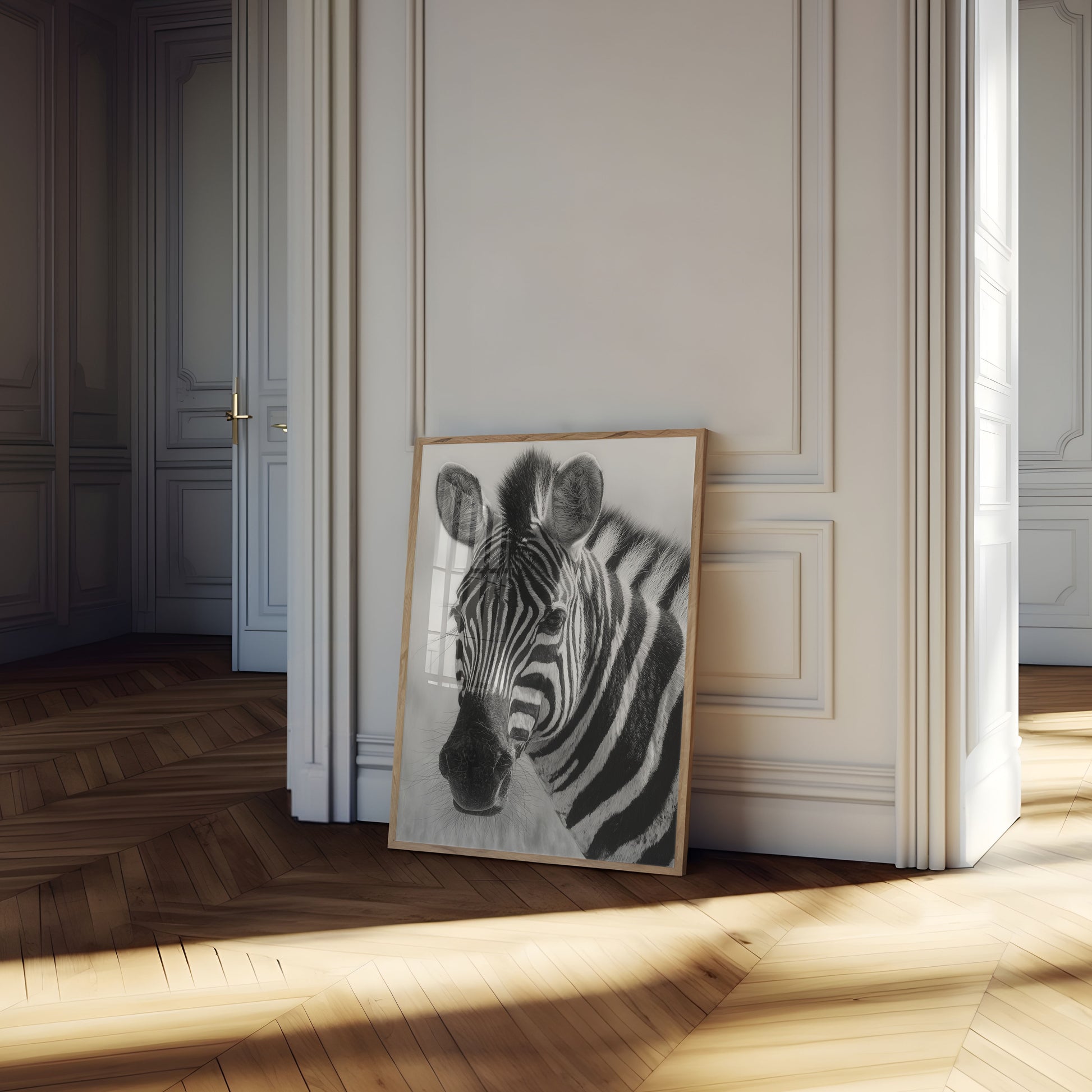 Immerse yourself in the stunning detail of this mesmerizing zebra portrait, capturing the intricate patterns and textures of one of nature's most iconic animals. The high-contrast black and white image reveals the zebra's unique striped coat with incredible realism, highlighting every fine hair and subtle nuance of this magnificent creature. This striking artwork brings the wild beauty of the African savanna directly into your living space with breathtaking clarity and artistic precision.