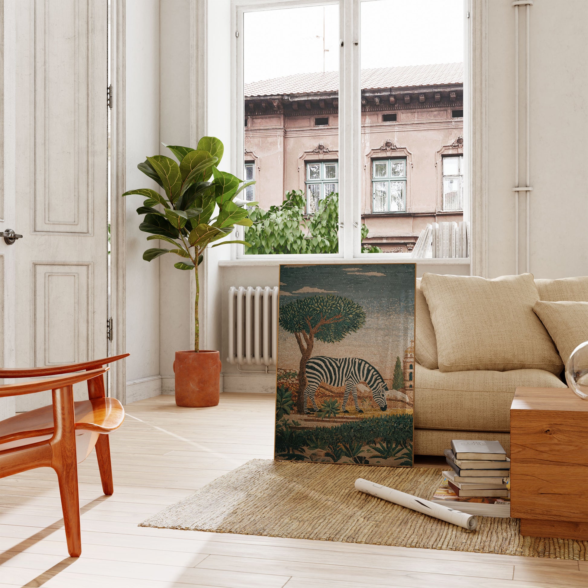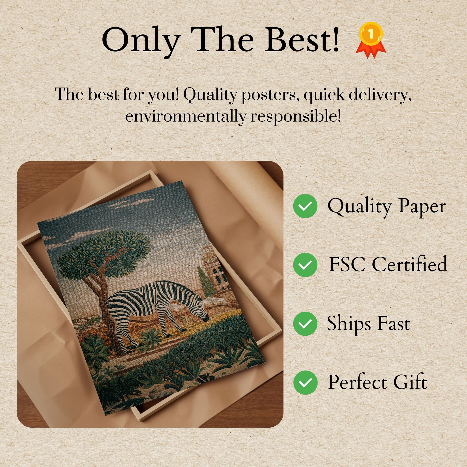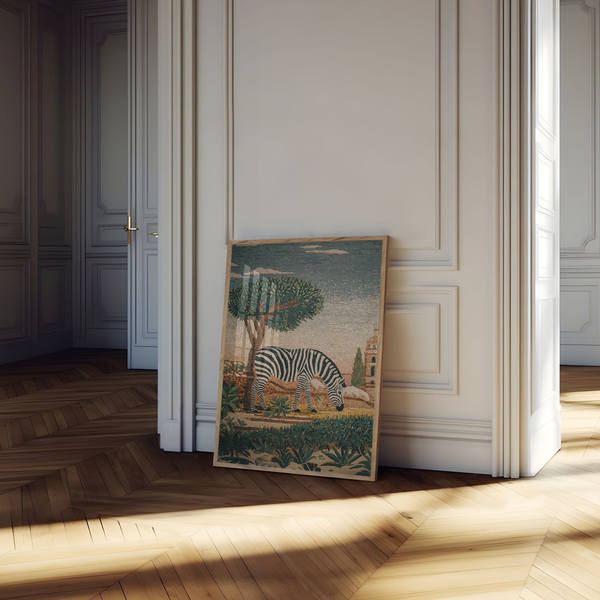 Step into a mesmerizing mosaic world where a striking zebra grazes peacefully beneath a lush green tree, surrounded by a serene landscape. This intricate artwork transforms traditional tile work into a captivating scene, blending natural beauty with artistic precision. The delicate mosaic technique brings depth and texture to every stripe and leaf, creating a stunning visual narrative that transports viewers to a tranquil, sun-drenched environment.