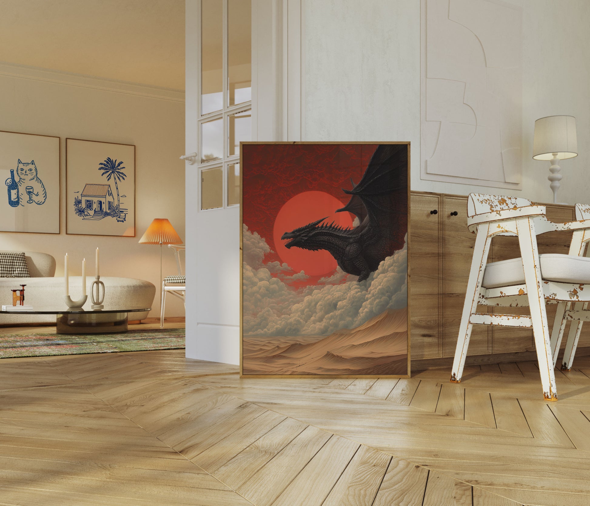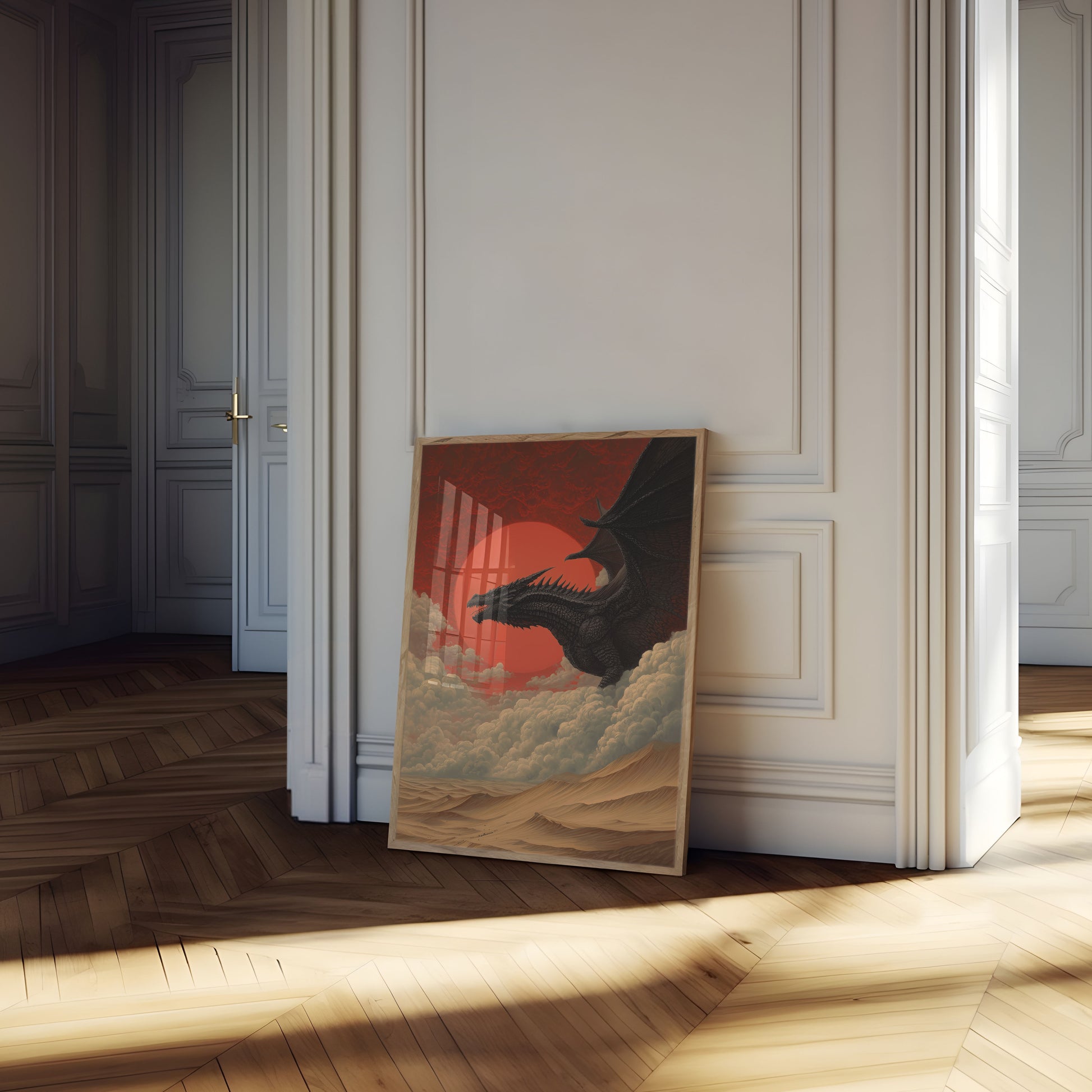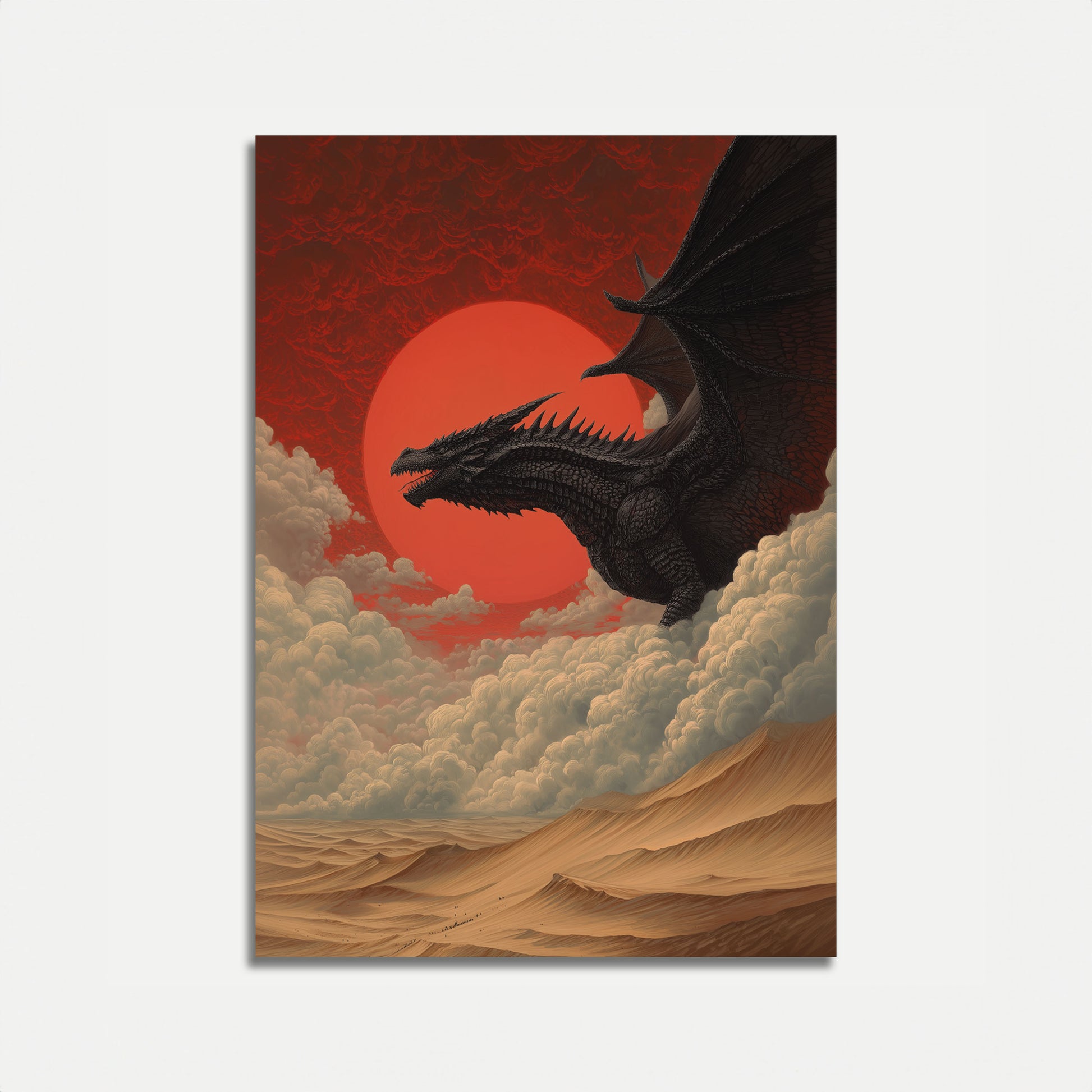 Um dragão negro majestoso voa contra um pôr do sol vermelho-sangue, lançando uma sombra ameaçadora sobre uma vasta paisagem desértica. Nuvens ondulantes criam um cenário dramático, enquanto as asas escamosas e o contorno afiado da criatura feroz chamam a atenção no céu carmesim intenso. Esta arte poderosa captura a essência mítica e crua da mitologia dos dragões.