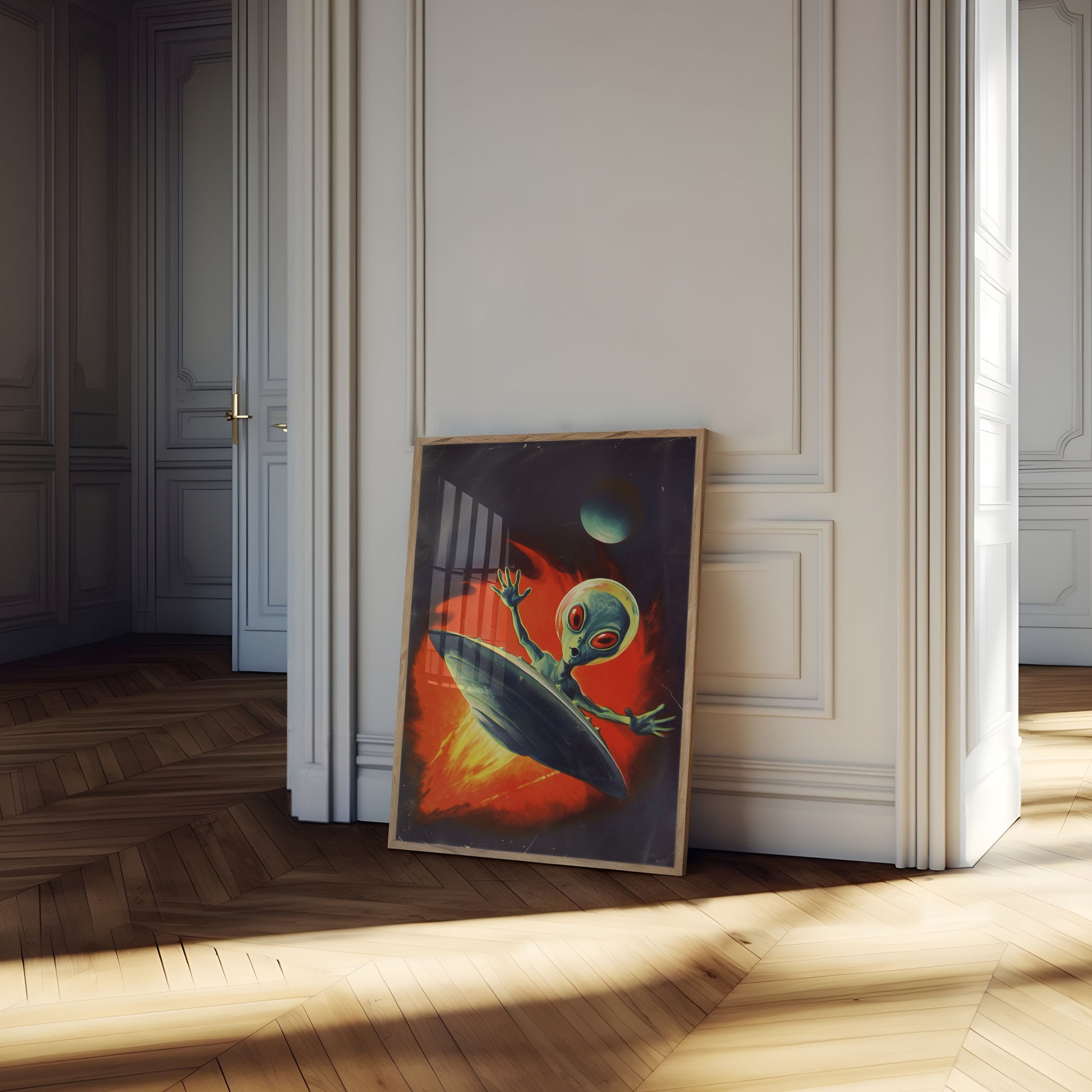 Lance-se em uma aventura extrassensorial surreal com este pôster de ficção científica vibrante, apresentando um alienígena azul-esverdeado surfando através do espaço cósmico ardente. A obra captura uma cena de outro mundo com fundos intensos em vermelho e laranja, cenário planetário dramático e um personagem alienígena expressivo montando o que parece ser uma nave espacial ou prancha de surf elegante. Ousado, dinâmico e completamente cativante, este pôster traz uma fatia eletrificante de imaginação retro-futurista para qualquer parede.
