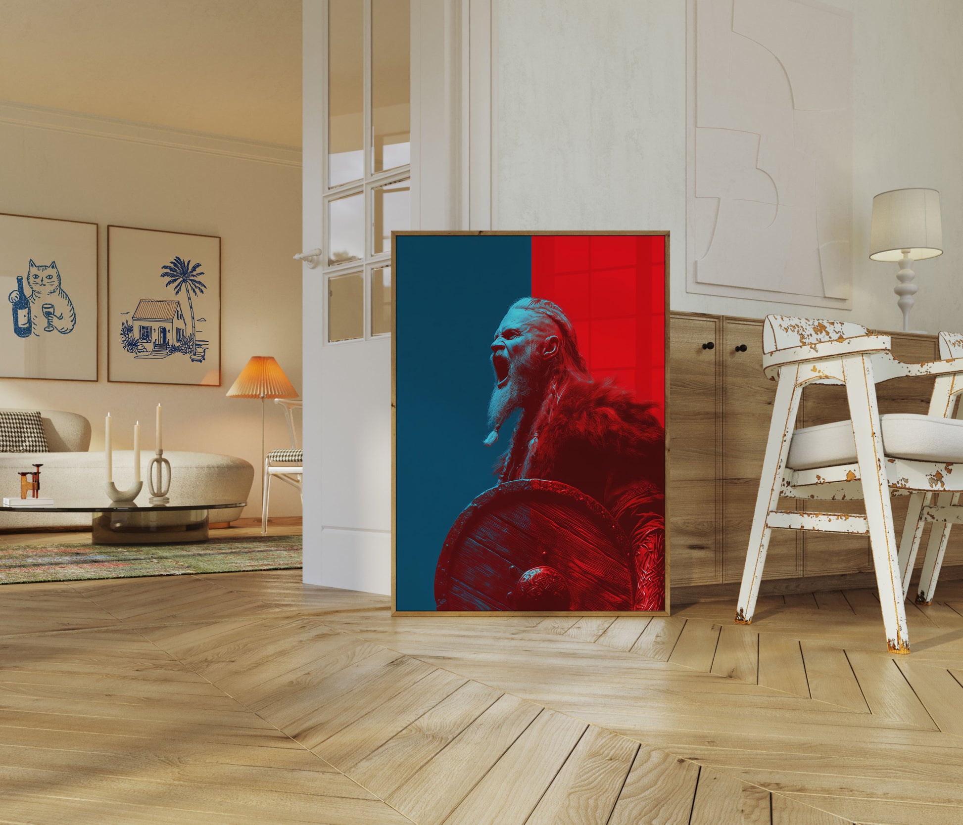 Experimente o poder bruto de um guerreiro Viking neste retrato intenso de cores divididas que captura a energia primordial da cultura nórdica antiga. A imagem se divide dramaticamente entre azul profundo e vermelho ardente, mostrando um guerreiro feroz, barbudo, com um grito poderoso e roupas tradicionais de pele. A paleta de cores dinâmica e a emoção crua criam uma imagem deslumbrante que traz a intensidade Viking à vida.