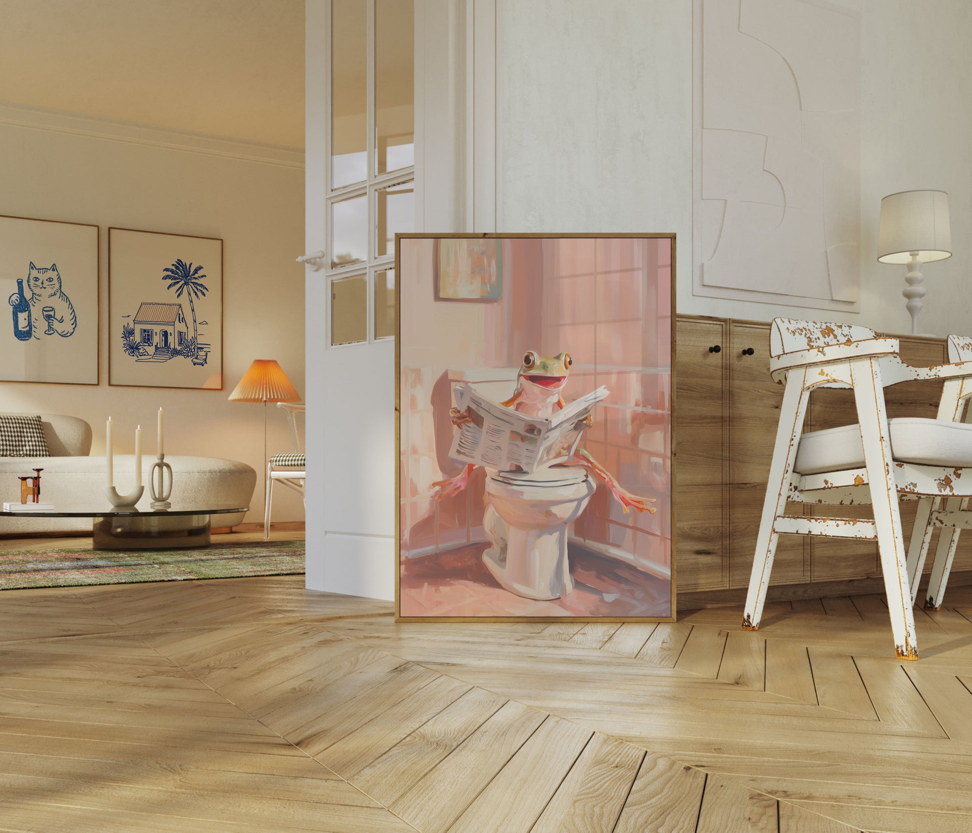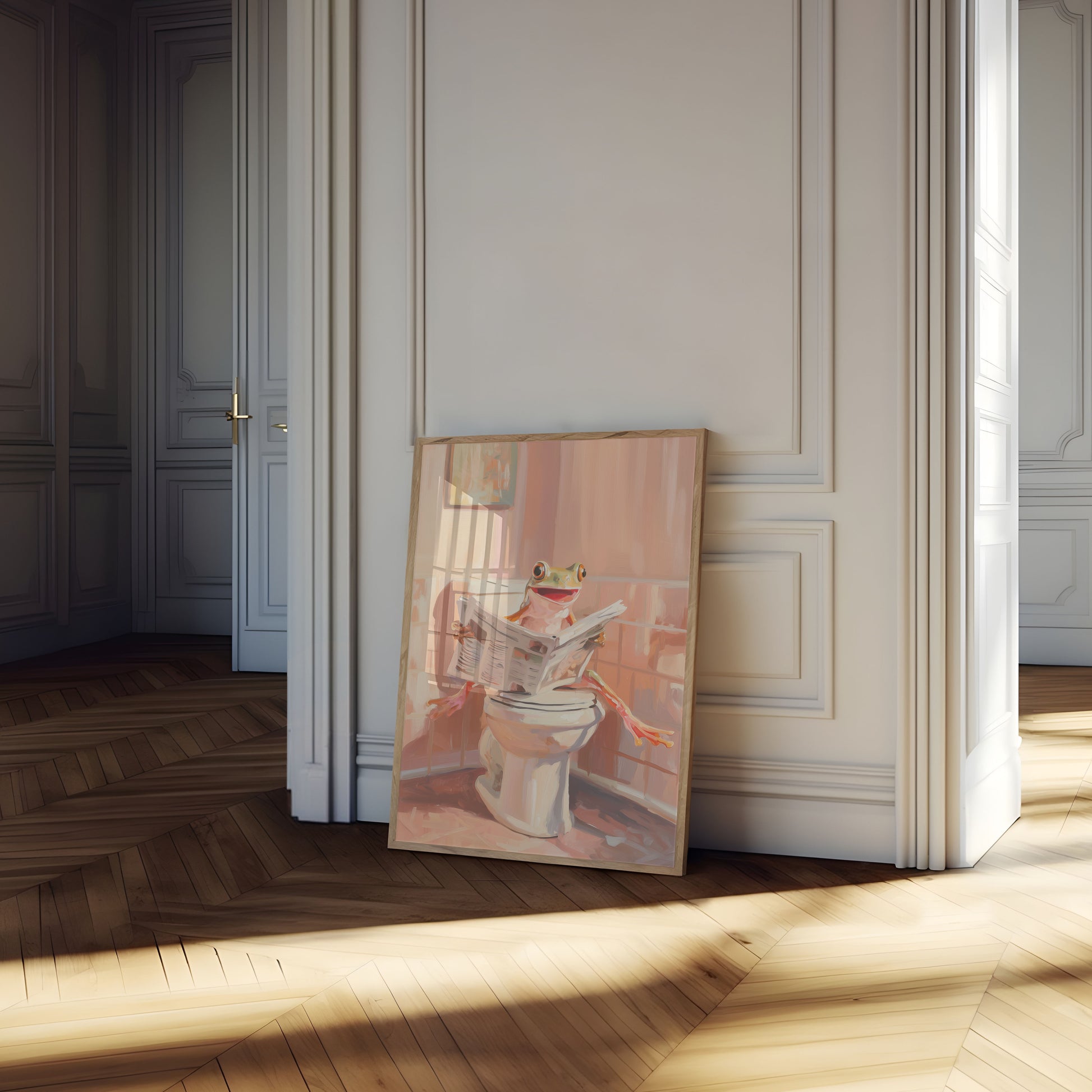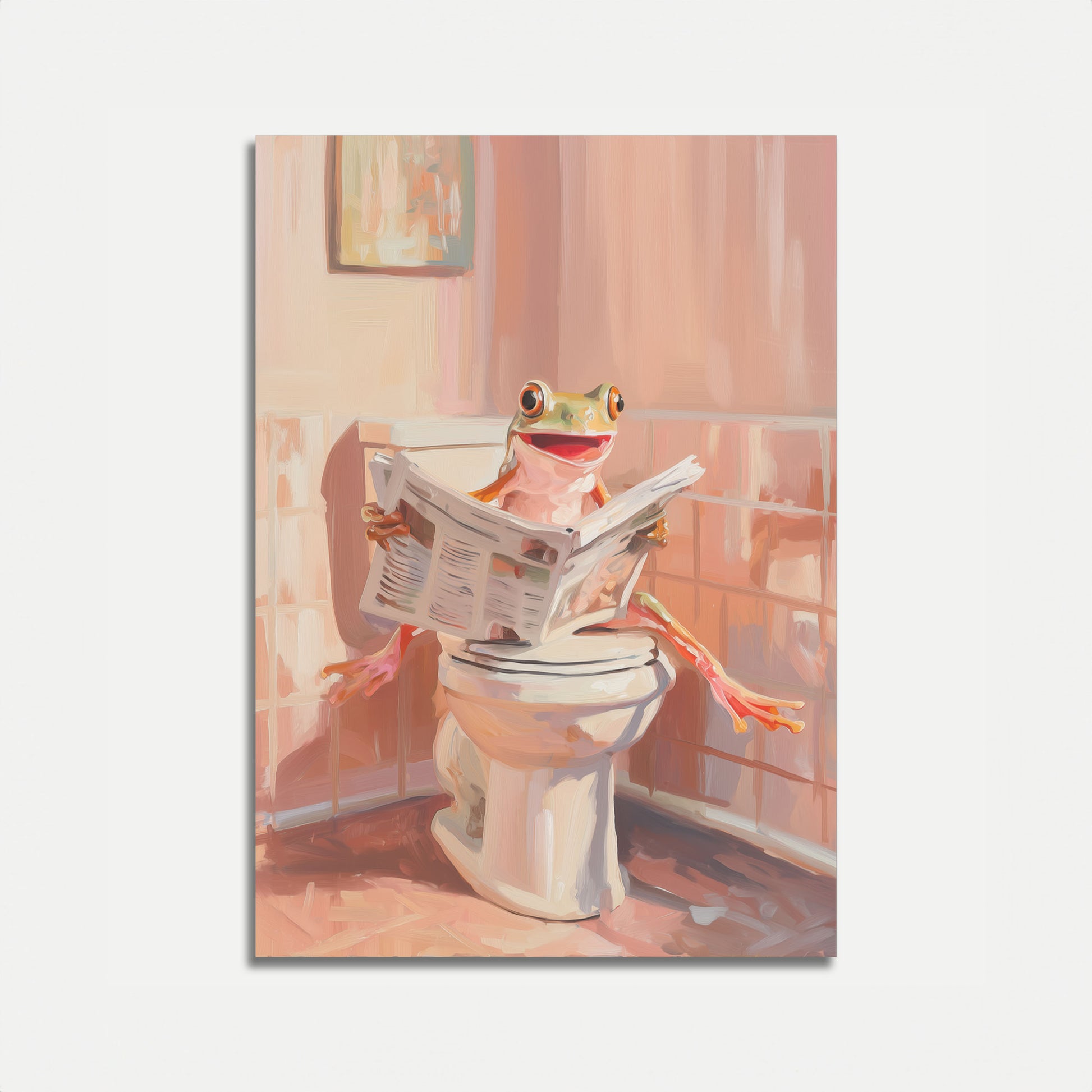 Esta ilustração encantadora e bem-humorada captura um momento delightful de um sapo alegre sentado em um vaso sanitário, absorto na leitura do jornal da manhã. Os tons quentes de pêssego e coral criam uma atmosfera de banheiro aconchegante e descontraída que traz personalidade e humor para qualquer espaço. Com sua expressão brincalhona e cena cotidiana relatable, este pôster Sapo Lendo Jornal é perfeito para adicionar um toque de fantasia e humor a banheiros, quartos infantis ou qualquer espaço que celebre o lado engraçado da vida.