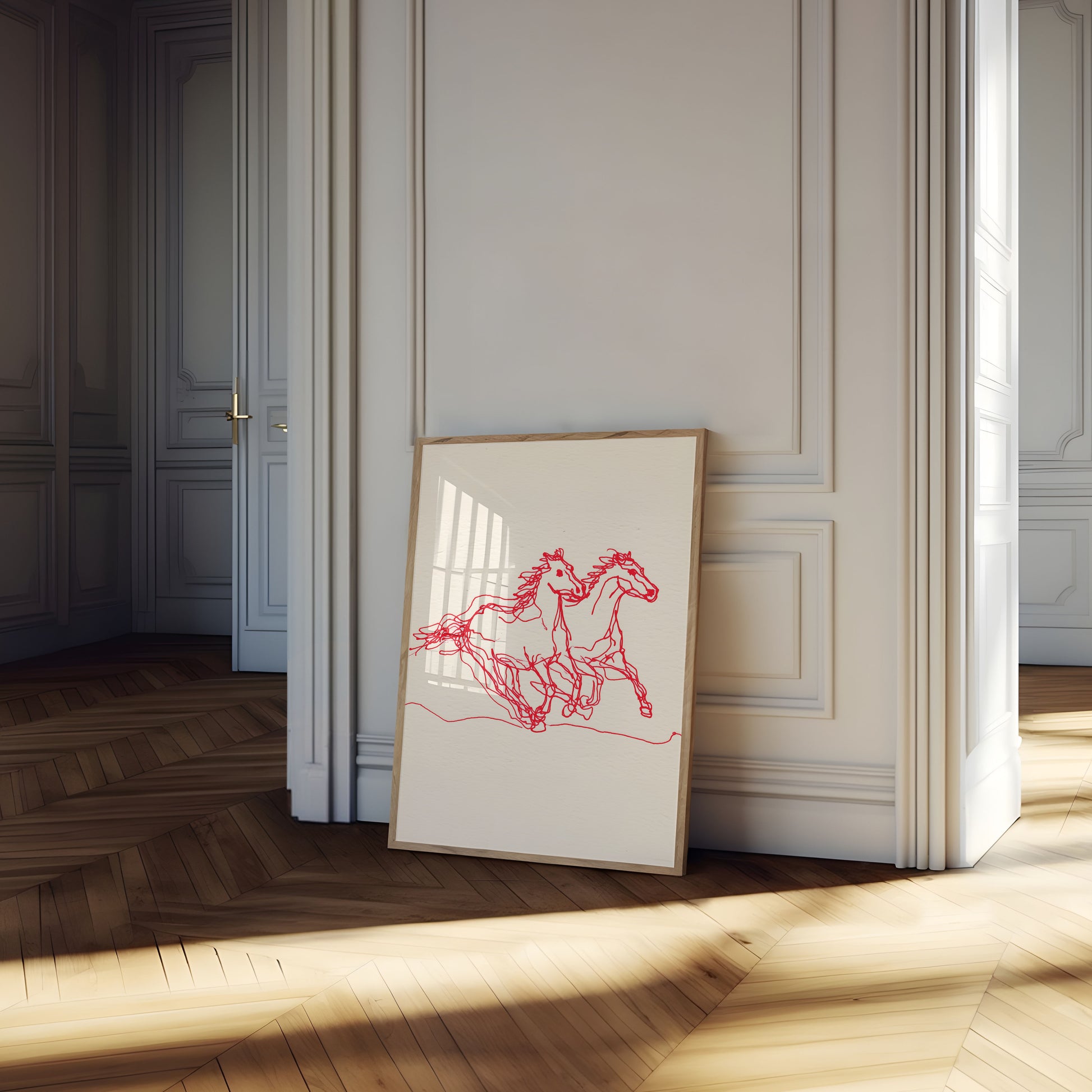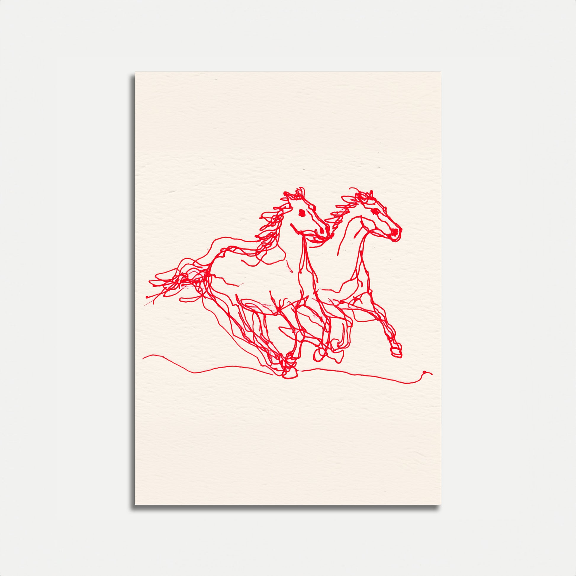 Esta impressionante arte em linha vermelha captura o movimento dinâmico de dois cavalos correndo juntos, suas crinas fluidas e formas musculosas se entrelaçando em uma composição fluida e enérgica. O desenho minimalista em vermelho sobre um fundo de creme suave cria uma sensação de movimento e expressão artística bruta, trazendo o poder e a graça dos cavalos à vida através de linhas simples e expressivas.