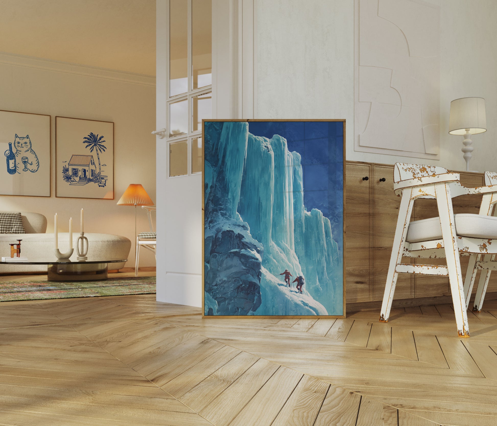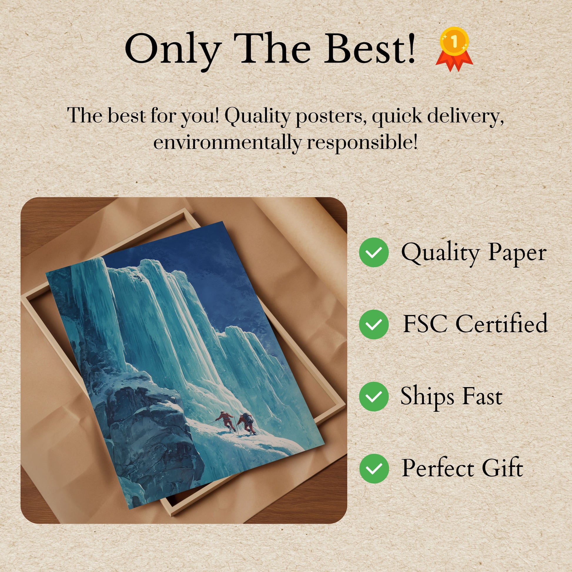 Descubra o mundo deslumbrante do escalamento de gelo extremo neste pôster impressionante que captura dois escaladores subindo formações de gelo turquesa imponentes. A paisagem azul dramática revela enormes cascatas congeladas com estruturas intrincadas semelhantes a icicles, mostrando a beleza bruta e o desafio do montanhismo alpino. Cada detalhe captura a atmosfera serena, mas intensa, da exploração invernal em alta altitude.