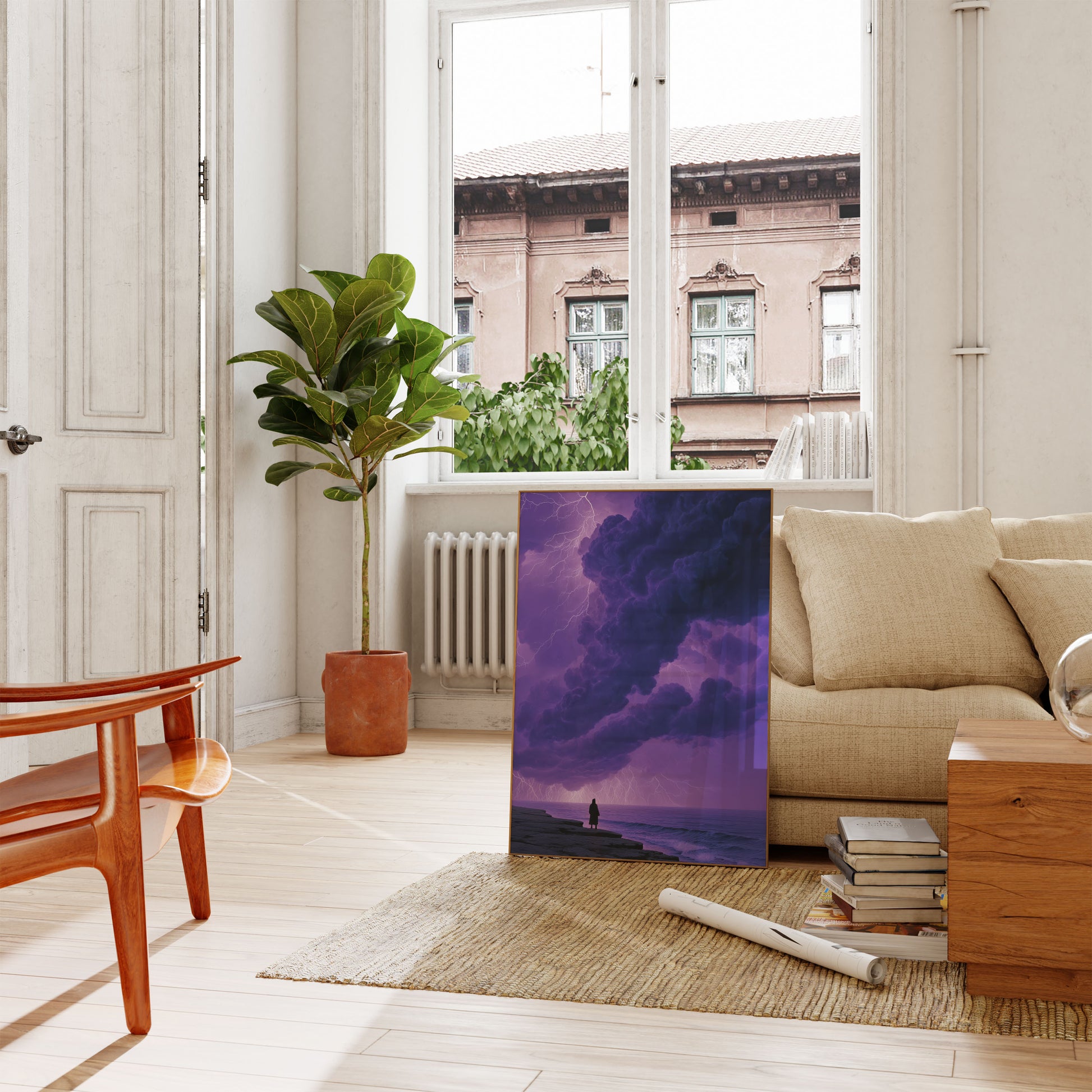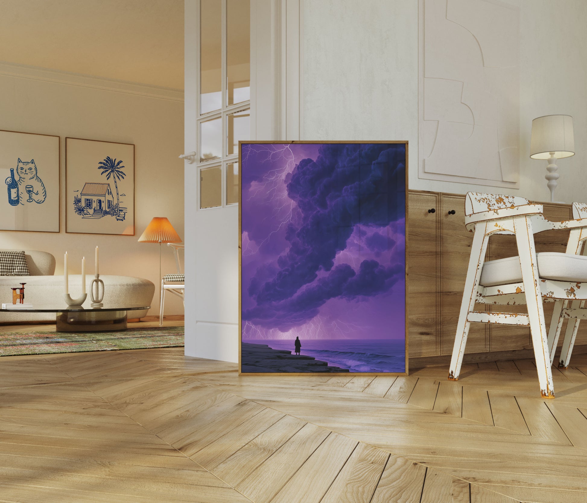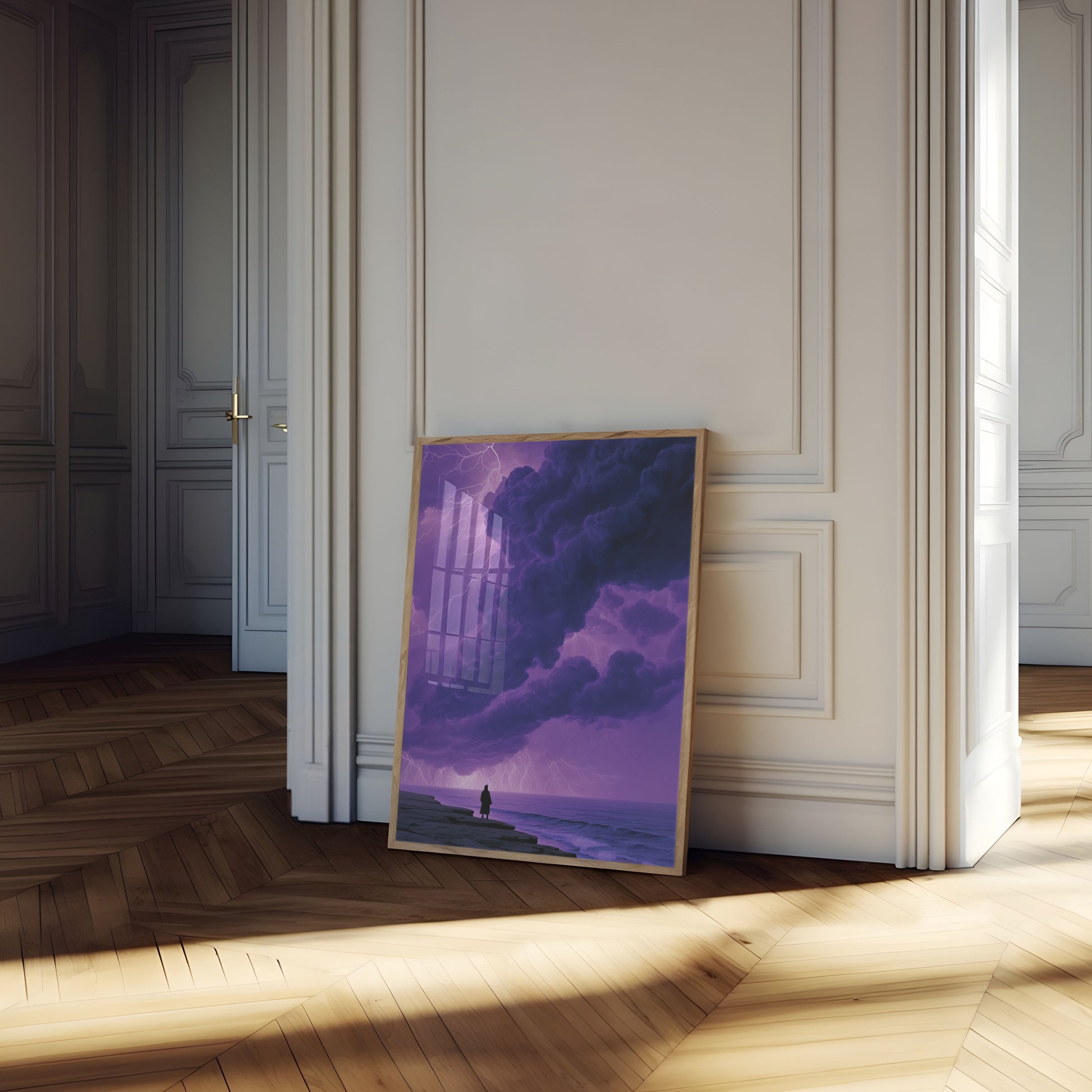 Uma cena assombrada e hipnotizante captura uma figura solitária de pé à beira de uma costa rochosa, contemplando um céu apocalíptico. Nuvens de tempestade imponentes em roxos profundos e azuis meia-noite dominam a composição, enquanto raios brilhantes rasgam o horizonte em tons violeta etéreos. O contraste dramático entre a silhueta solitária e as forças naturais avassaladoras cria um poderoso senso de admiração, contemplação e insignificância humana. Esta obra de arte impressionante evoca sentimentos de mistério, introspecção e a beleza bruta dos momentos mais intensos da natureza—perfeita para quem é atraído por paisagens dramáticas e cenas atmosféricas.