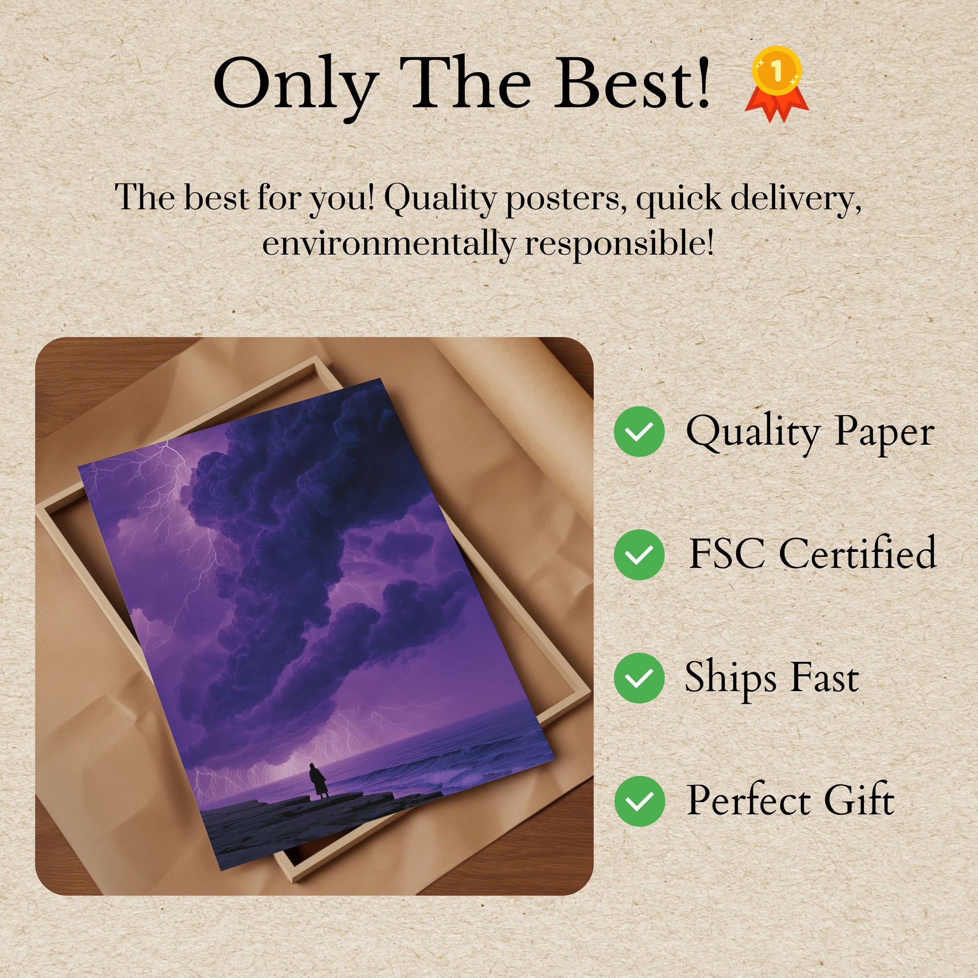Todos os nossos Pôsteres são feitos com papel premium espesso de 170 g/m² certificado FSC para garantir responsabilidade ecológica.