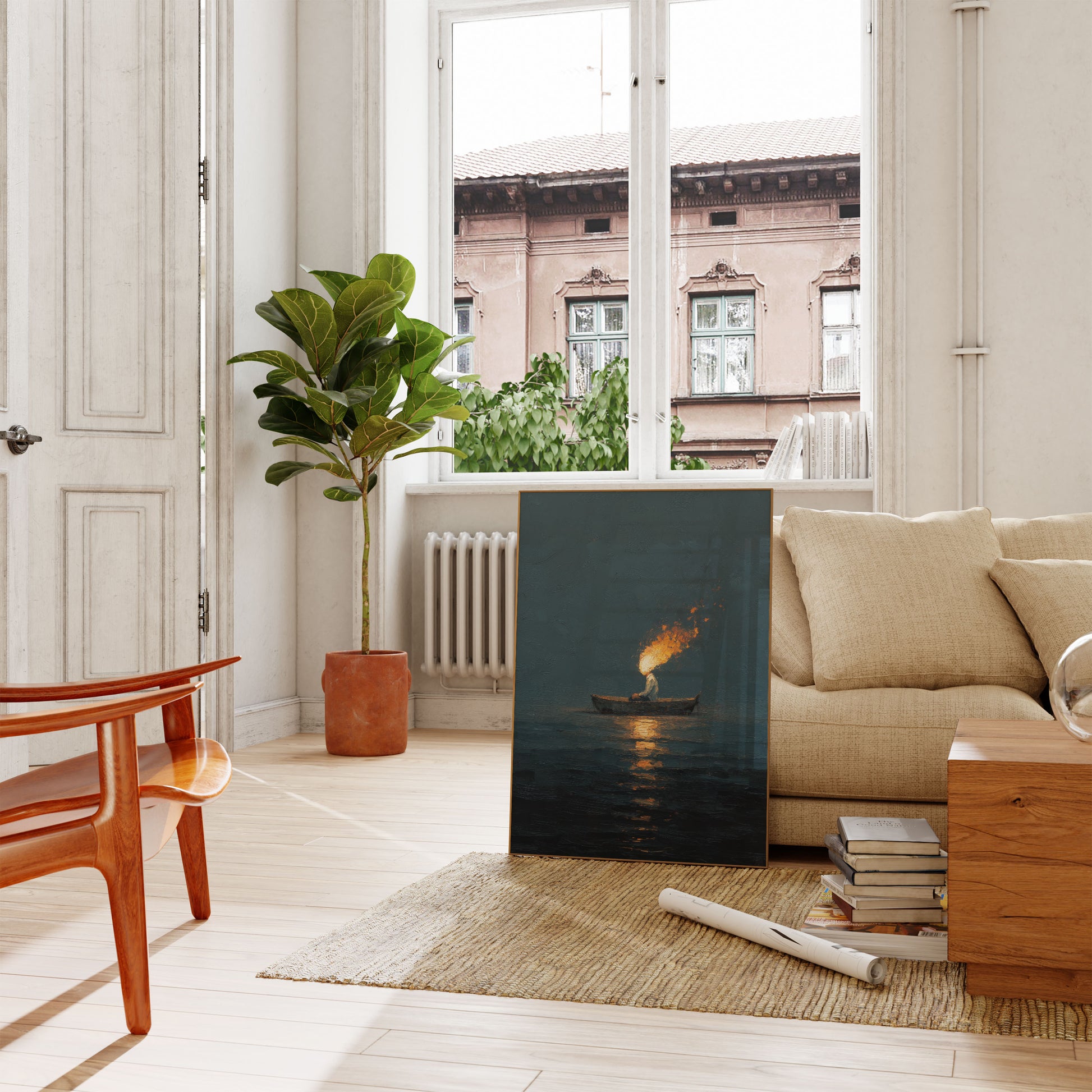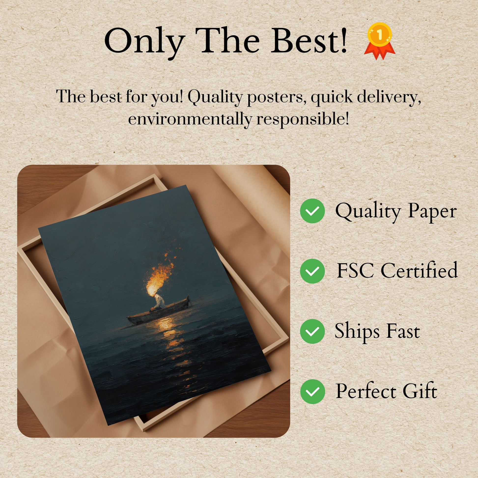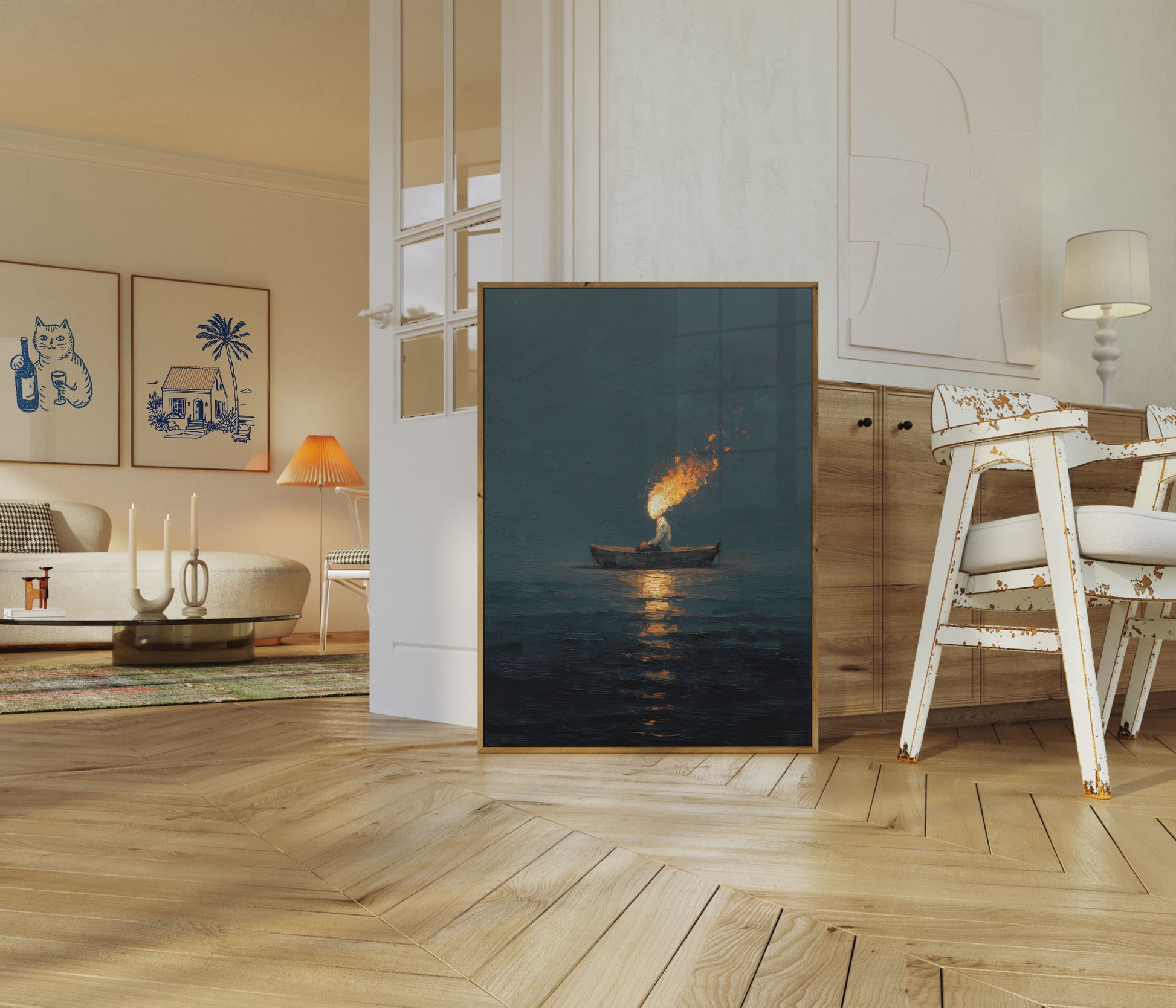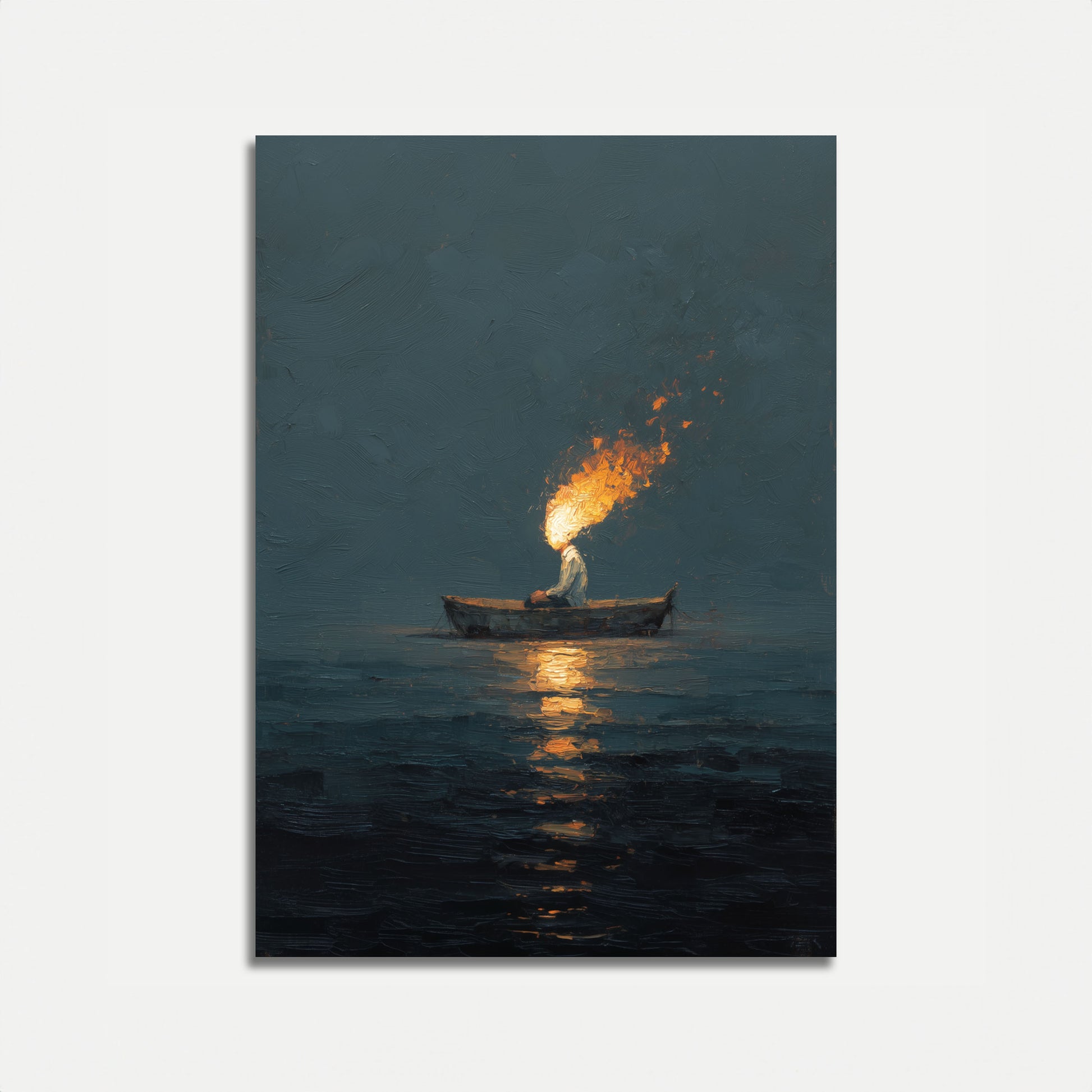 Esta obra assustadora e atmosférica captura uma figura solitária em um pequeno barco, empunhando uma tocha brilhante que atravessa as águas escuras abaixo. As chamas douradas dançam contra os tons frios, suavizados de azul-petróleo e azul do seascape circundante, criando um contraste marcante entre luz e escuridão. A composição evoca um senso de mistério, solidão e determinação silenciosa—quer a figura esteja pescando, procurando, ou simplesmente navegando pela noite. Os reflexos do fogo cintilam na superfície da água, adicionando profundidade e movimento a esta cena serena porém intensa. Perfeito para quem aprecia arte contemplativa e sombria que conta uma história sem palavras.