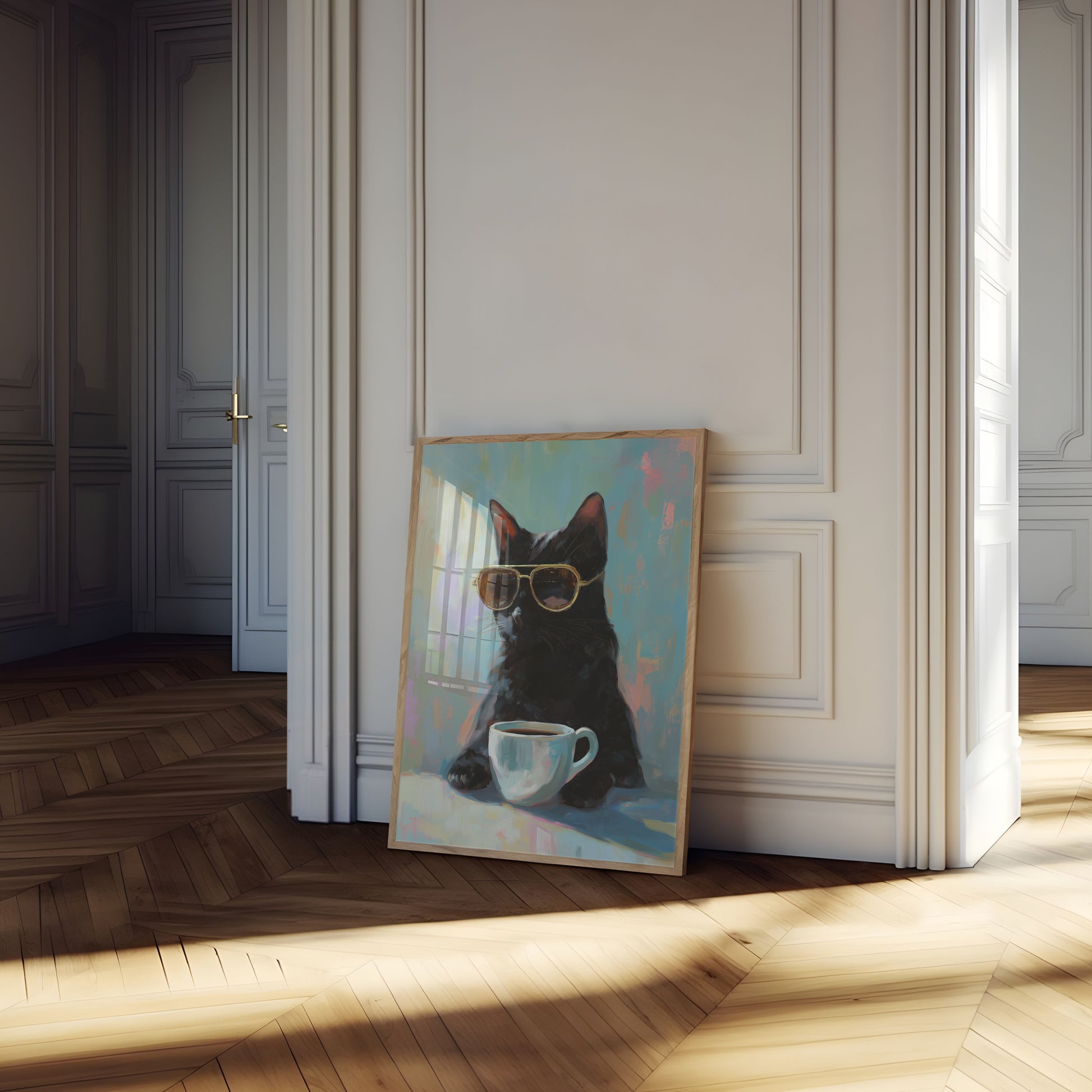 Este gato preto elegante repousa com uma calma descontraída, usando óculos de sol aviador dourados e apreciando uma xícara de café fresca. Contra um fundo pastel sonhador com tons suaves de azul e rosa, a pintura captura um momento de sofisticação felina e relaxamento matinal. A obra combina fantasia e estilo chique em um retrato encantador do charme felino.