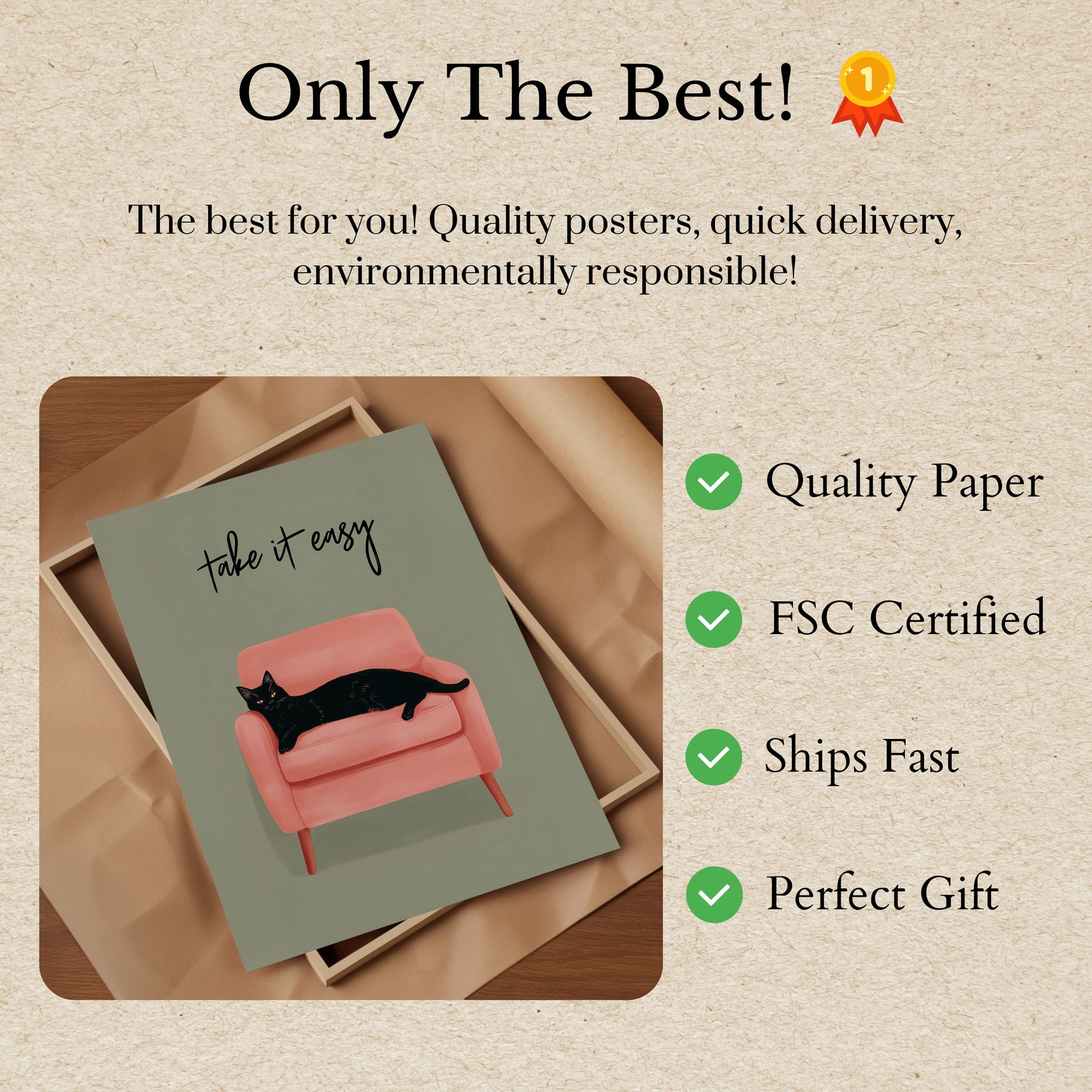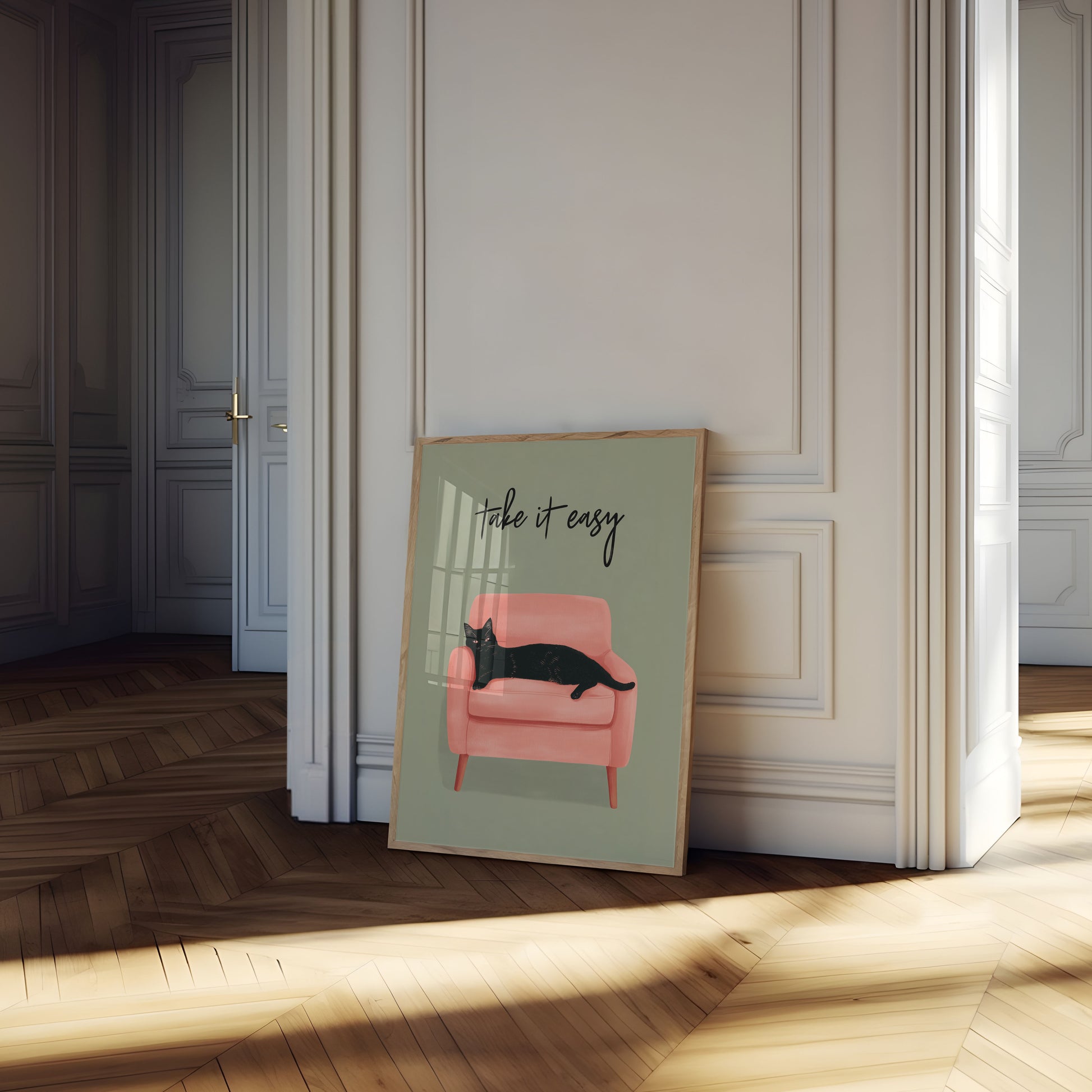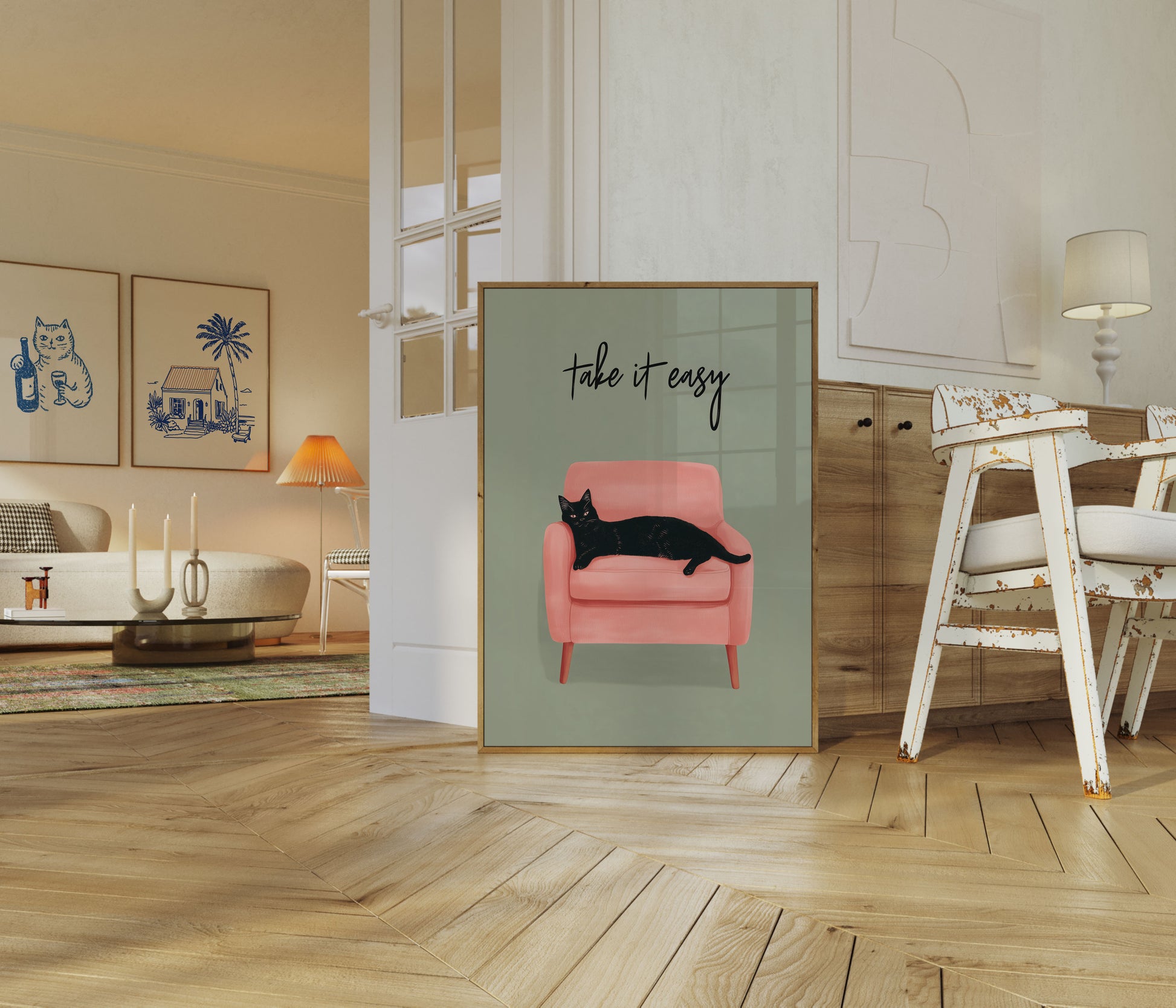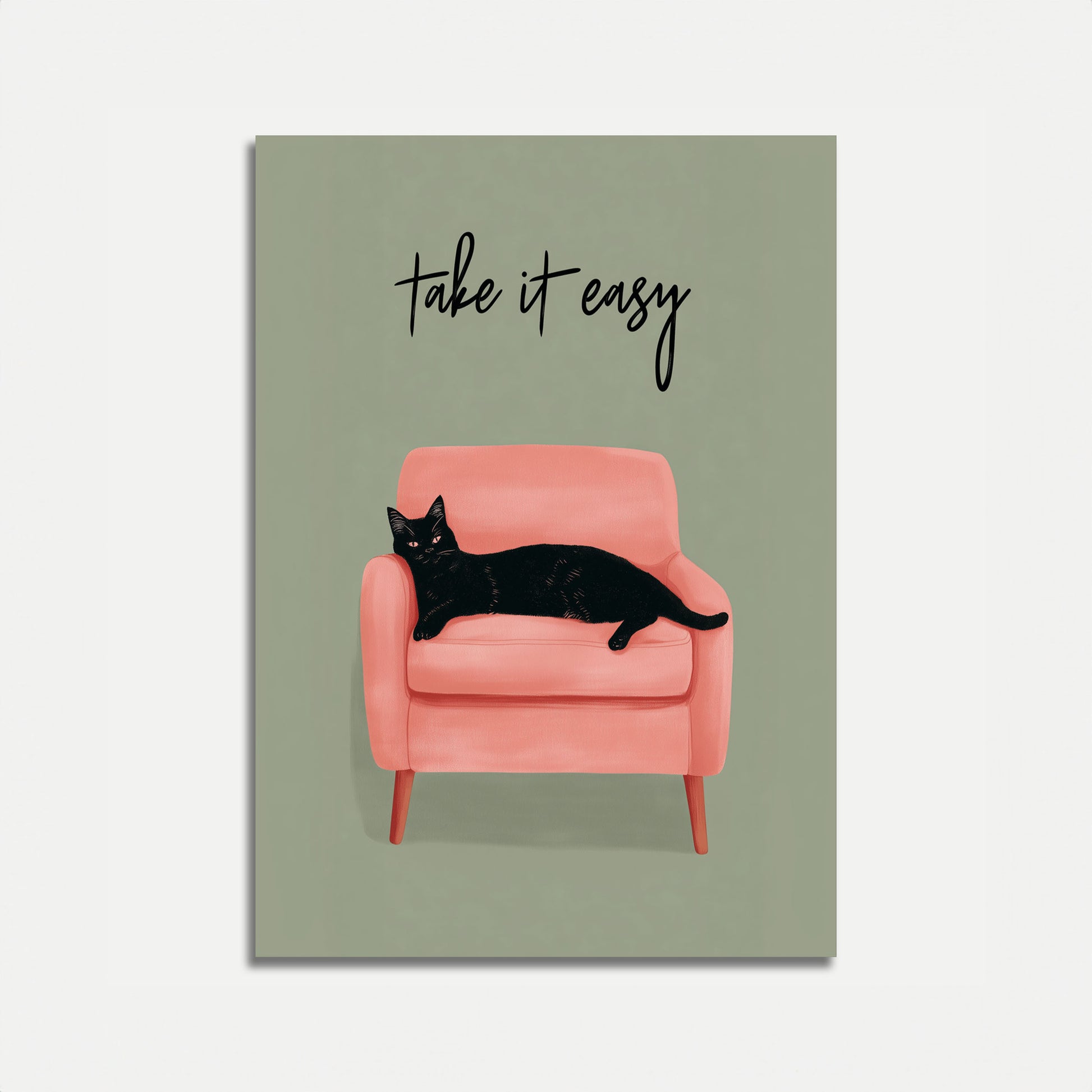Capture a essência do relaxamento puro com esta ilustração encantadora que apresenta um gato preto elegante descansando em uma poltrona coral-rosa suave. O design minimalista e o fundo verde-sage relaxante criam um ambiente sereno que o convida a 'relaxar' e abraçar um momento de calma. Perfeito para amantes de gatos e aqueles que buscam um toque de tranquilidade brincalhona em sua decoração.