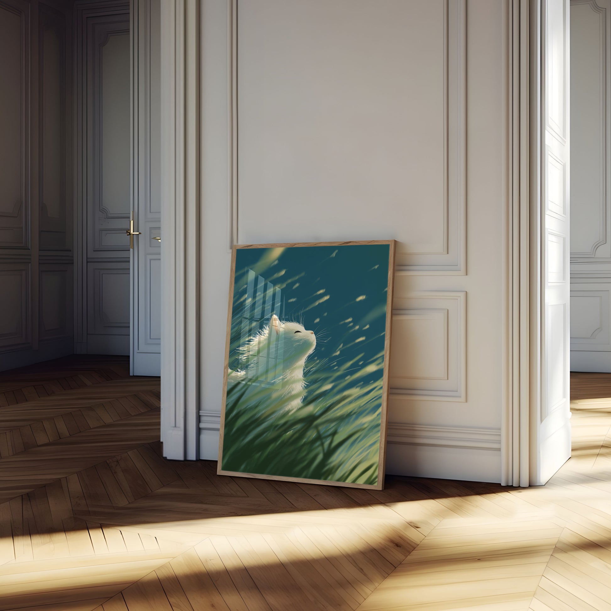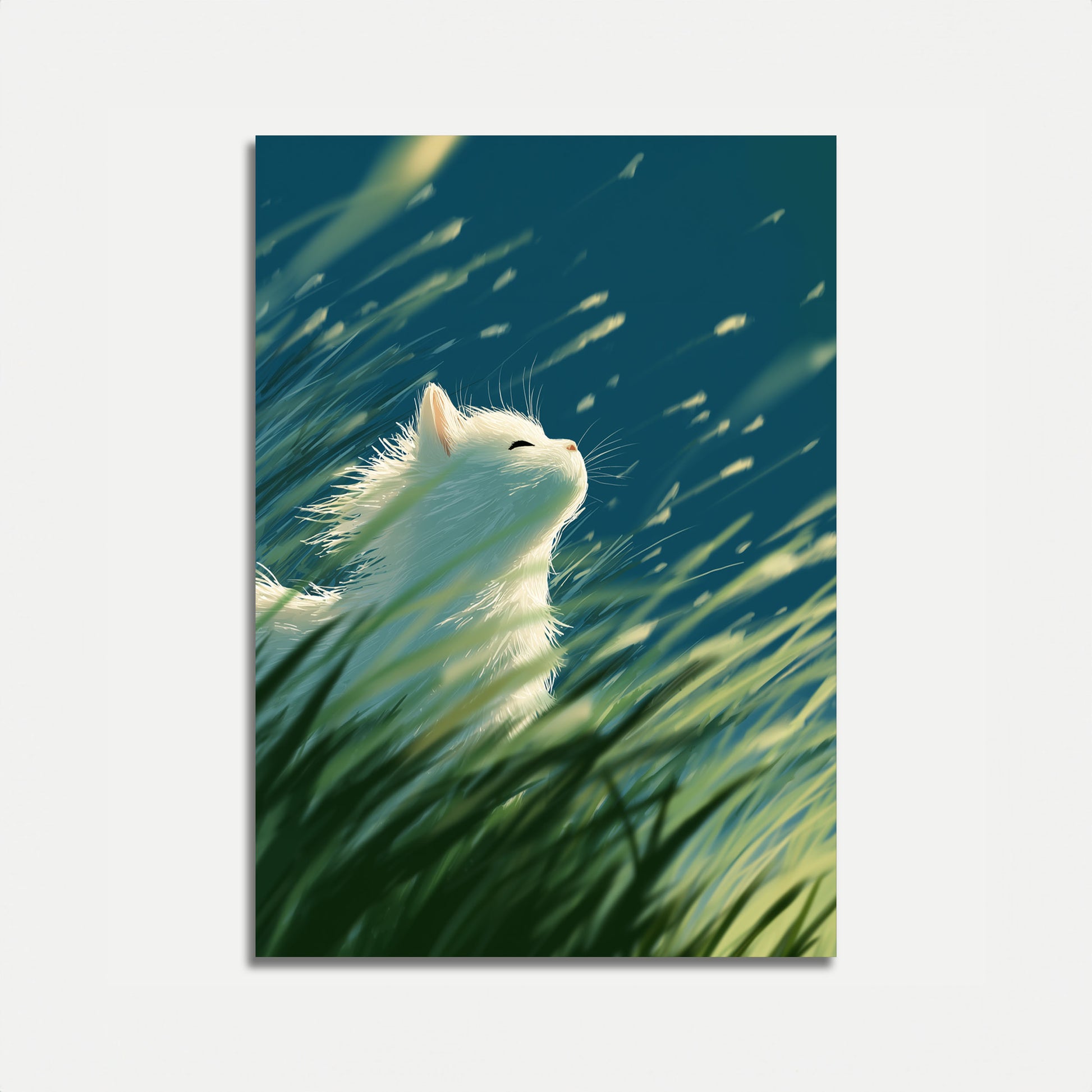 Uma delicada gata branca experimenta pura felicidade, olhos fechados e rosto inclinado para cima, rodeada por grama suavemente desfocada e um fundo verde-azulado onírico. A imagem captura um momento de conexão tranquila com a natureza, enquanto suaves correntes de vento acariciam o pelo felino com graça etérea.